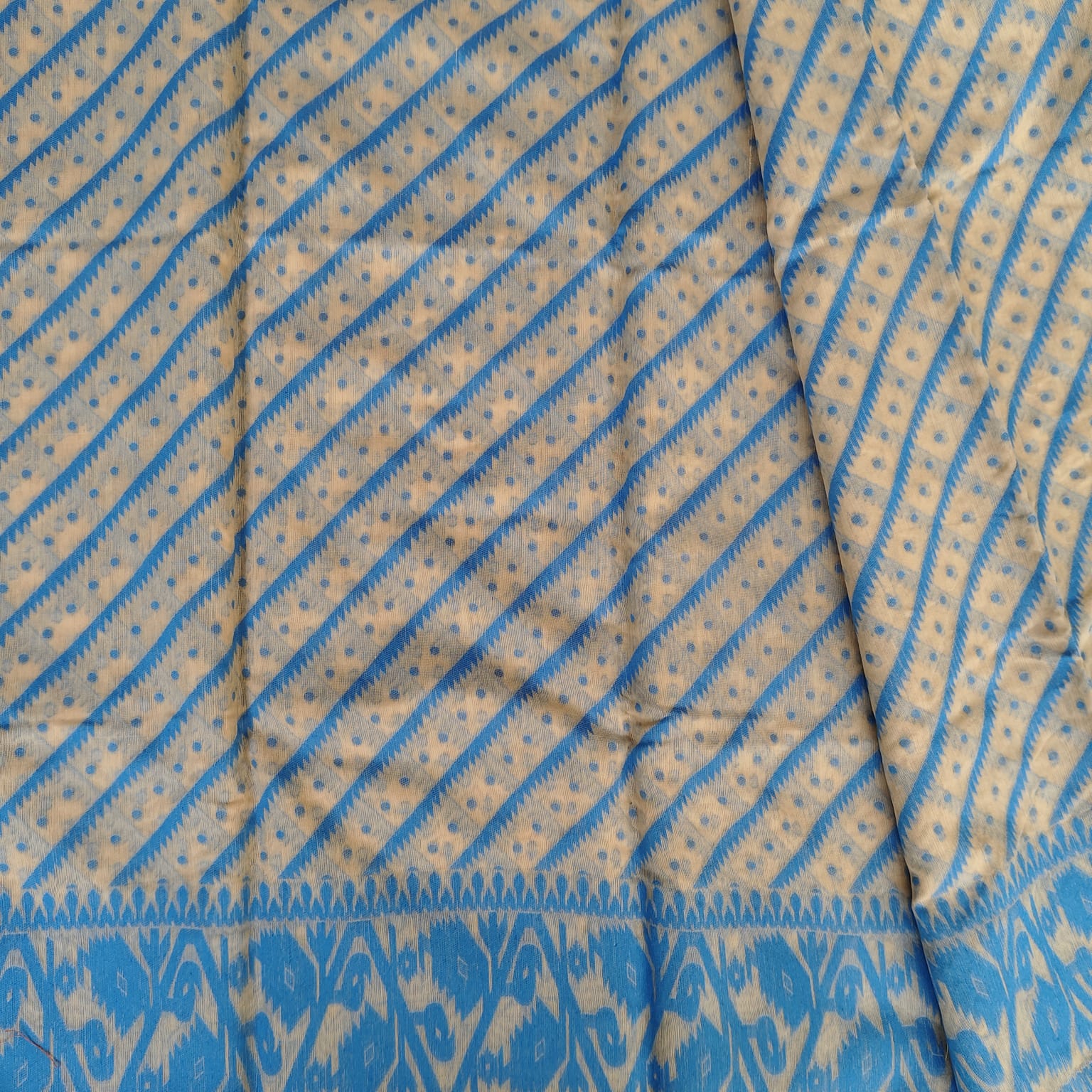 Gentle hand wash or dry clean recommended to preserve the delicate Jamdani weaving. Store in muslin cloth and avoid direct sunlight to maintain the soft beige and vibrant blue hues.