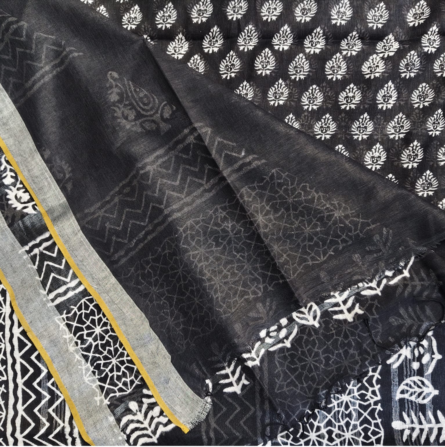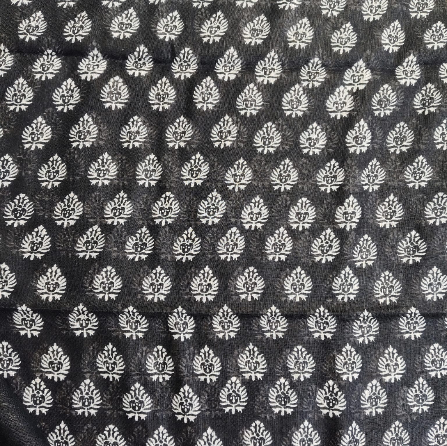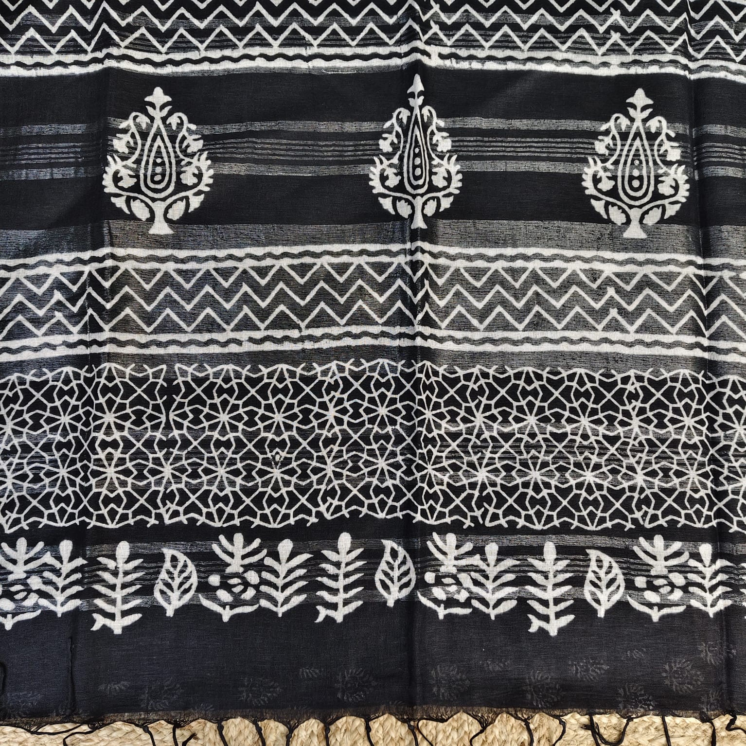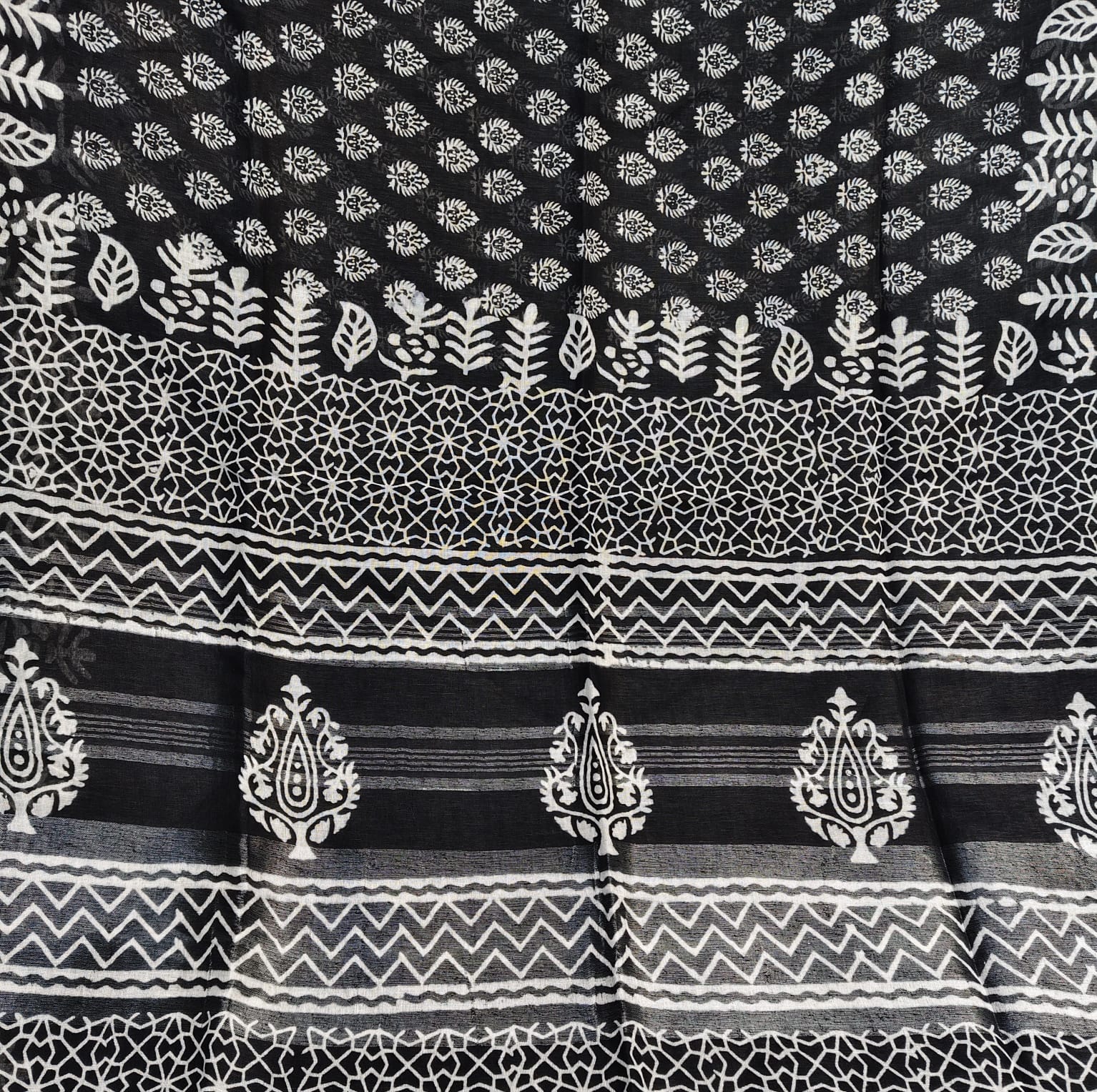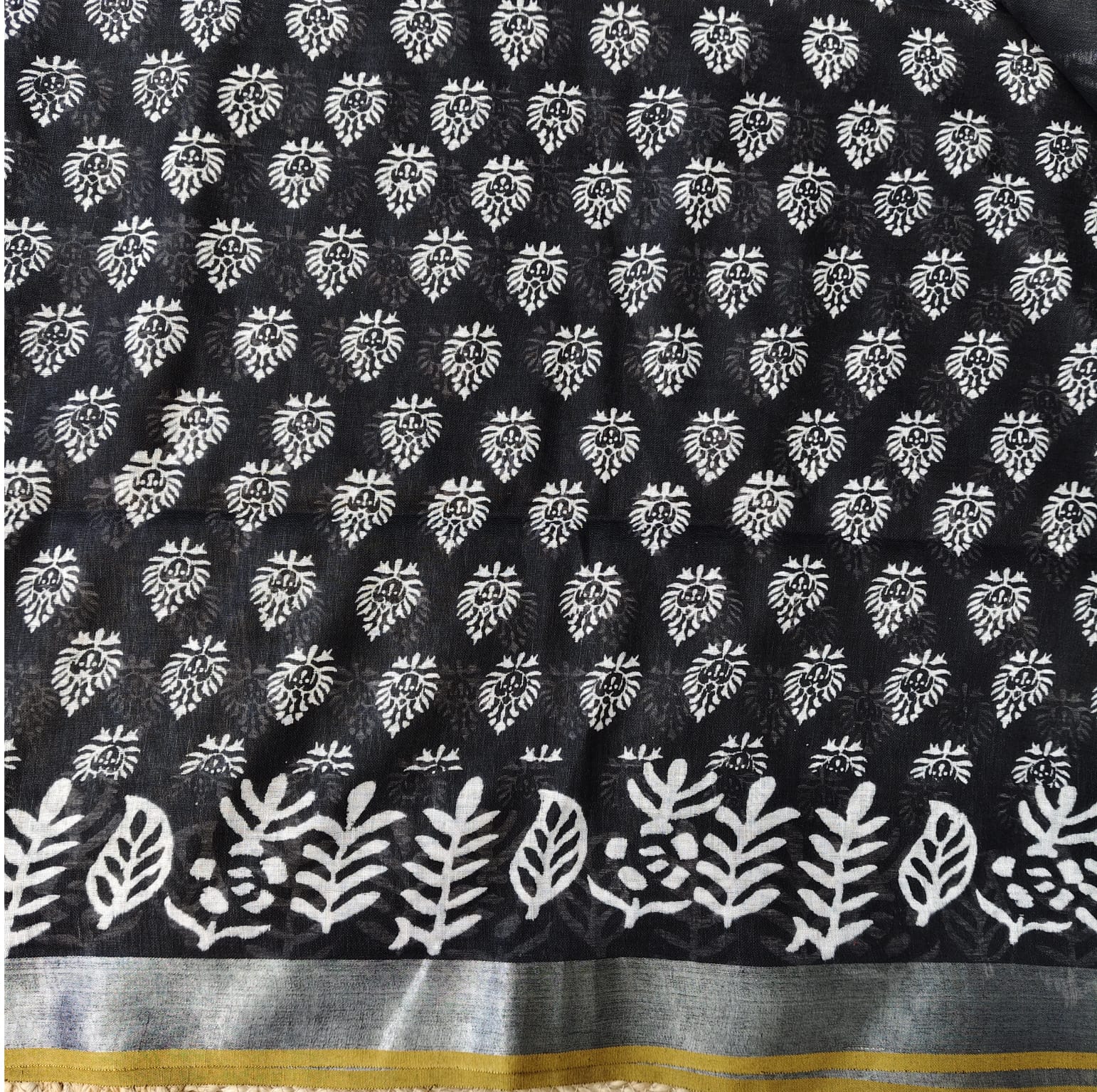 Black and white linen cotton saree featuring exquisite Dabu block prints all over the body. The handcrafted block patterns lend it a timeless, earthy charm, while the fabric’s soft and breathable texture makes it comfortable to wear throughout the day. The saree is highlighted with a silver border adding a subtle touch of sophistication to its classic appeal. -