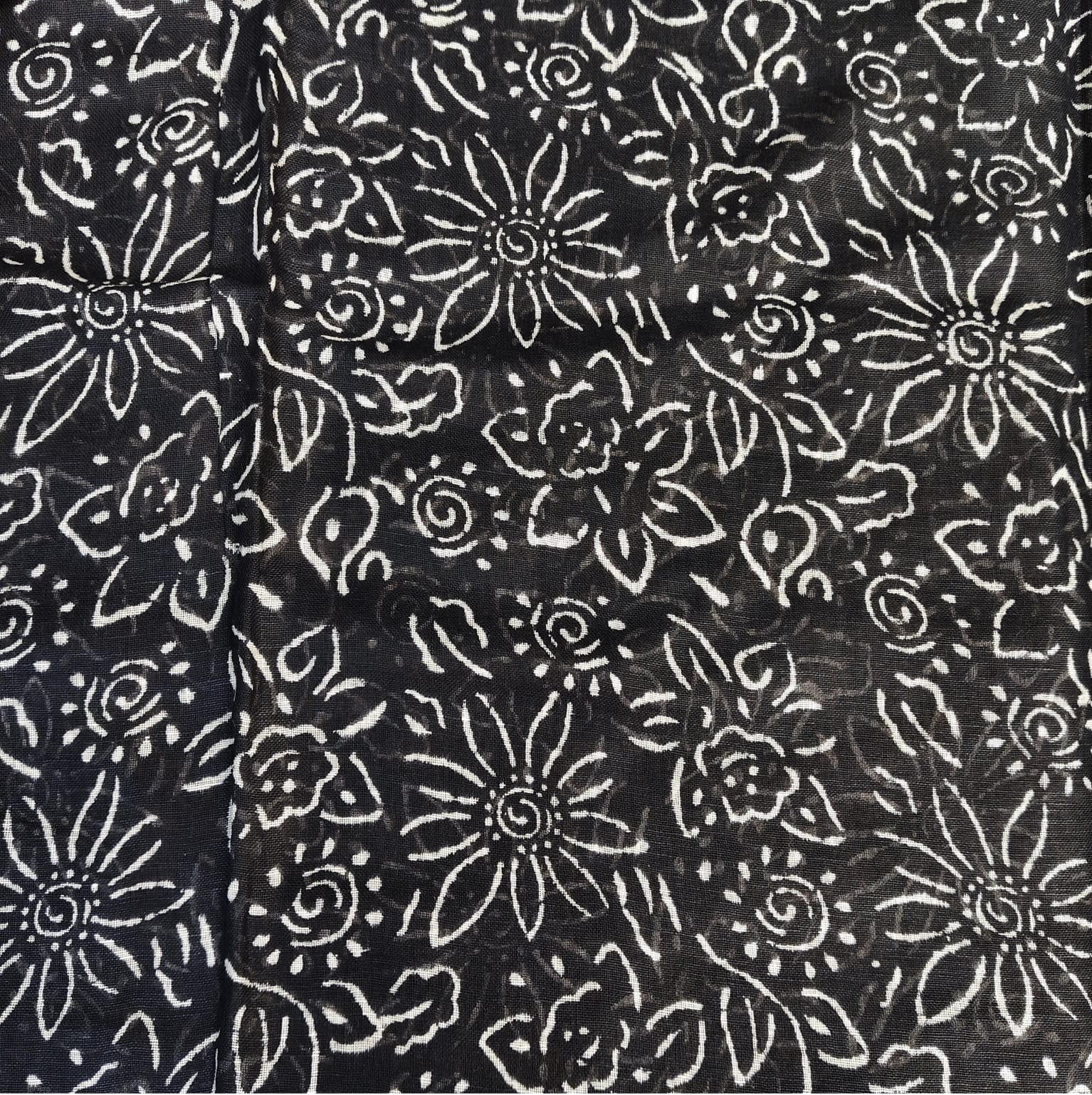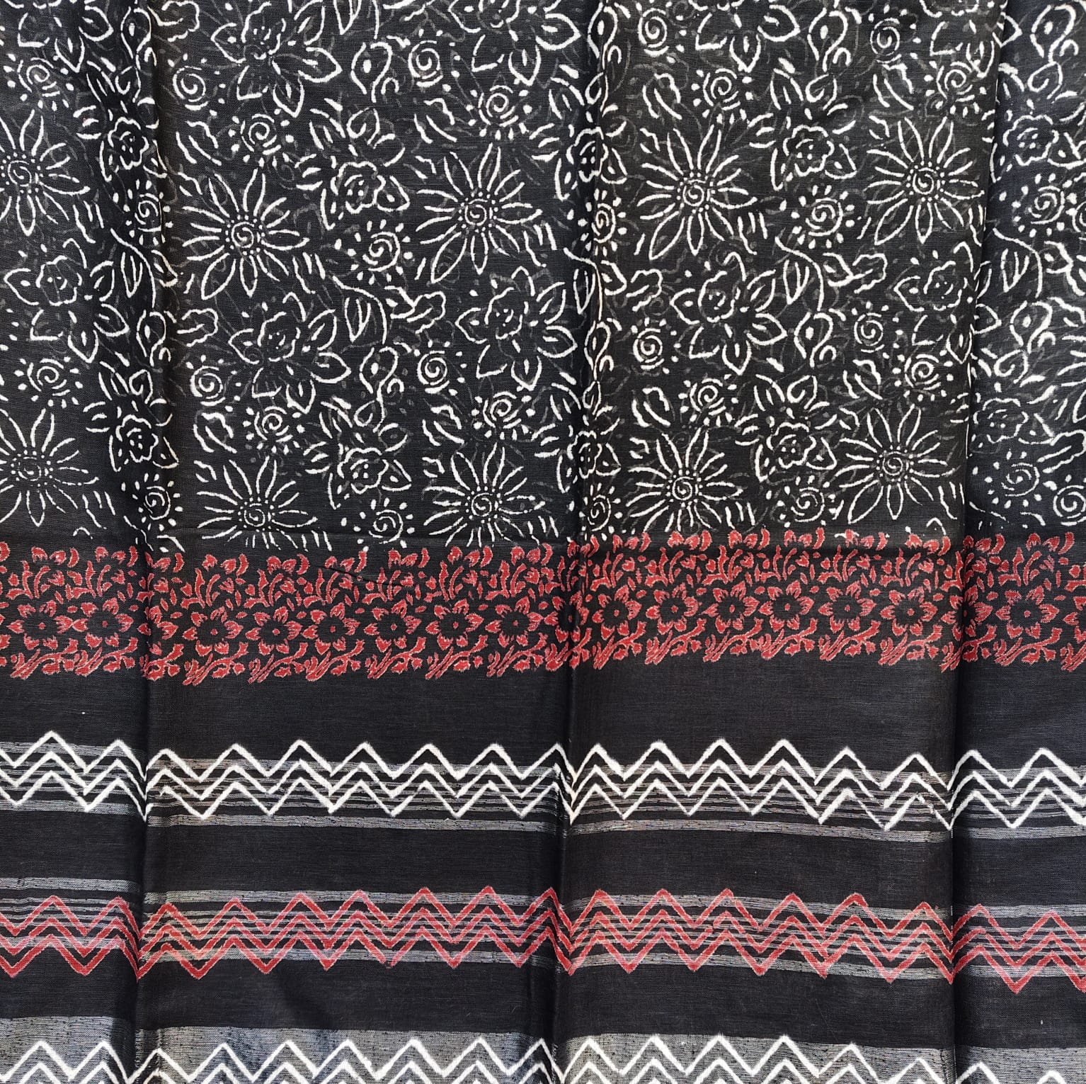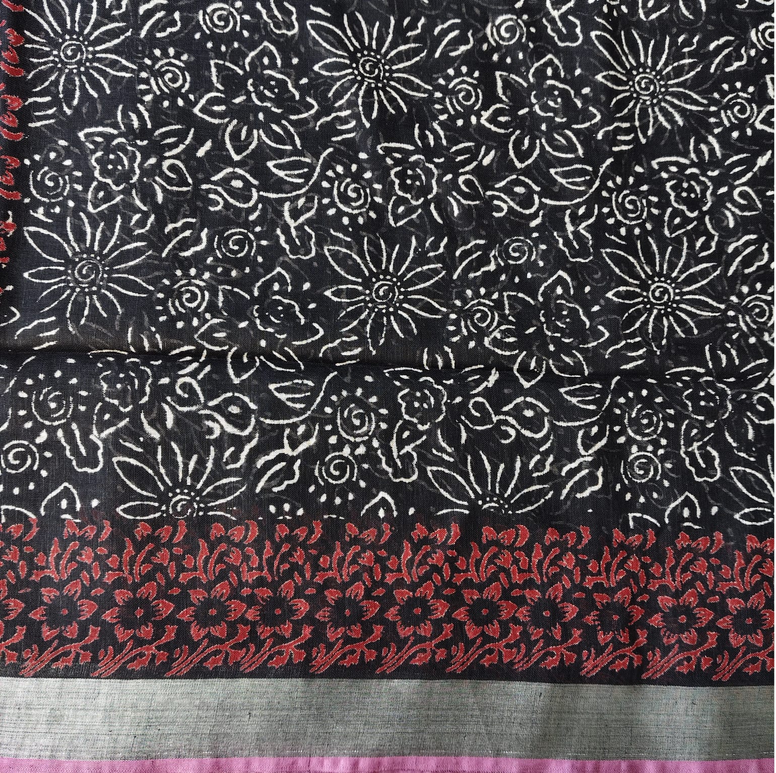 Black and white linen cotton saree featuring exquisite Dabu block prints all over the body. The handcrafted block patterns lend it a timeless, earthy charm, while the fabric’s soft and breathable texture makes it comfortable to wear throughout the day. The saree is highlighted with a silver border adding a subtle touch of sophistication to its classic appeal. -