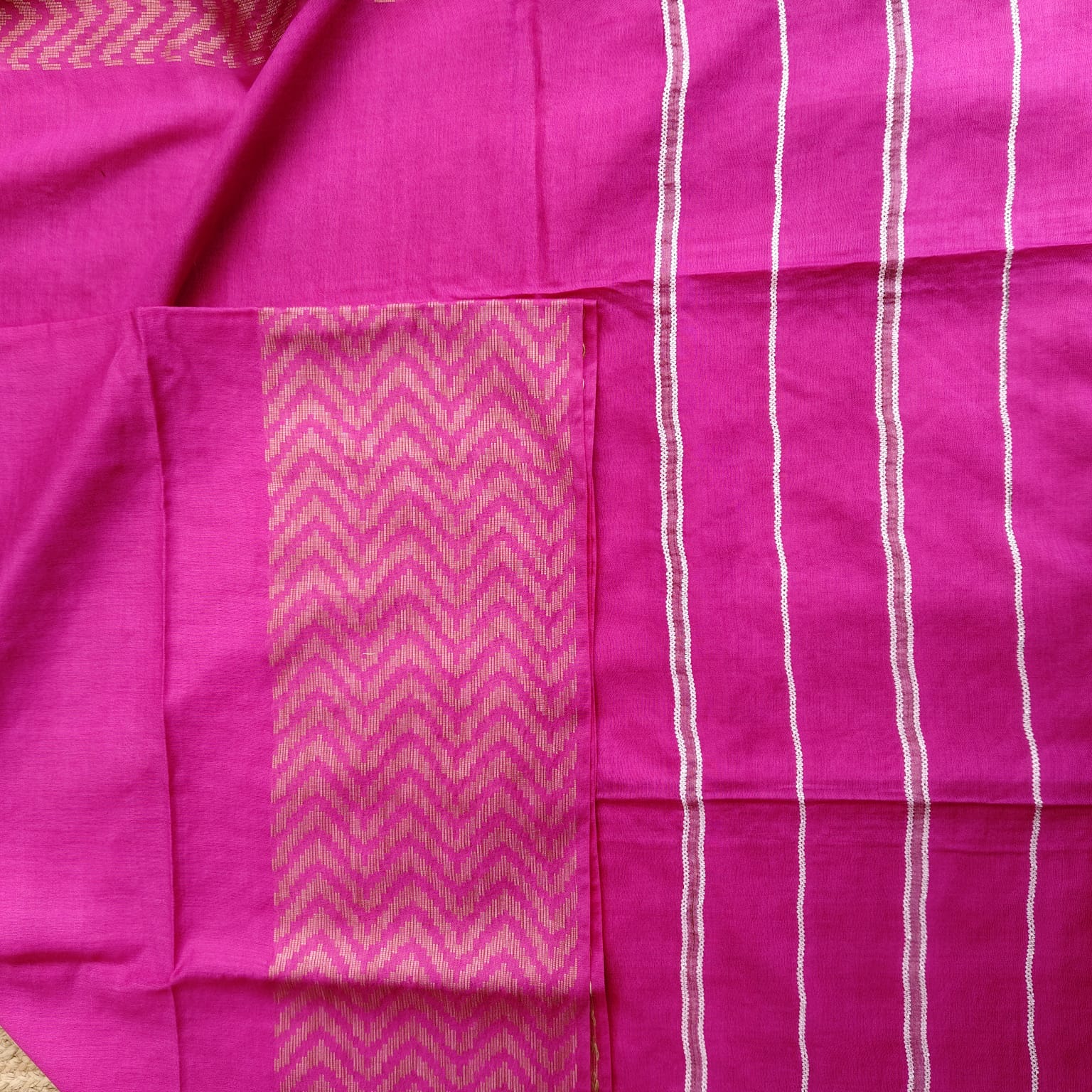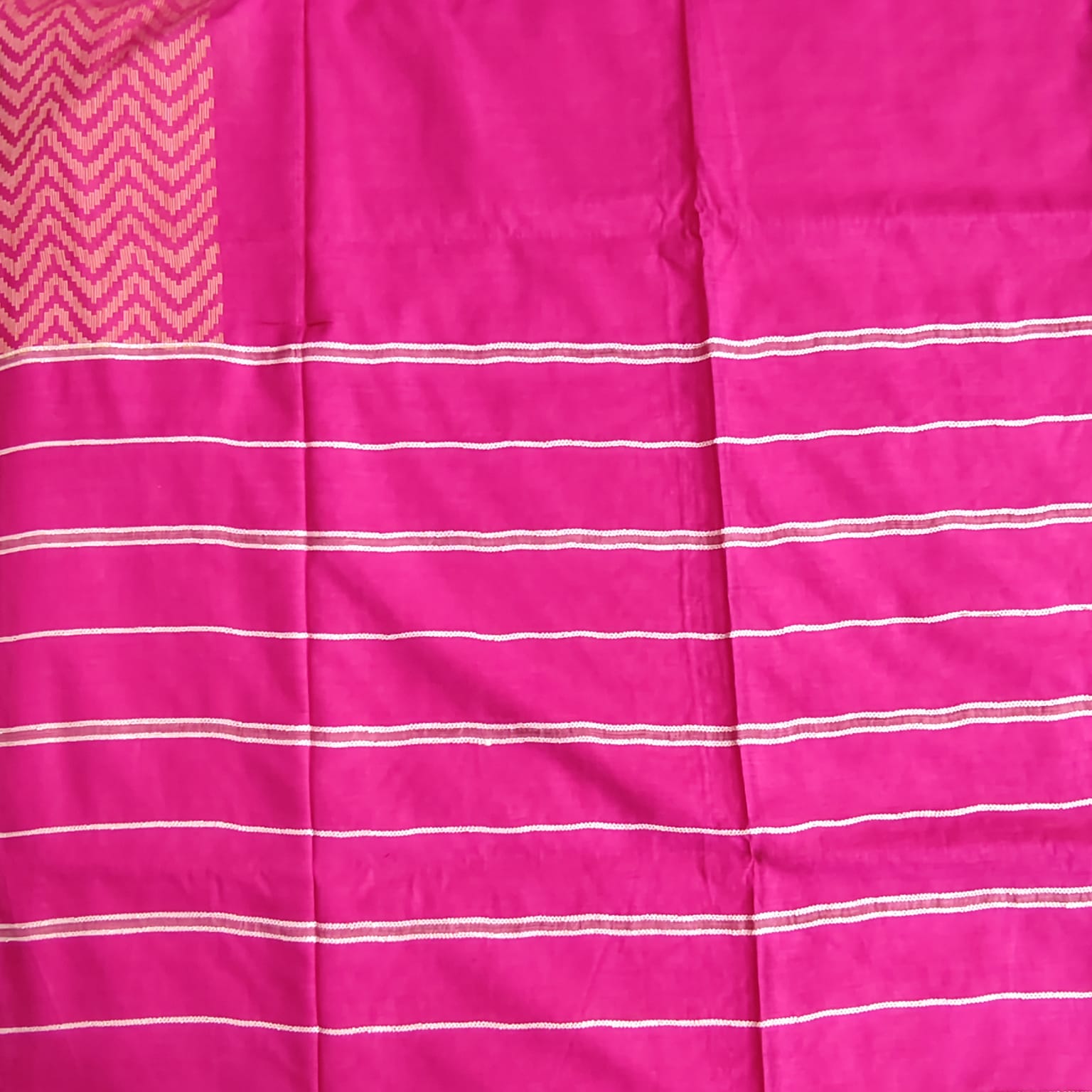 Fabric, Work & Design: A vibrant blended tussar silk saree in striking fuchsia pink, accentuated with jute-colored thread weaving along both borders—the lower one broader and the upper one slightly narrower for a graceful finish. The pallu carries subtle white thread-woven stripes, adding texture and charm. Its soft drape and natural sheen enhance its elegance. Includes an attached blouse piece.
