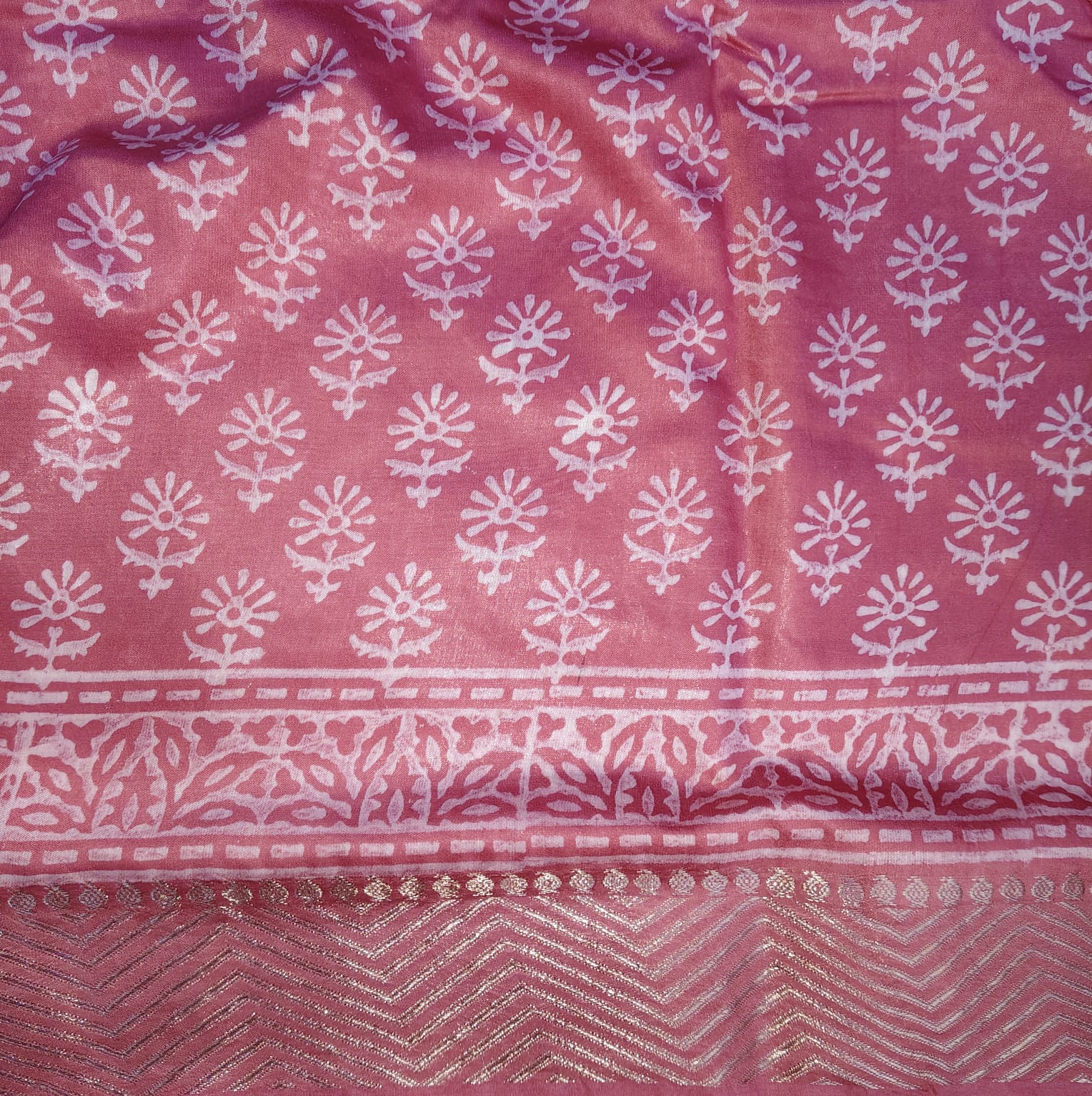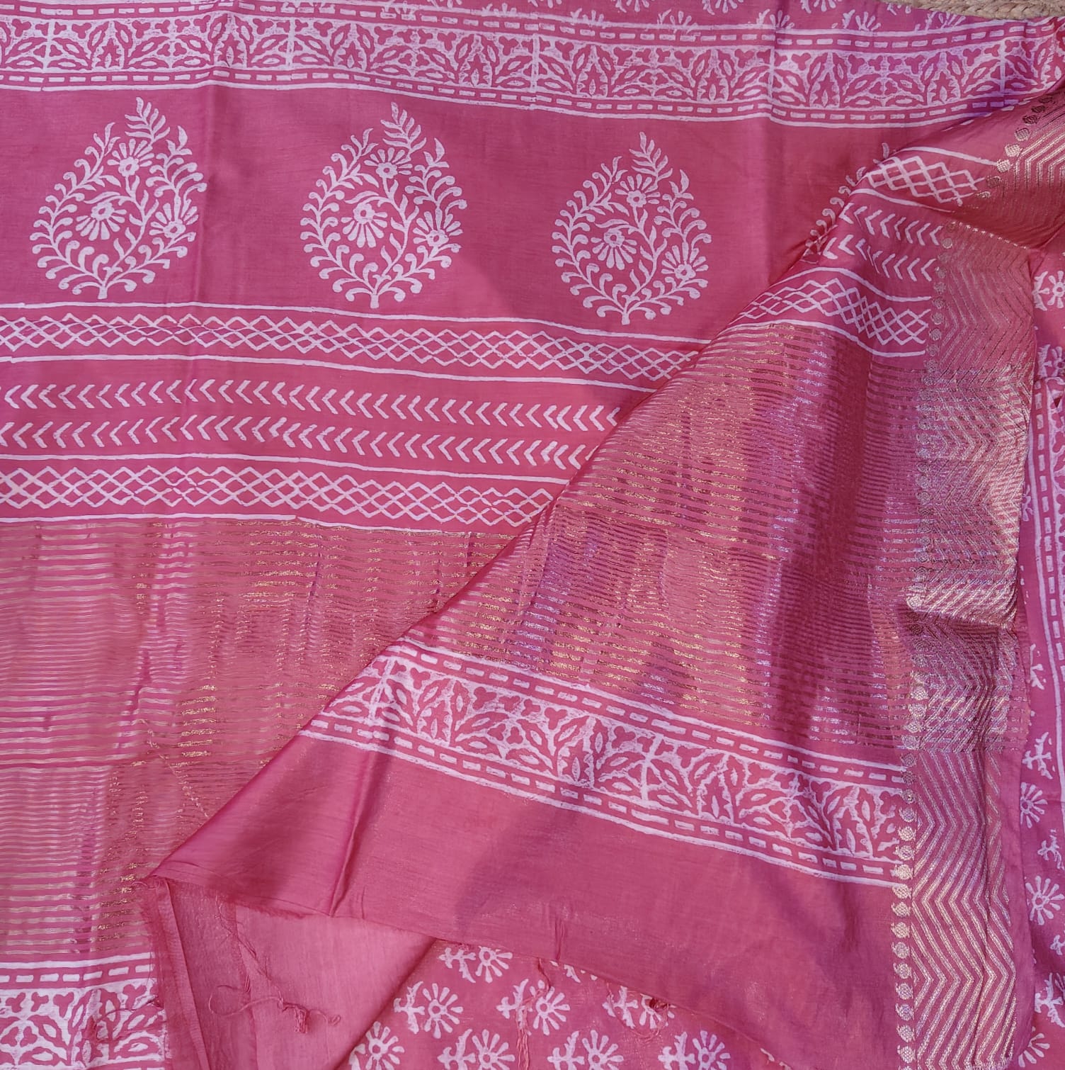 This exquisite saree is crafted from fine Bhagalpuri silk in a soothing powder pink hue. It features elegant block prints across the body, accentuated with shimmering zari stripes on the pallu. The border carries the signature Maheshwari zari weave, lending a refined traditional touch. The fabric’s soft yet textured finish makes it comfortable to drape and perfect for year-round wear.