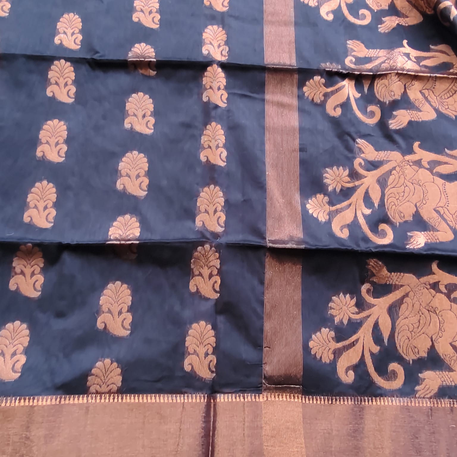 A handwoven Cotton Silk Banarasi Saree in an elegant navy blue shade. The saree features a heavy zari-woven border and anchal, with large, intricate motifs across the body, showcasing luxurious Banarasi craftsmanship. Its light, flowing fabric ensures comfort while maintaining a rich, regal appearance. -