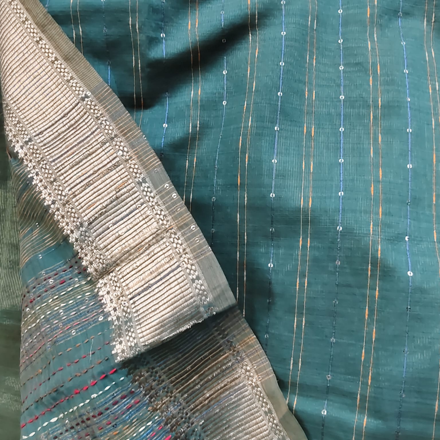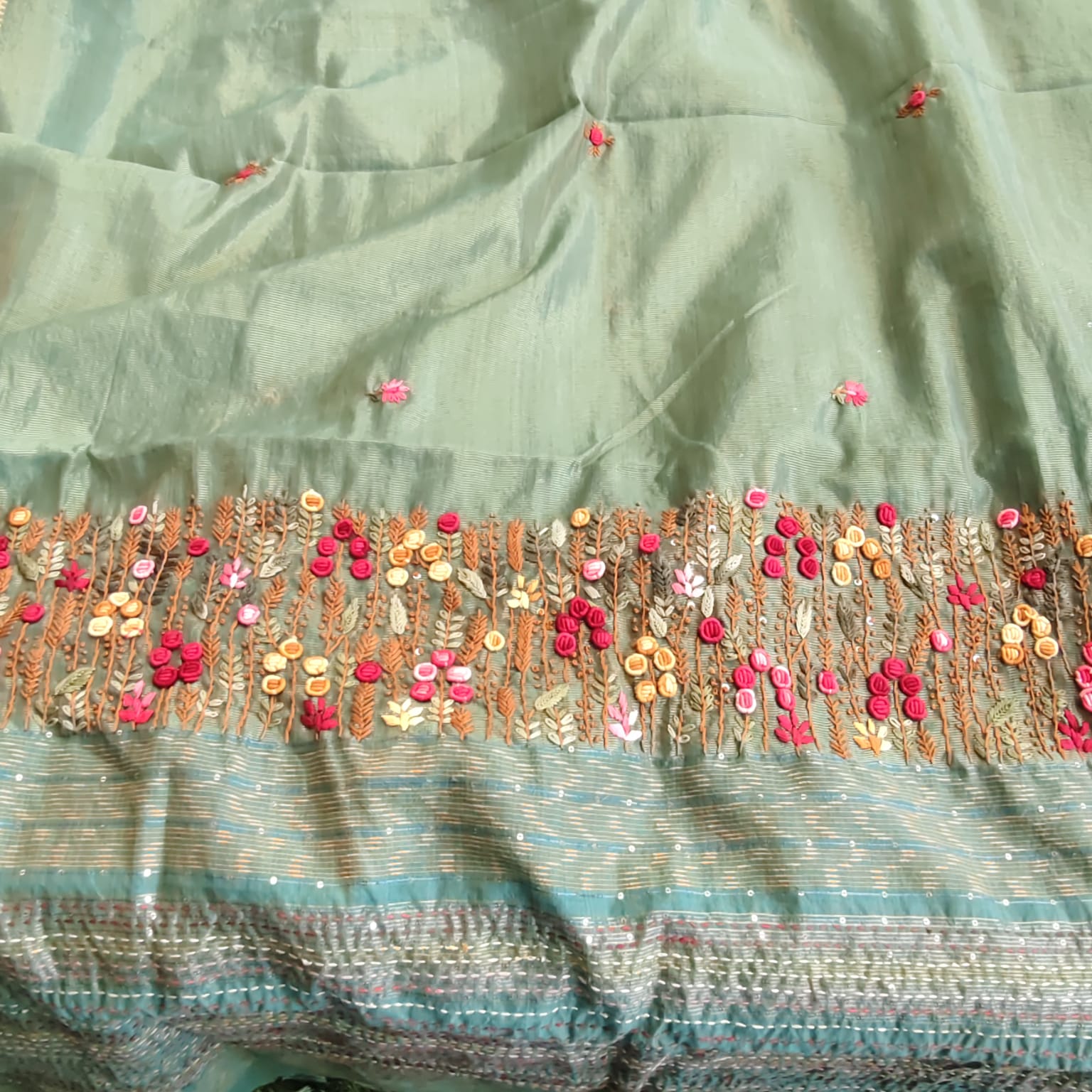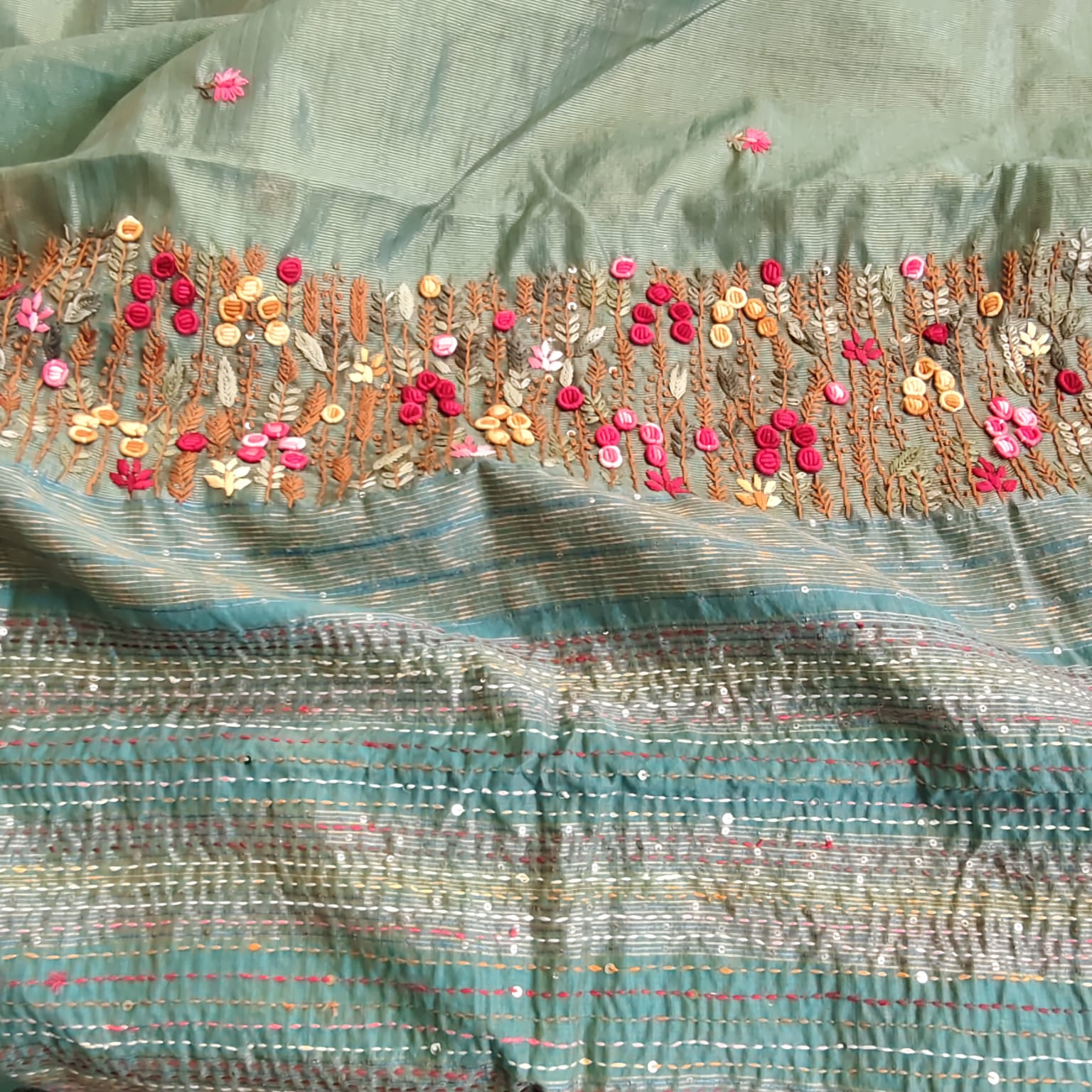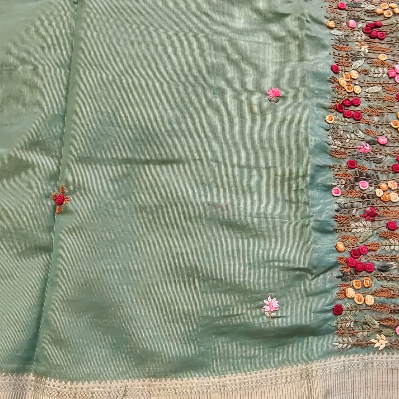 A luxurious Tissue Kota saree in a deep, rich green shade that exudes timeless sophistication. The saree is adorned with a classic Maheshwari border and features exquisite hand embroidery on the achal, intricately worked with katha stitch, bullion stitch, and knot work. Handcrafted motifs across the body and a solid cotton-silk blouse with delicate sequence weaving complete this masterpiece of elegance.