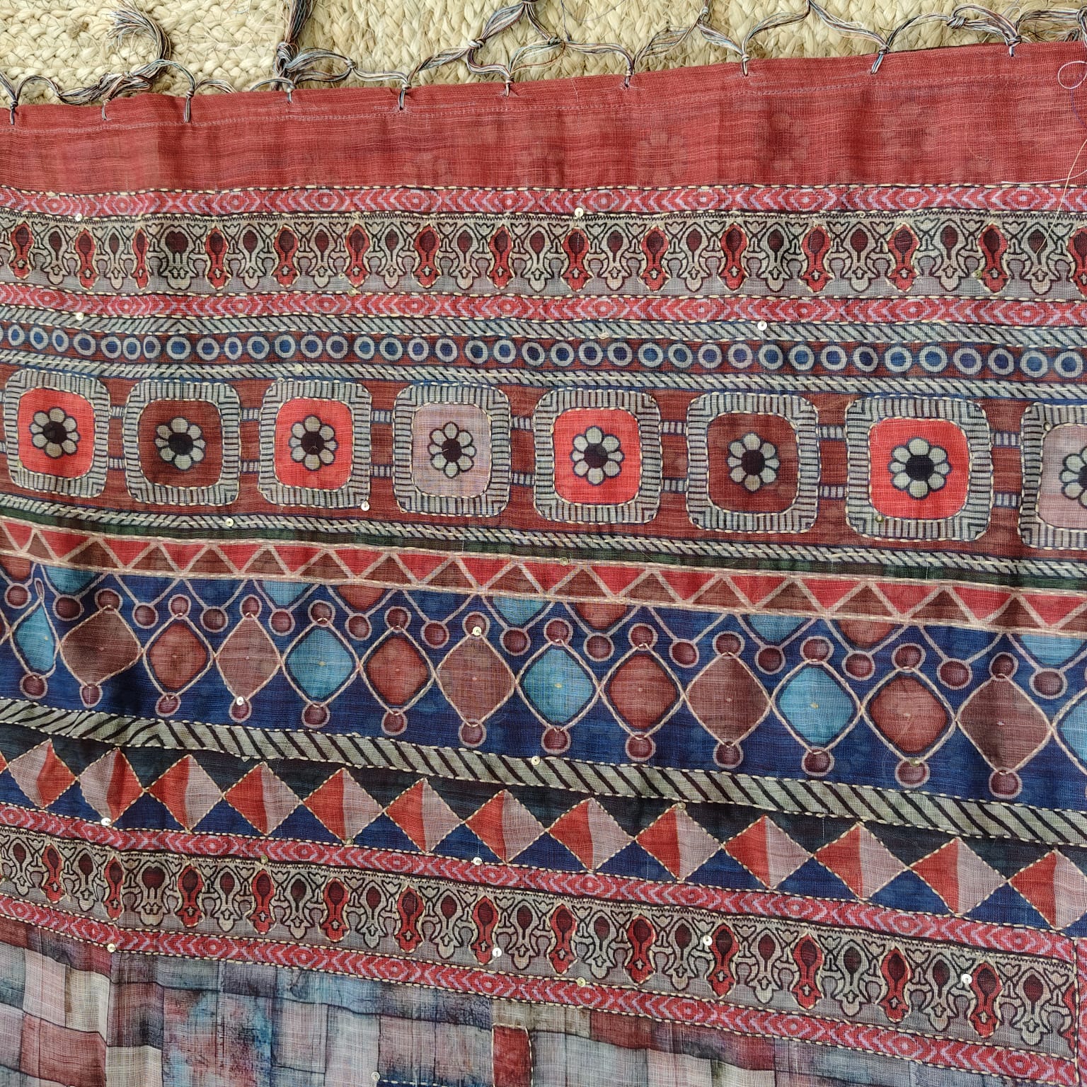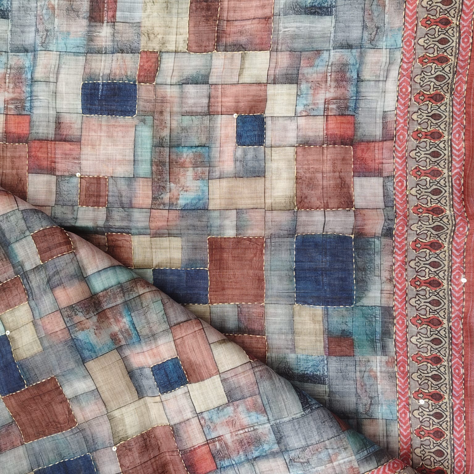 An elegant cotton linen saree in a soft beige base, adorned with vibrant multicolored digital geometric prints. The rich red border and anchal feature traditional Ajrakh-inspired motifs, further elevated with delicate hand katha embroidery and shimmering sequence highlights. The saree comes with a contrast red blouse piece, completing its refined and artistic appeal.