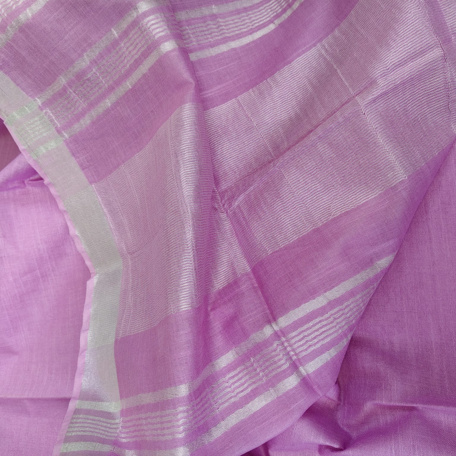 Fabric, Work & Design: Plain cotton-linen saree in a soft, breathable fabric, featuring a fully plain body enhanced with a subtle silver border and silver linings on the pallu. Lightweight and comfortable, perfect for effortless draping.