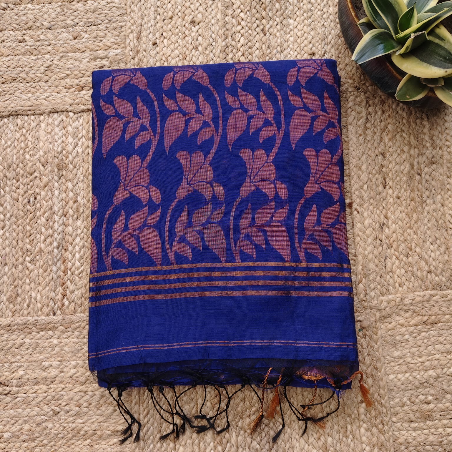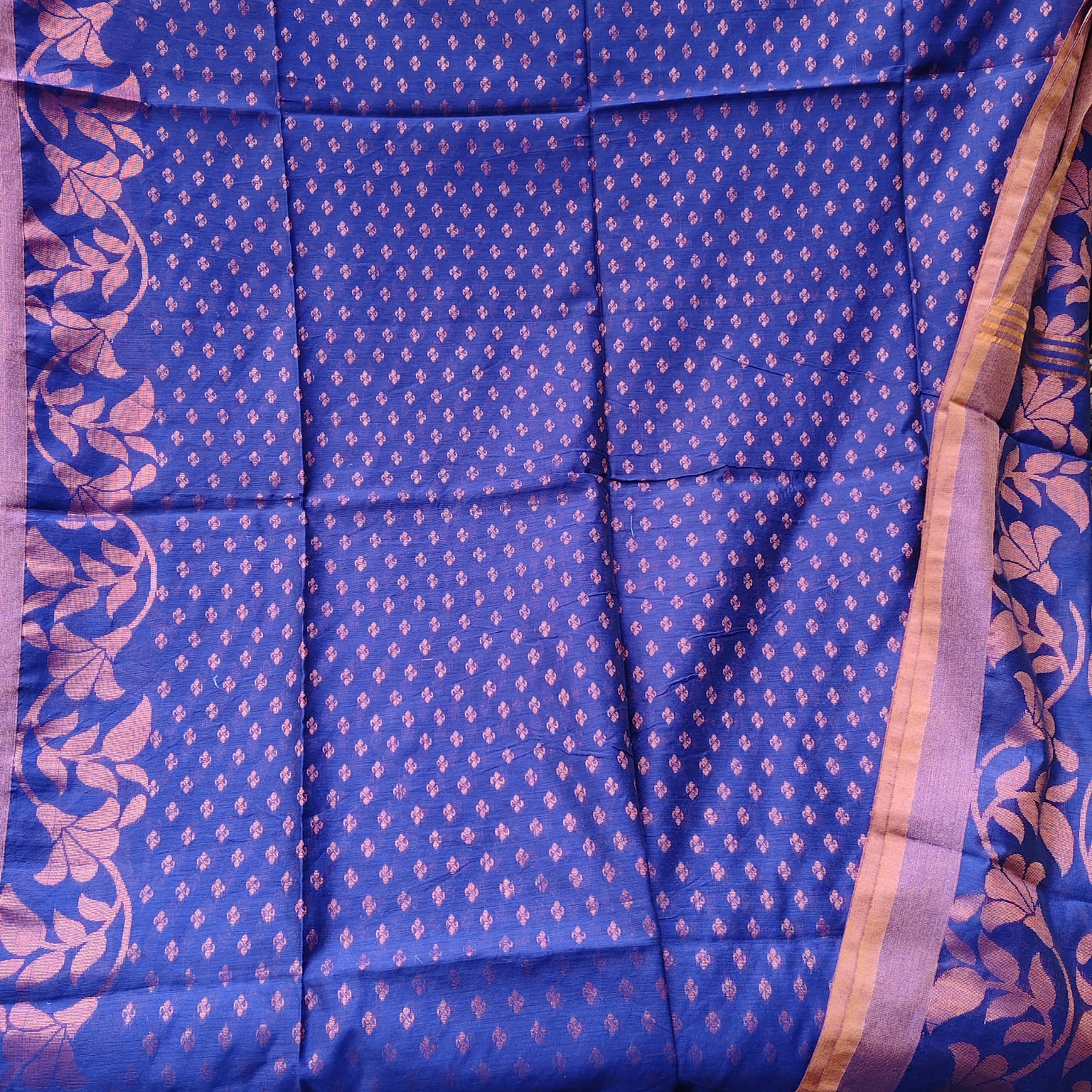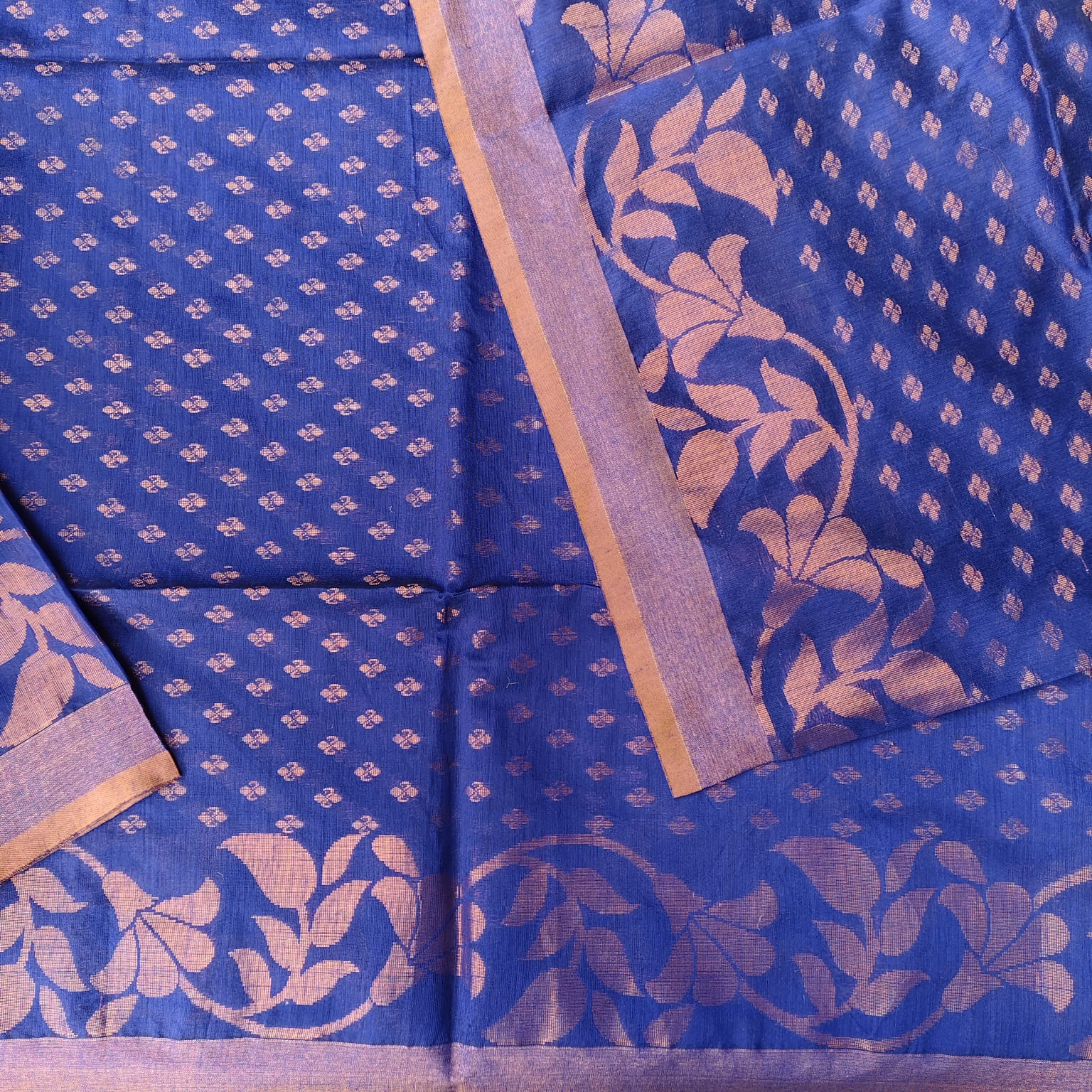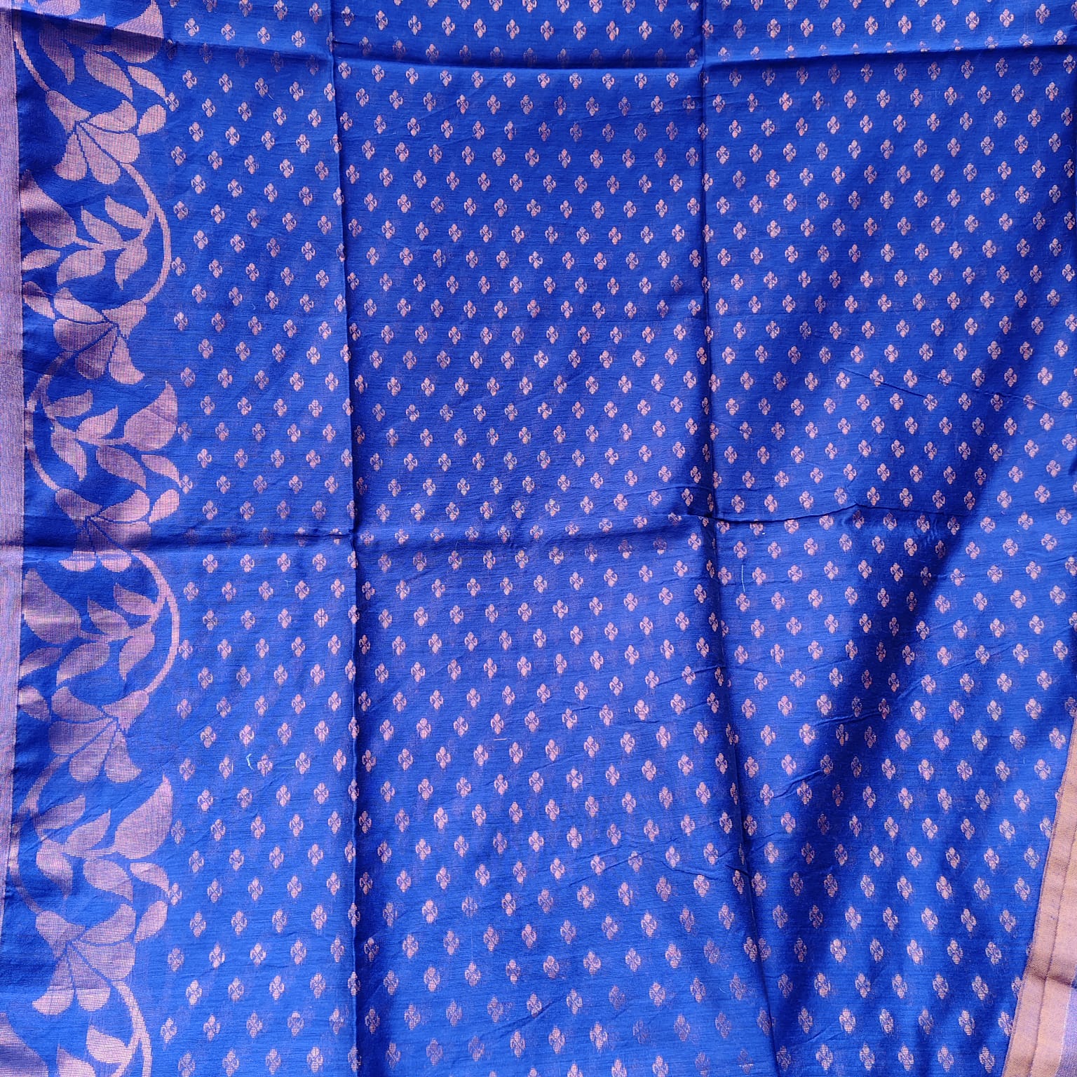 A handwoven Cotton Silk Banarasi Saree in a vibrant shade of Royal Blue. The saree features a heavy copper zari-woven border and anchal and butis across the body, highlighting the luxurious Banarasi craftsmanship. The light and flowing fabric ensures comfort while exuding a regal appeal. -