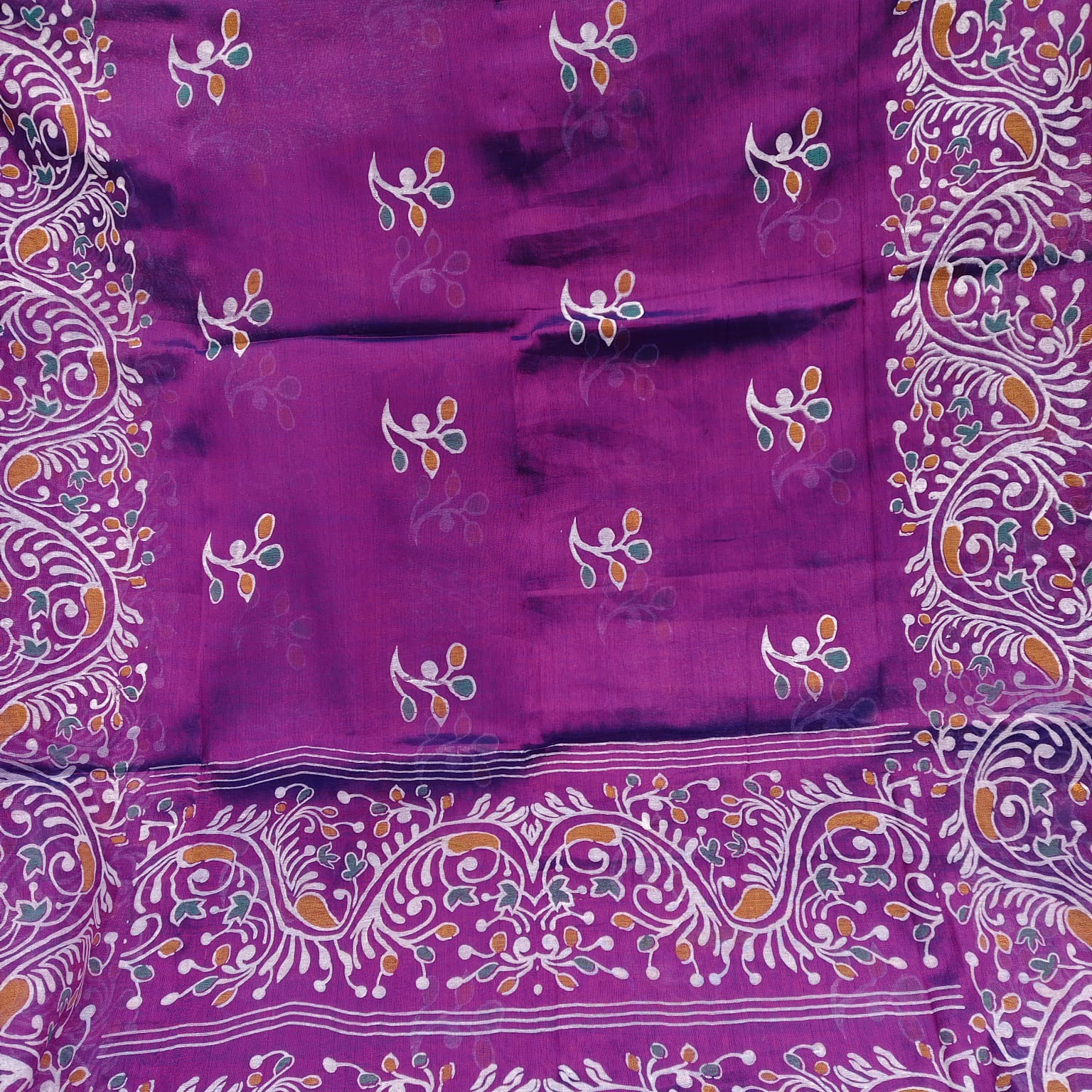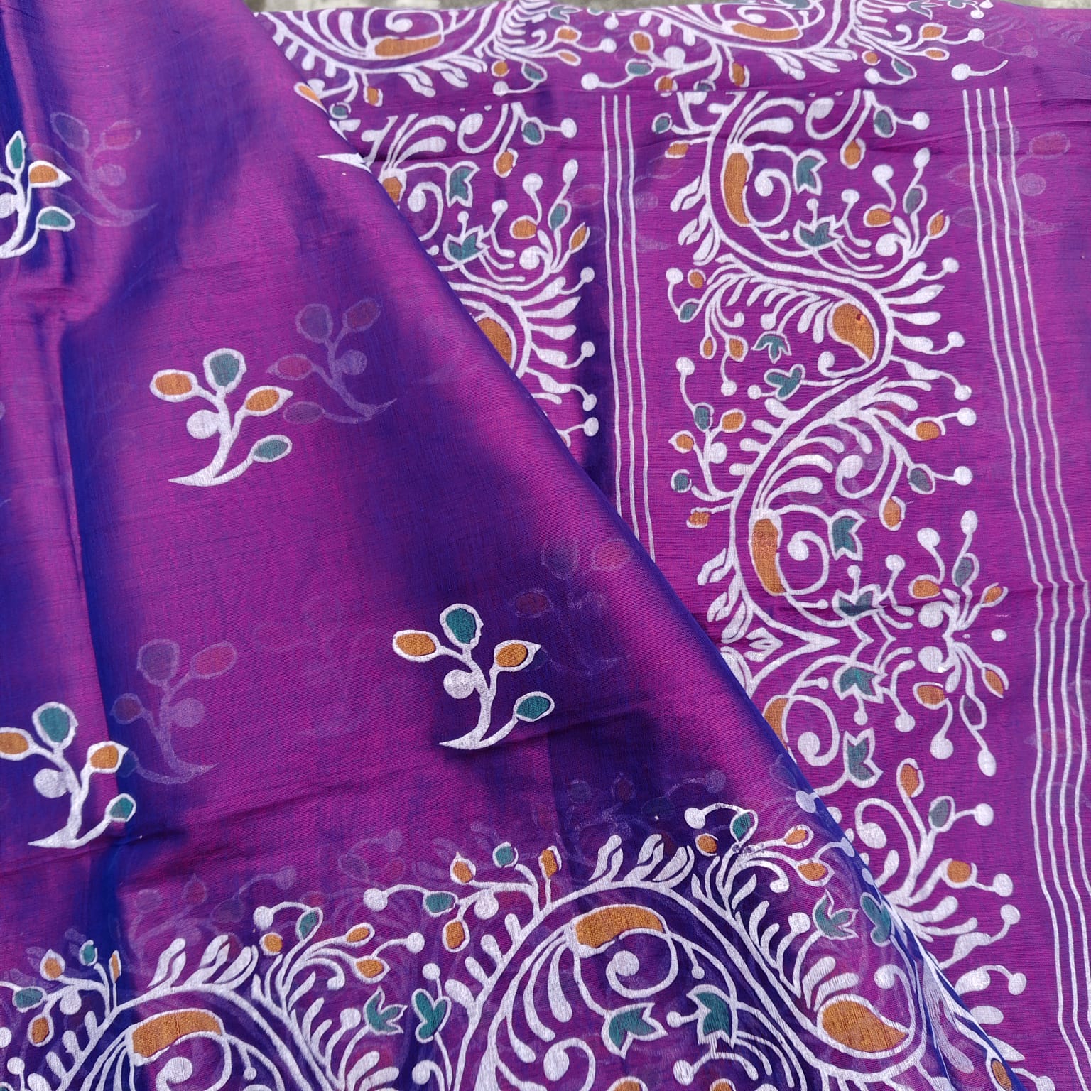 Unique cotton tissue saree in a bright purple shade, featuring traditional Alpana block printing done with fabric paint on a plain base. The intricate Alpana motifs add a strong cultural character, while the cotton tissue fabric lends a graceful sheen, soft shine, and rich texture. Lightweight and breathable, the saree drapes beautifully with an artisanal finish.