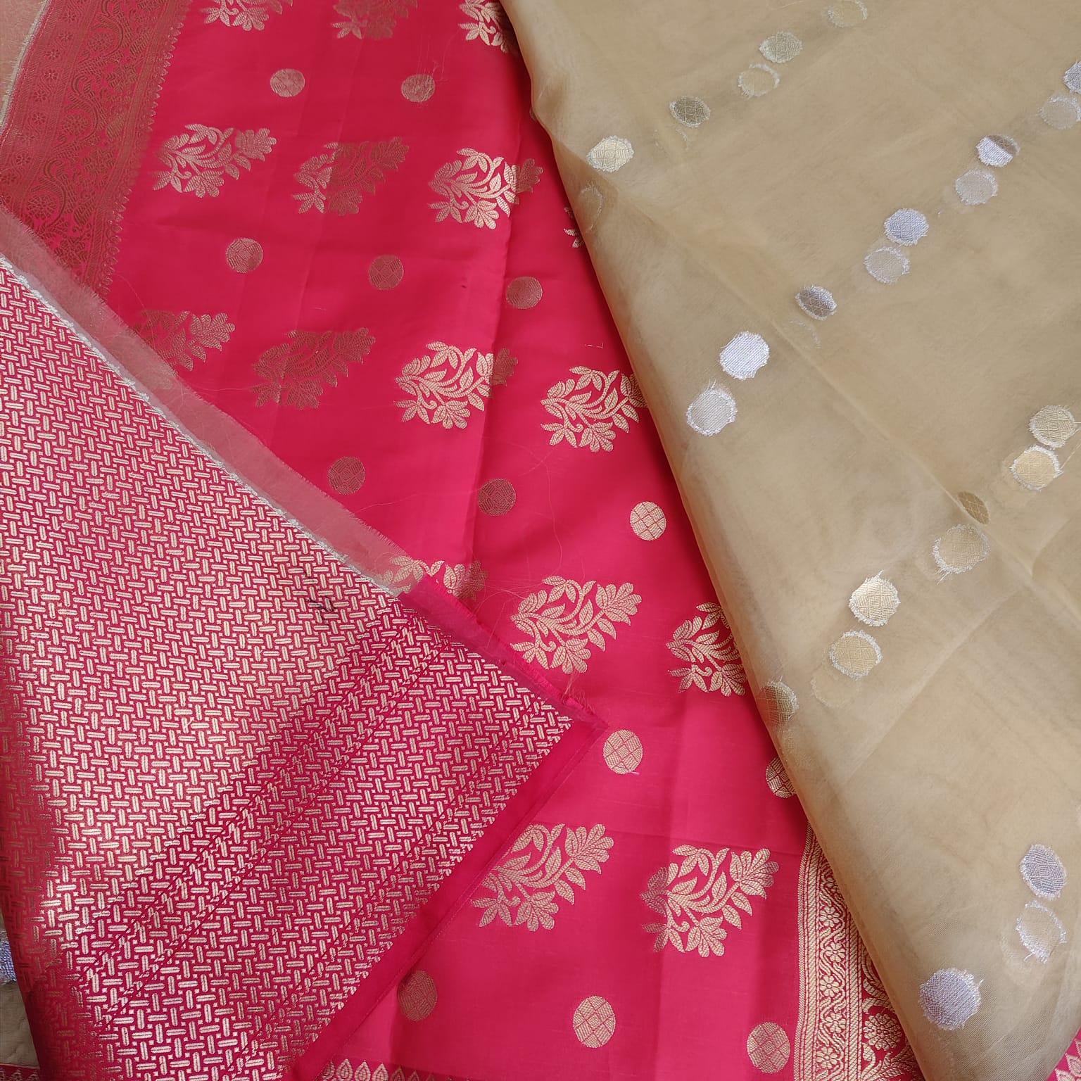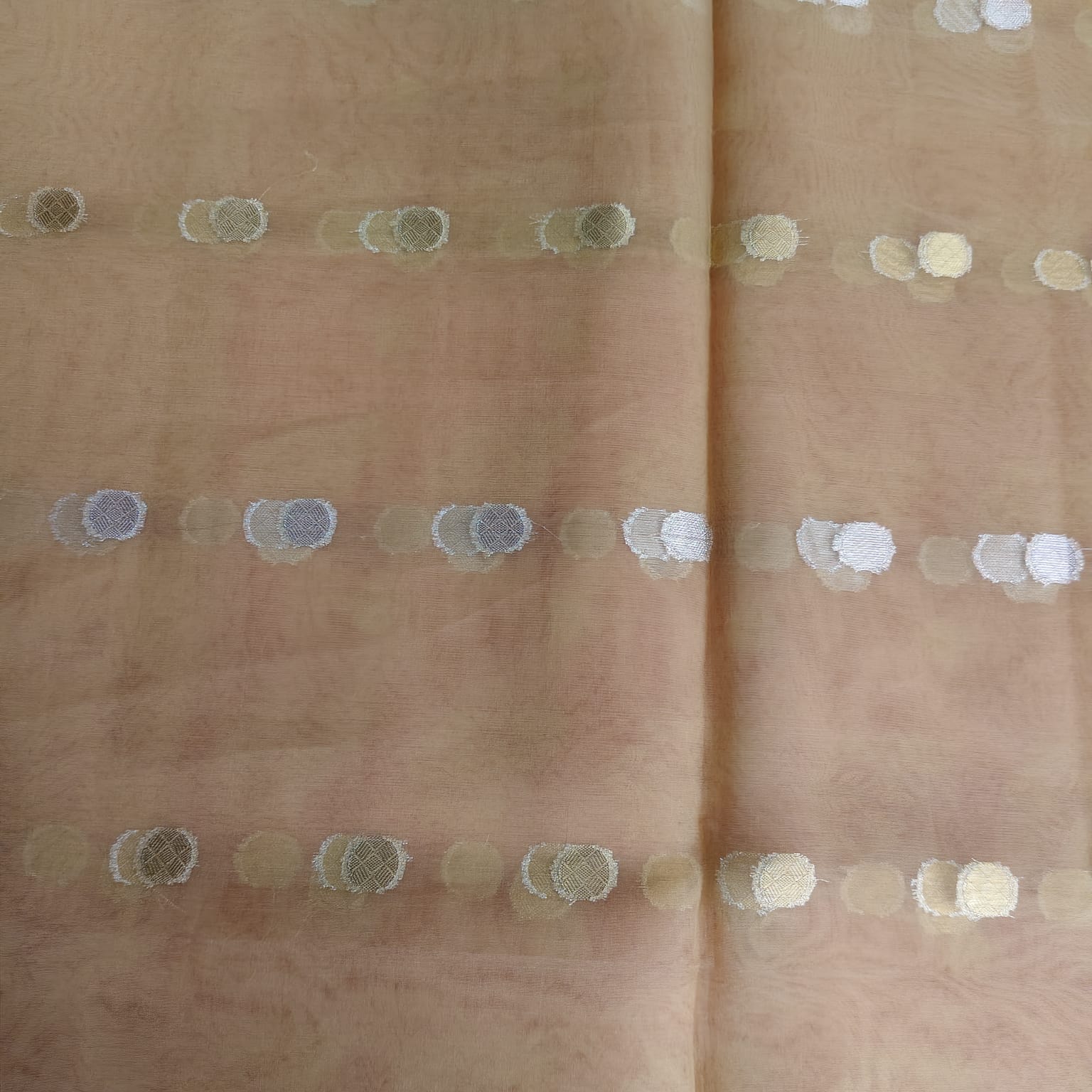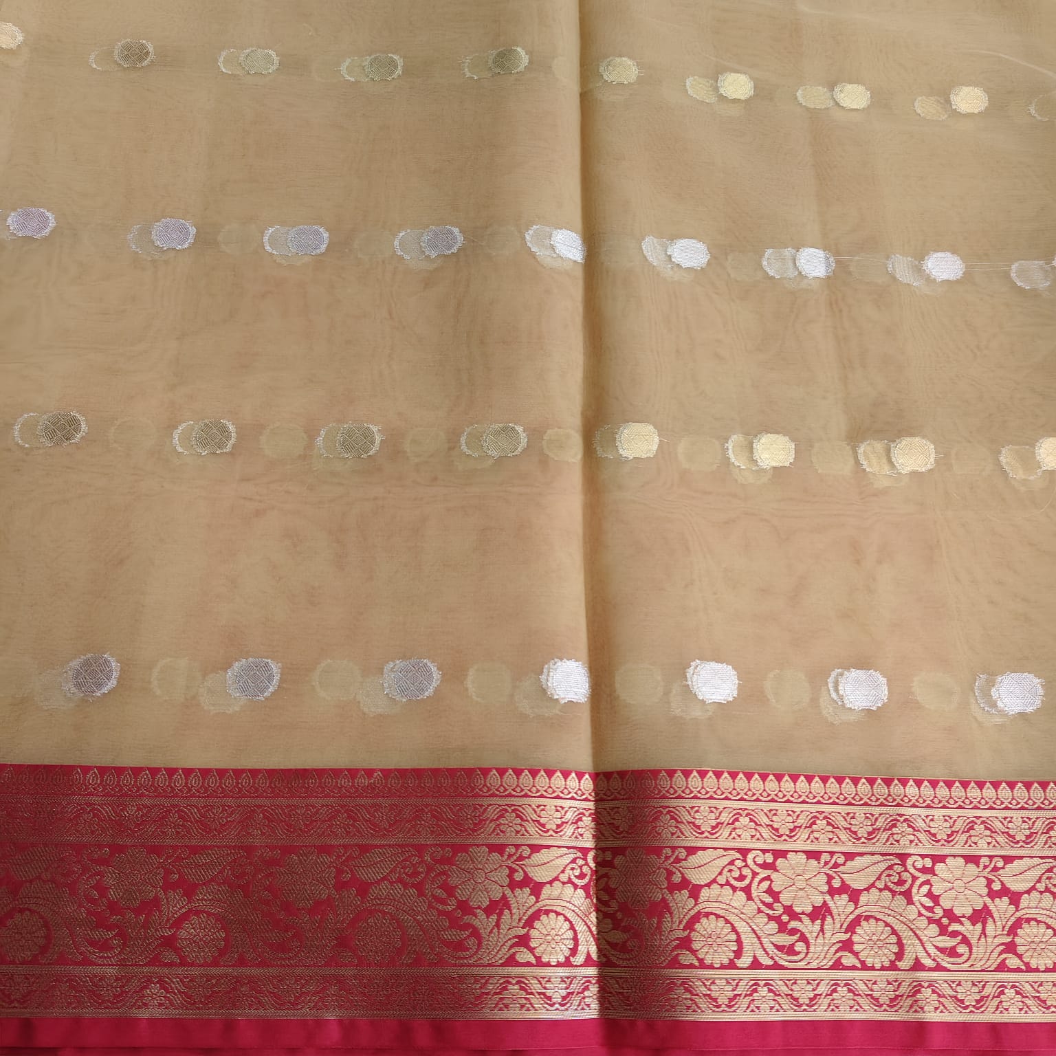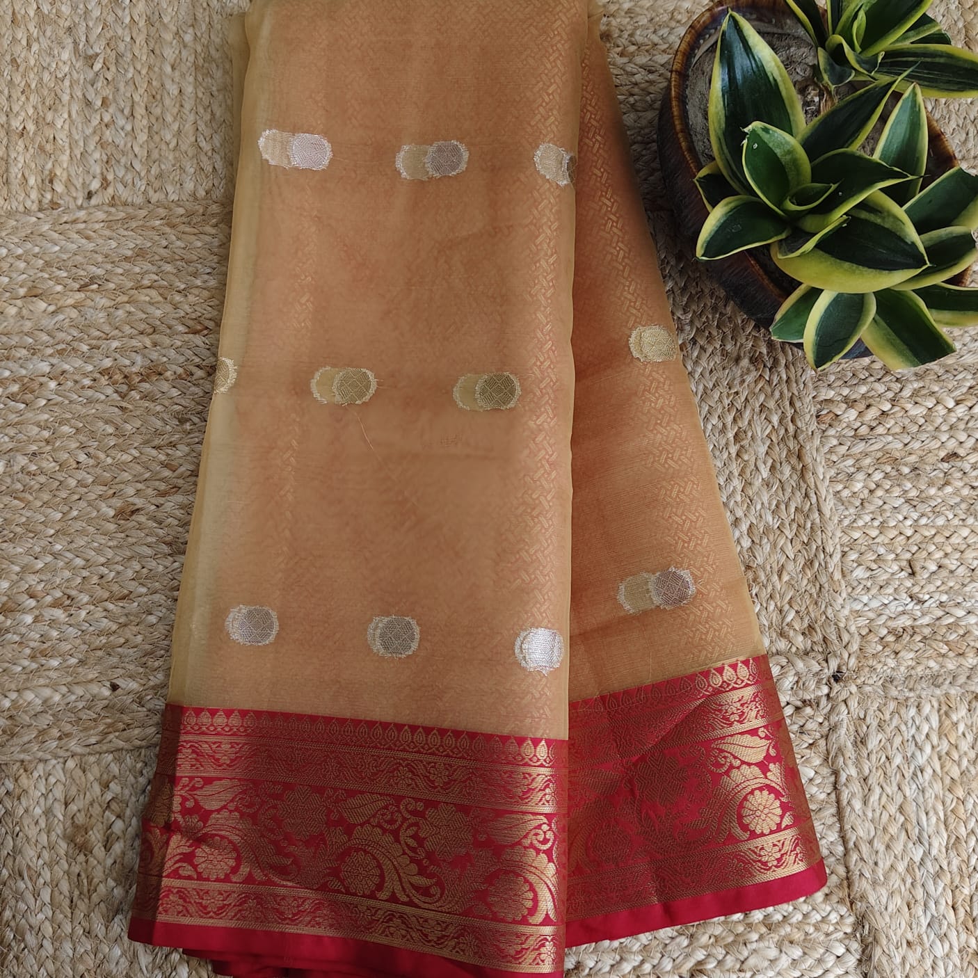 Dry clean only to maintain the delicate organza fabric and zari weaving. Store in a muslin cloth and keep away from direct sunlight to preserve its golden sheen.