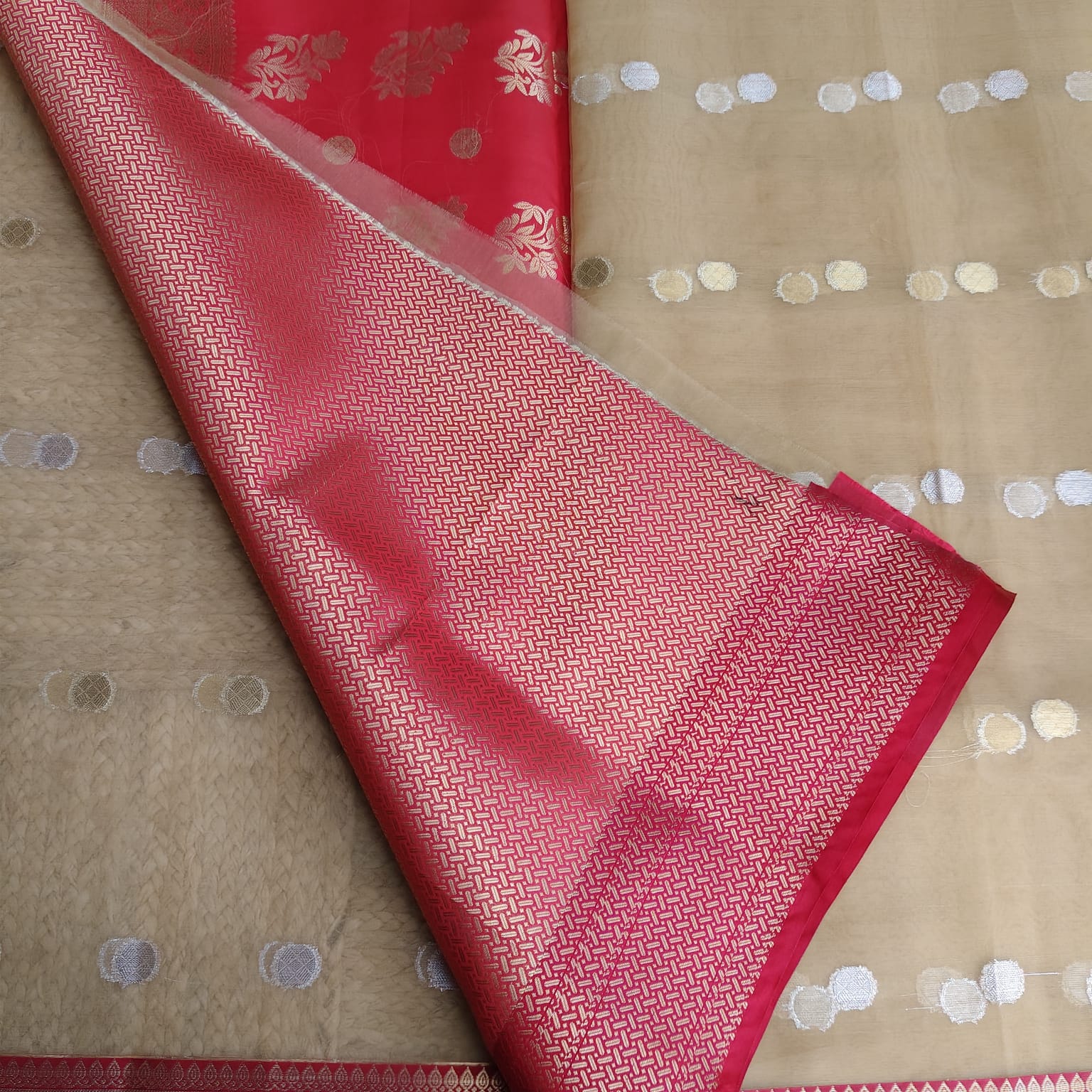 This golden muslin organza Banarasi saree features a striking contrast pallu and border in rich red, intricately woven with heavy golden zari. The body is adorned with delicate zari butas, while the blouse piece comes in a luxurious red and golden brocade, adding to its opulence. -