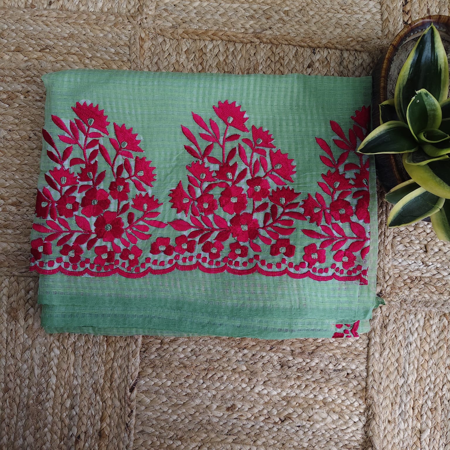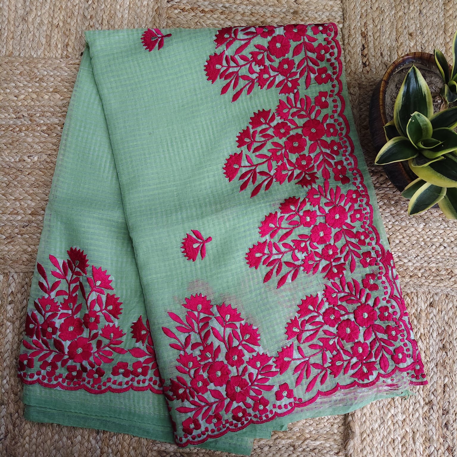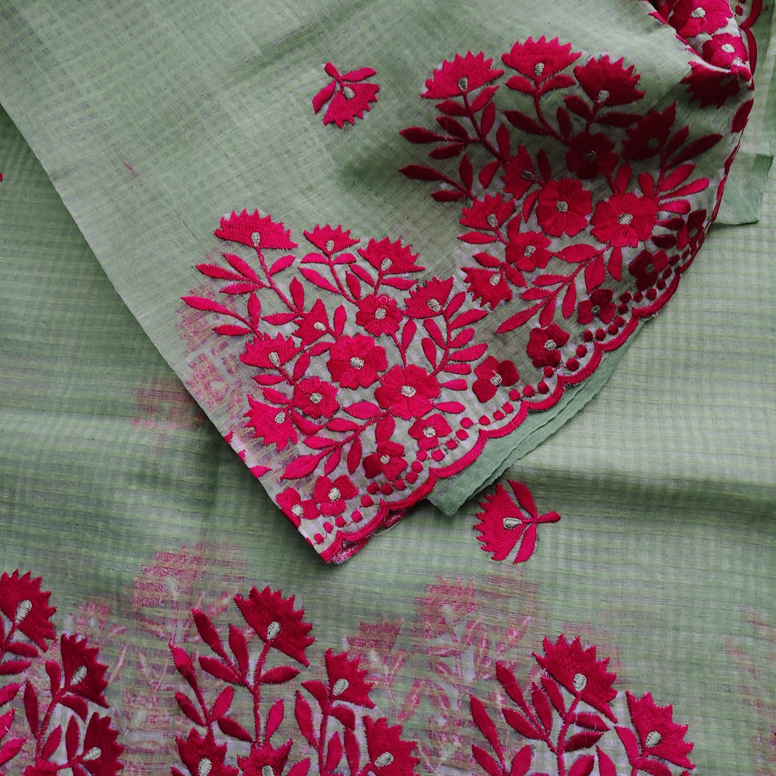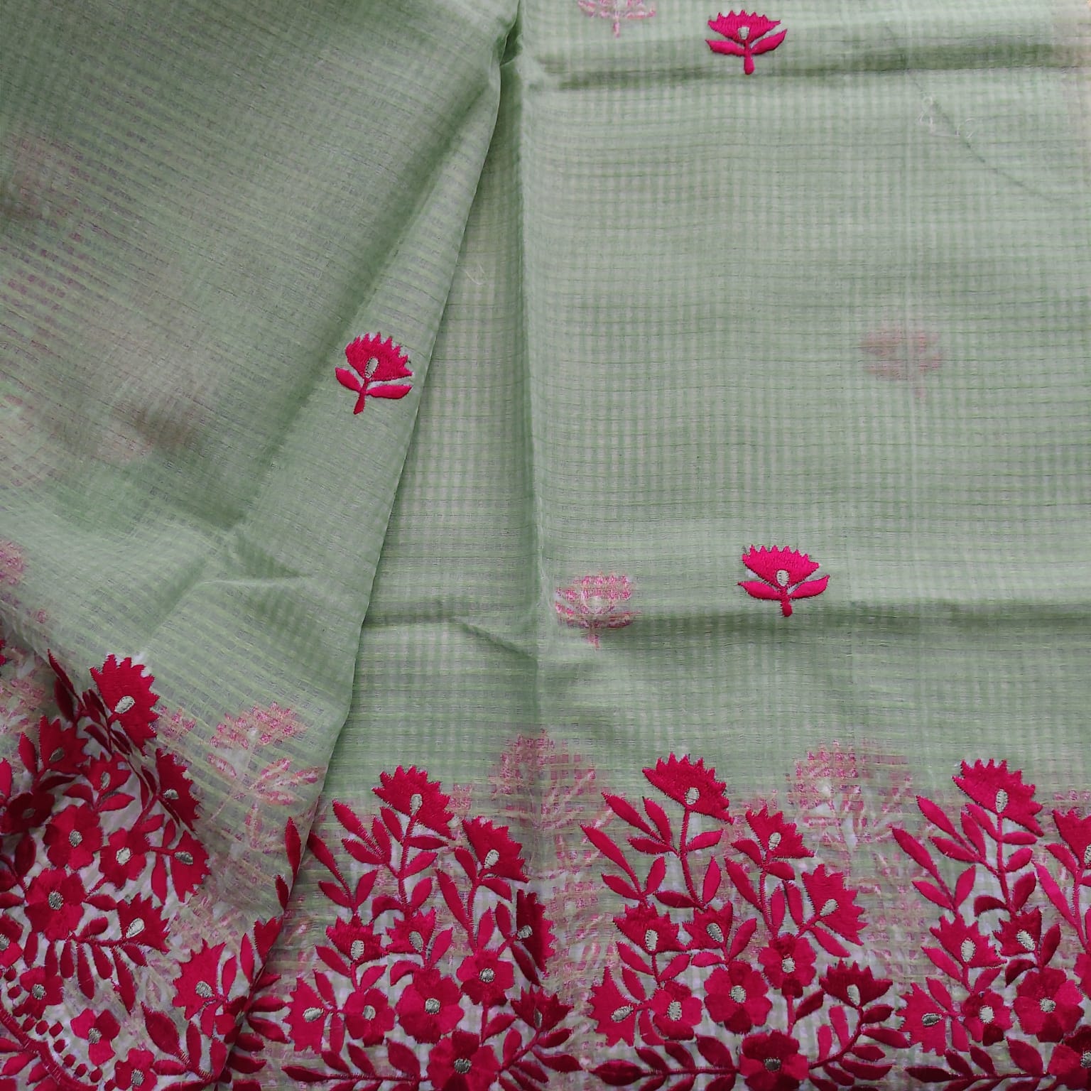 A graceful green Resham Kota Saree, featuring manual machine embroidery in magenta resham thread. The borders on both sides and the anchal are richly highlighted, showcasing the finesse of skilled artisans. Paired with a contrasting cotton blouse piece, this saree balances tradition with elegance. -