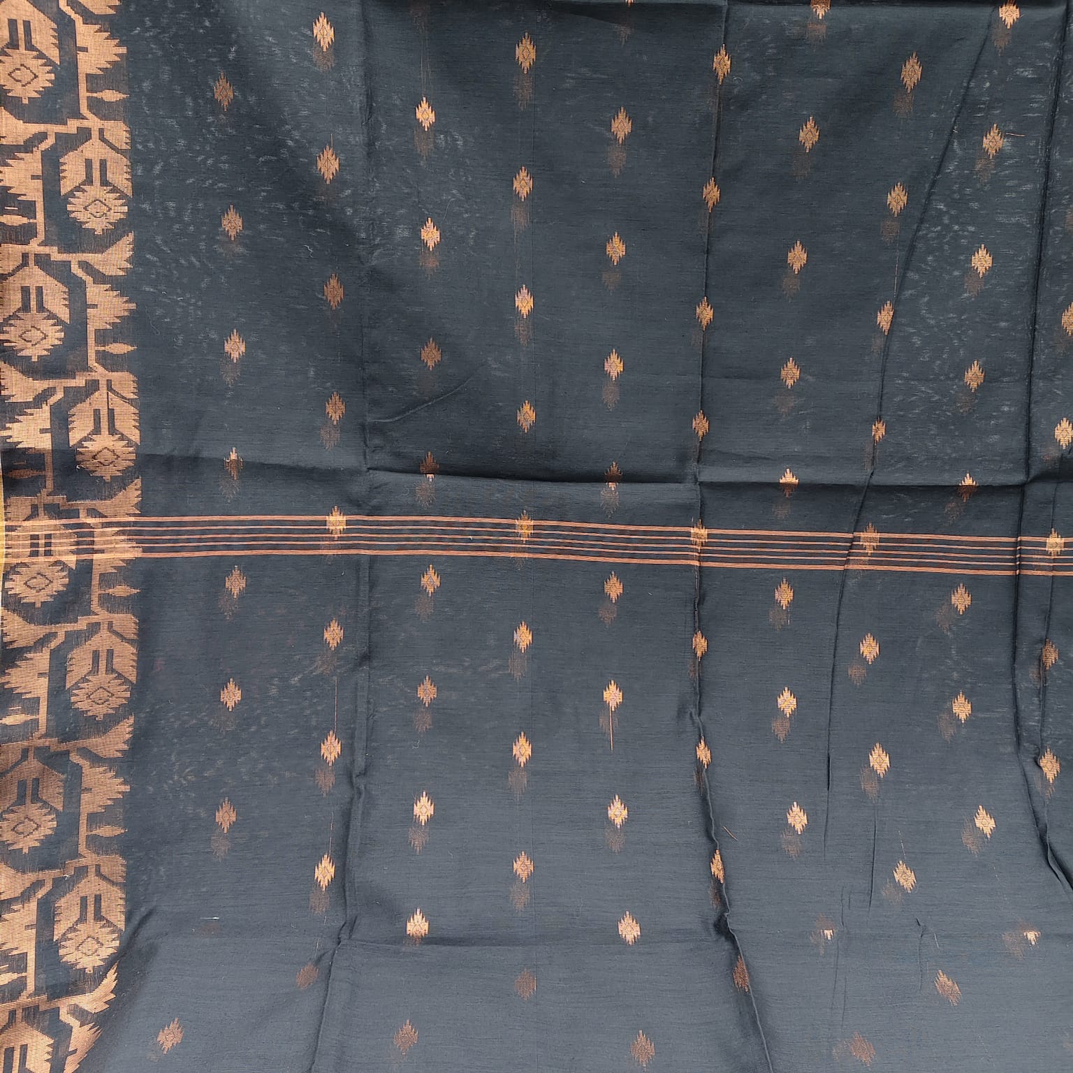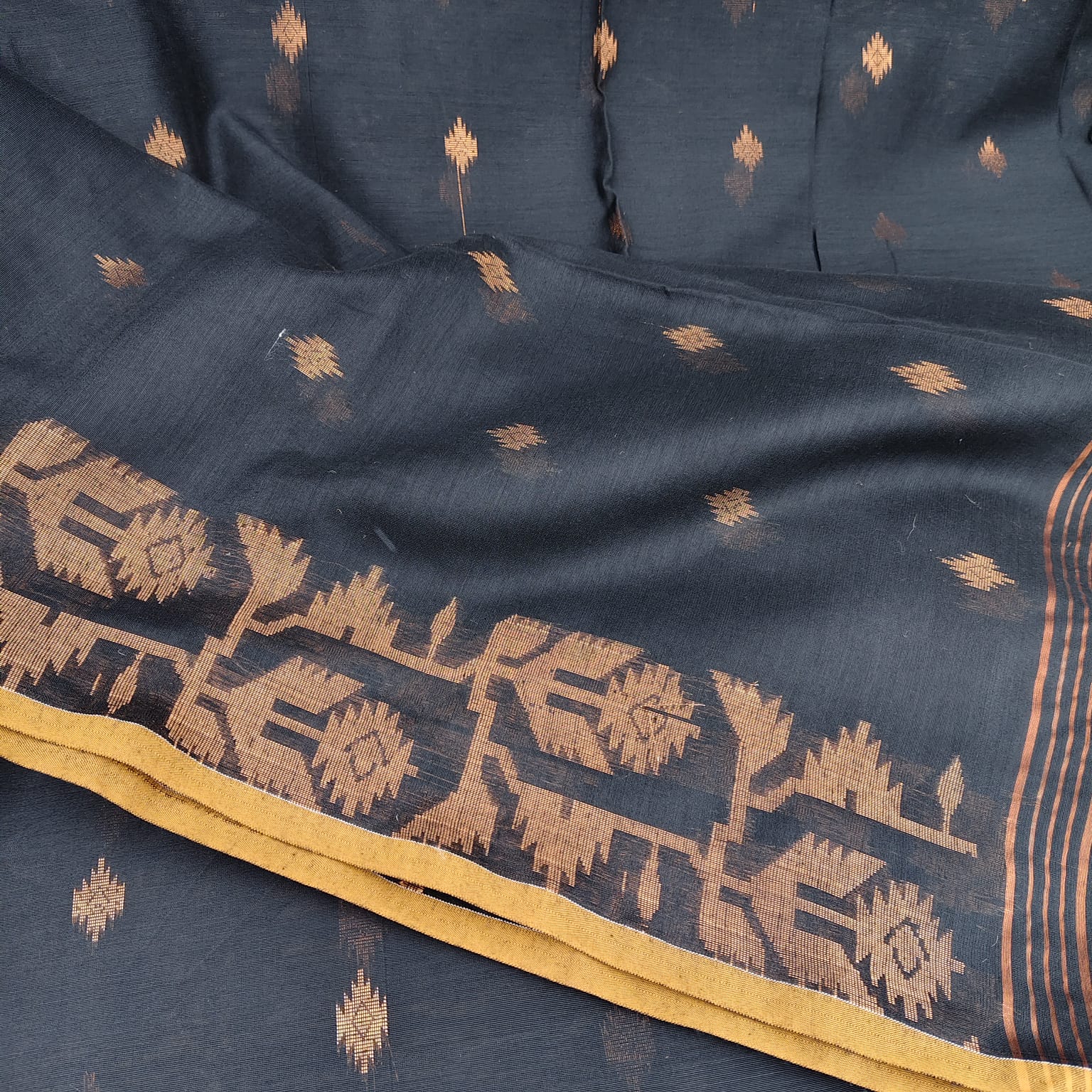 Handloom cotton Jamdani saree in a classic black shade, featuring intricate Jamdani weaving highlighted with copper zari work across the body and border. Comes with a matching running blouse piece in the same shade. Soft and easy to drape, it offers a subtle, elegant shimmer.