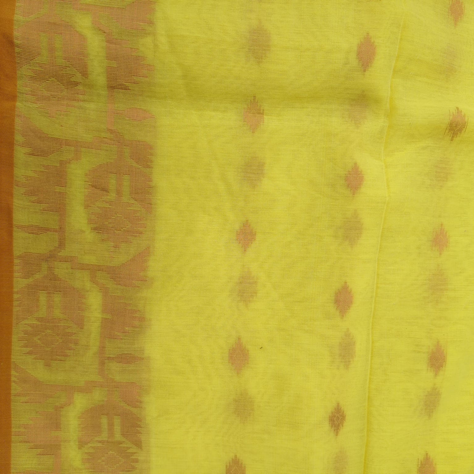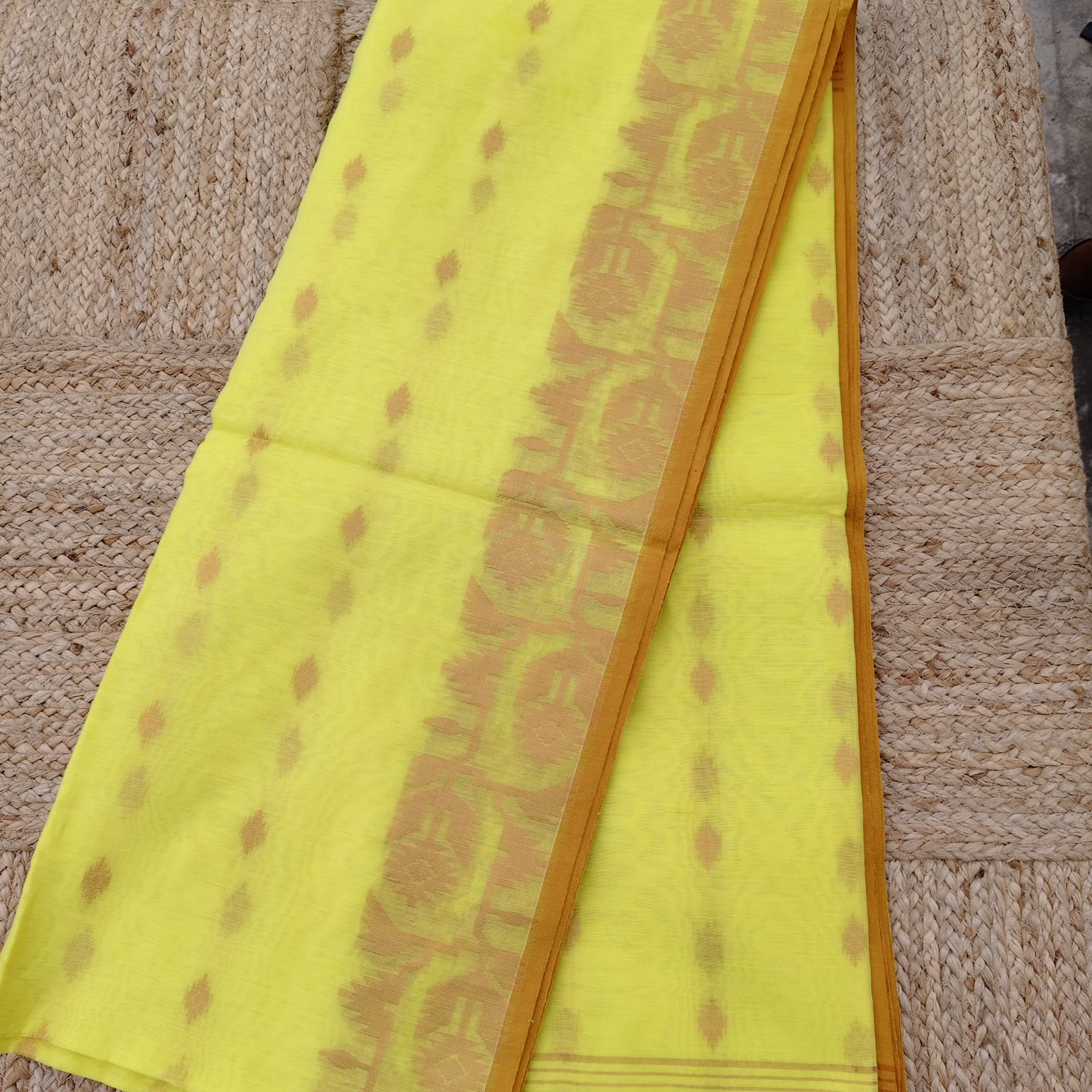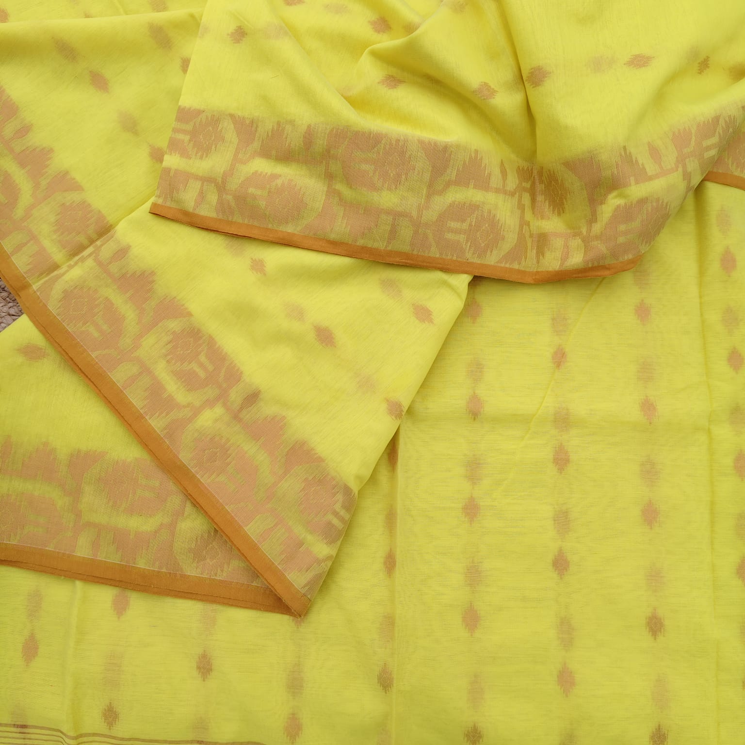 Handloom cotton Jamdani saree in a cheerful yellow shade, featuring intricate Jamdani weaving highlighted with copper zari work across the body and border. Comes with a matching running blouse piece in the same shade. Soft and easy to drape, it offers a subtle yet elegant shimmer.
