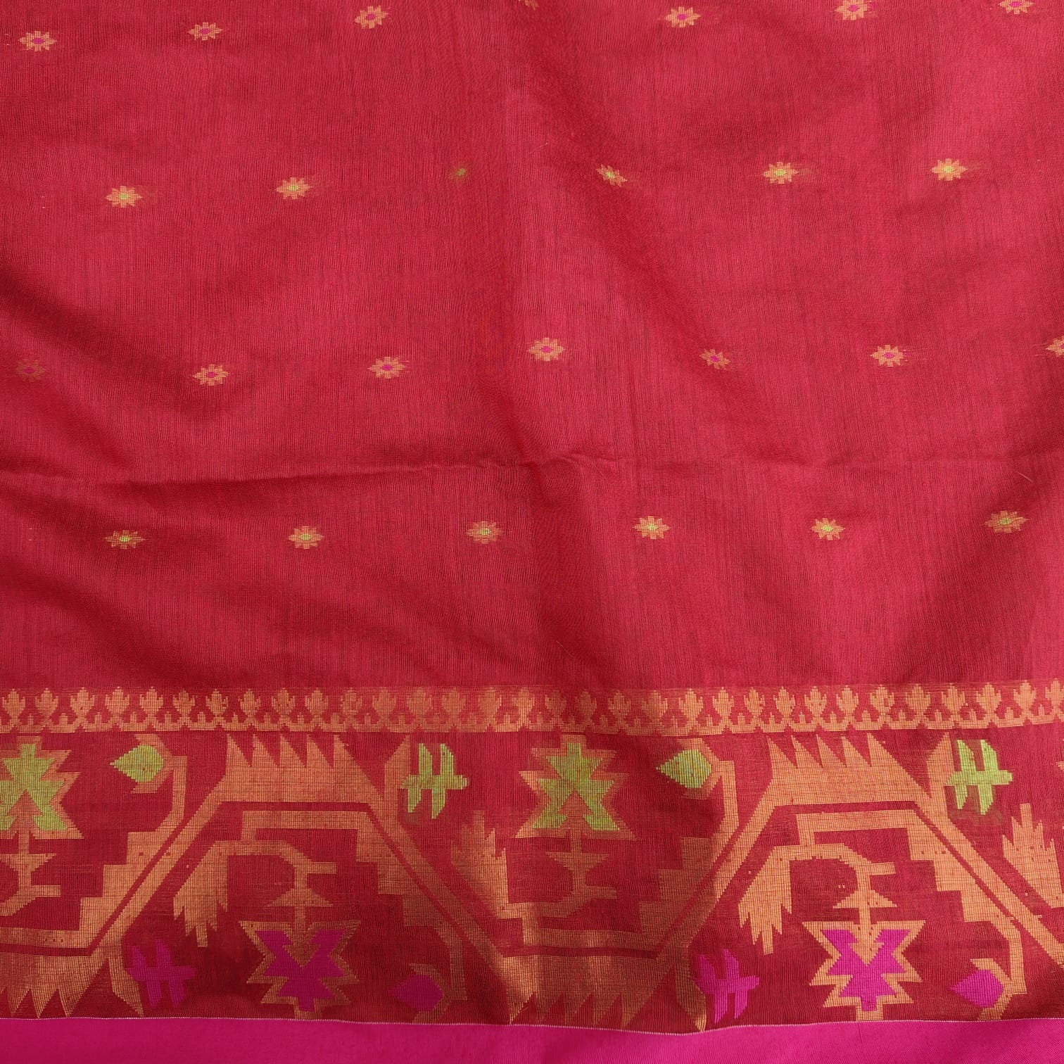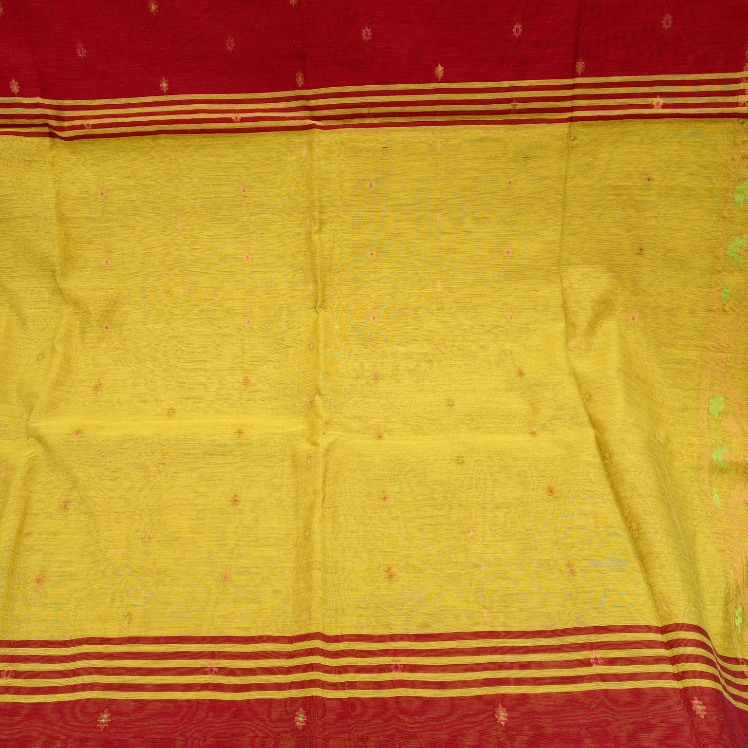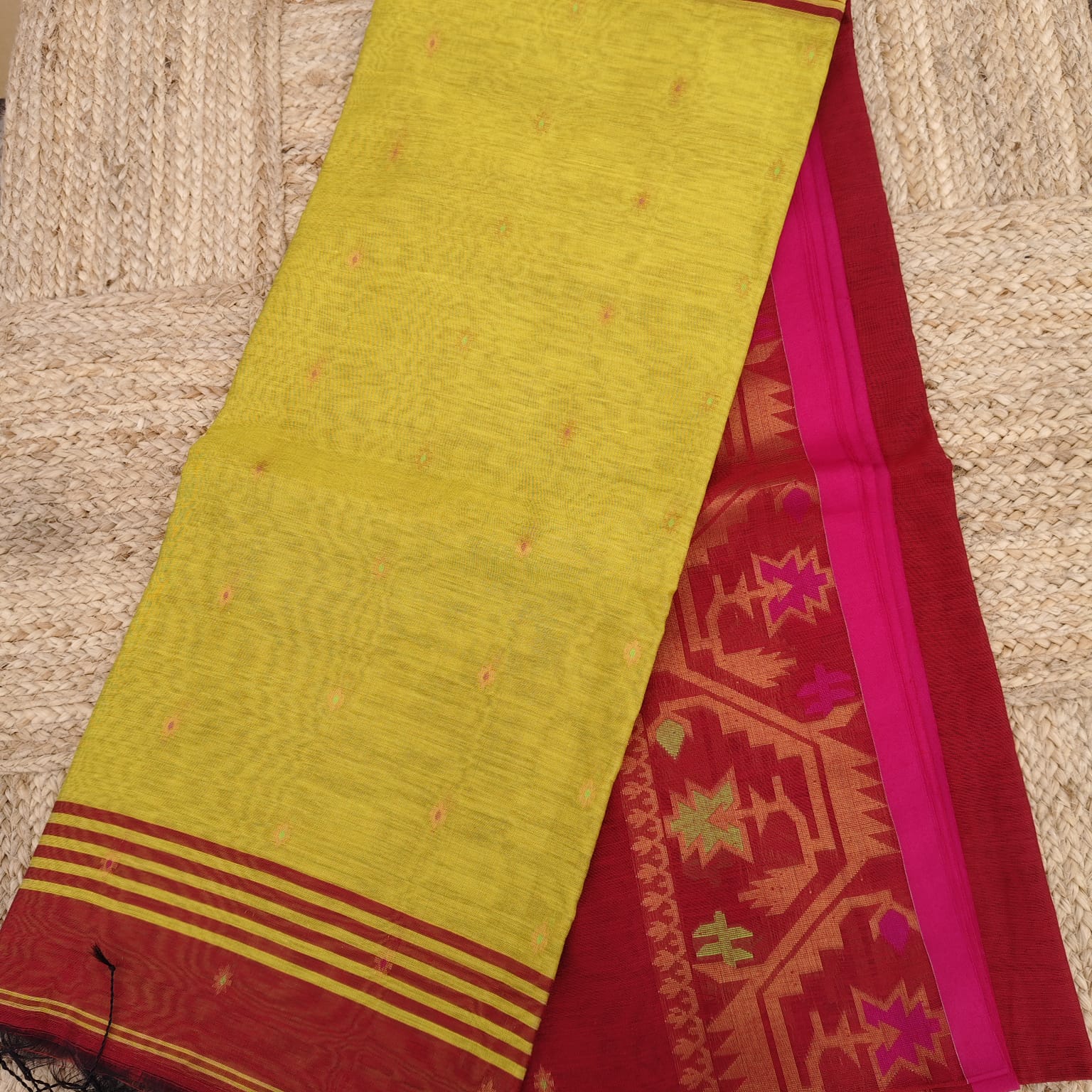Handloom cotton saree with a rich maroon body, featuring Jamdani-style woven butis scattered across the body. The border is highlighted with Jamdani-inspired weaving, while the anchal and blouse piece come in a beautiful olive mustard contrast. Soft in texture, the saree is easy to drape and comfortable to carry throughout the day, while still offering a refined, rich look.