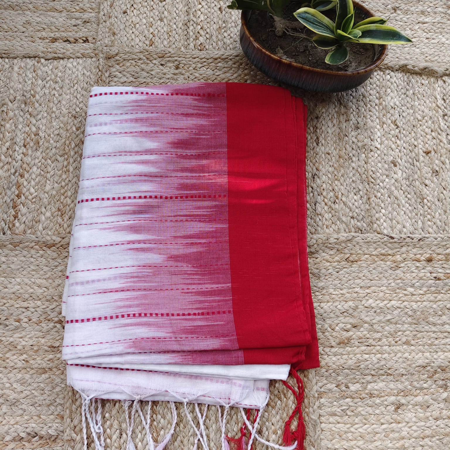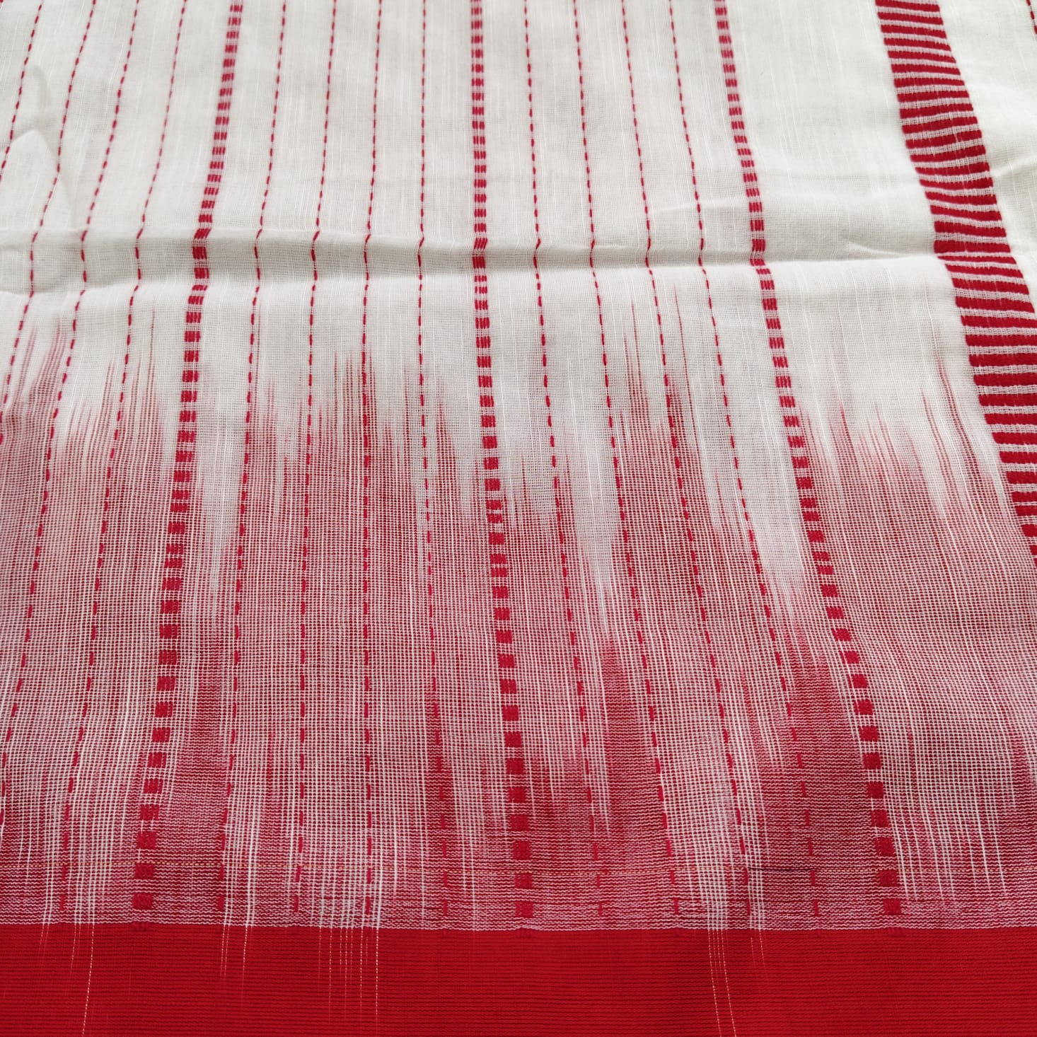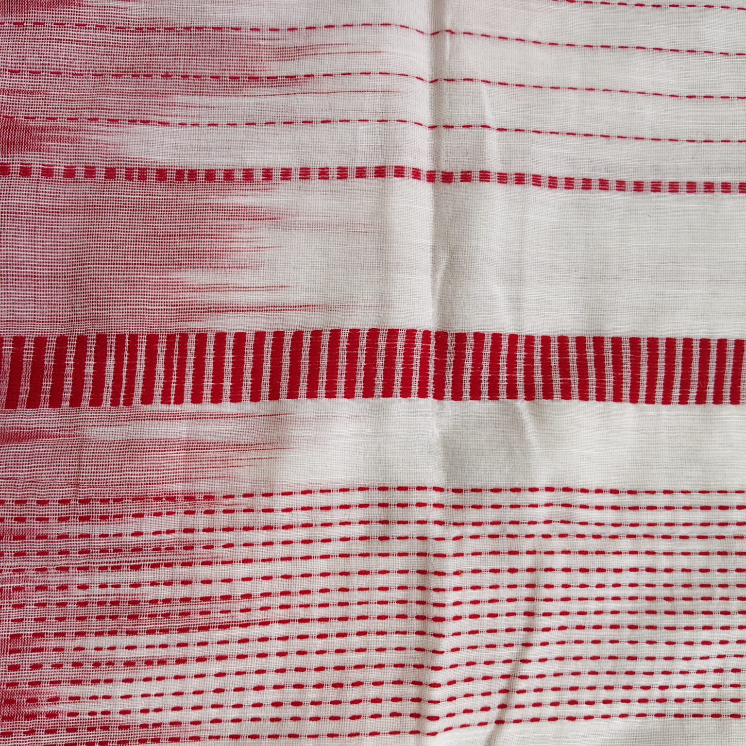 A striking hand-woven cotton saree in the classic white and red combination. The saree features all-over intricate thread weaving, beautifully enhanced with hand-done katha work that adds depth and artistry. Its pure white body is highlighted with contrasting red borders on both sides in a traditional Ganga Jamuna style, giving it a timeless and elegant appeal. Crafted from the finest quality cotton, this saree is soft, breathable, and exudes sophistication. -