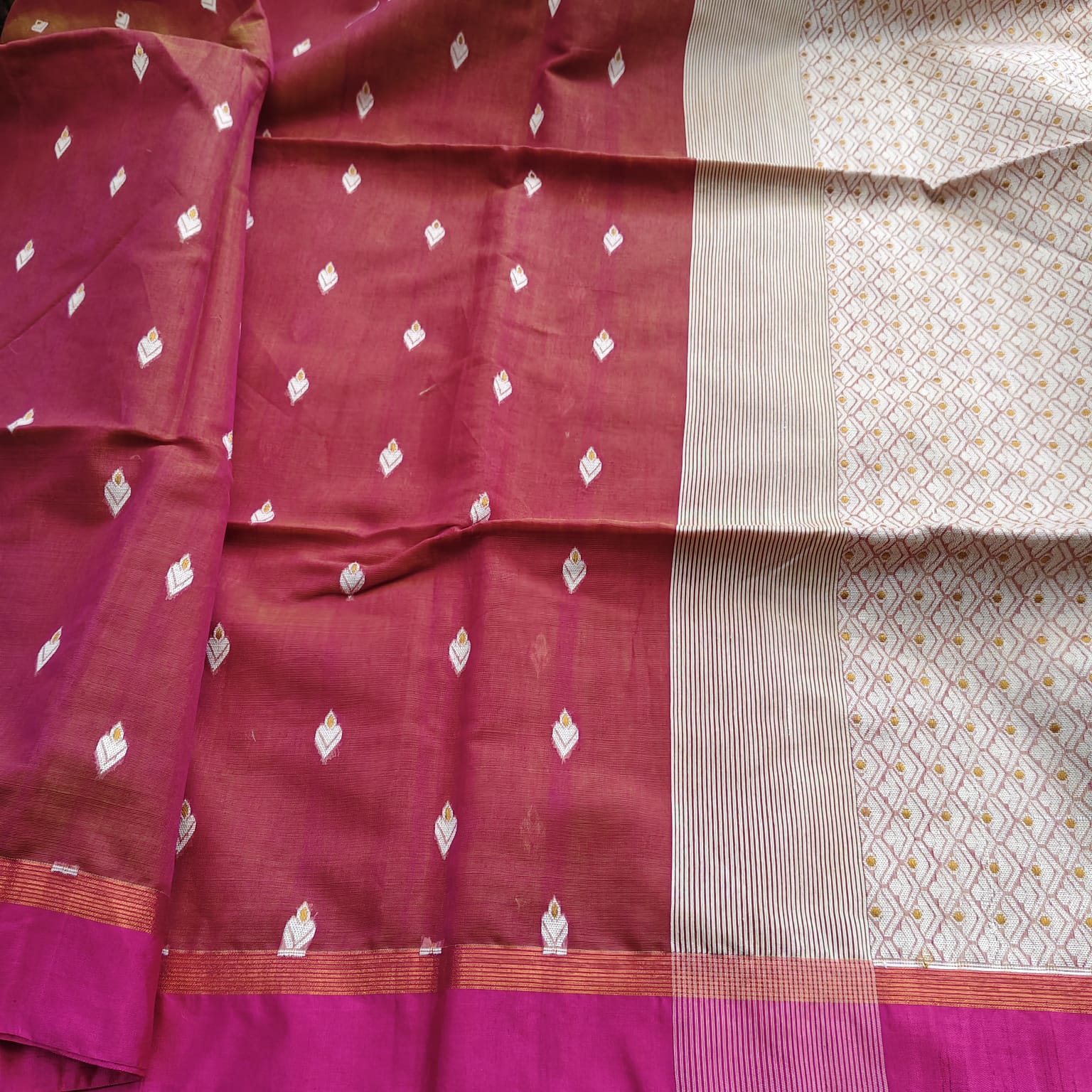This grape wine-coloured cotton Banarasi saree features a striking handwoven pallu in contrasting white thread work, giving it a rich and elegant appeal. The body is decorated with delicate handloom bootis, complemented by a solid contrast border. Lightweight, breathable, and easy to drape, it ensures comfort throughout the day. -