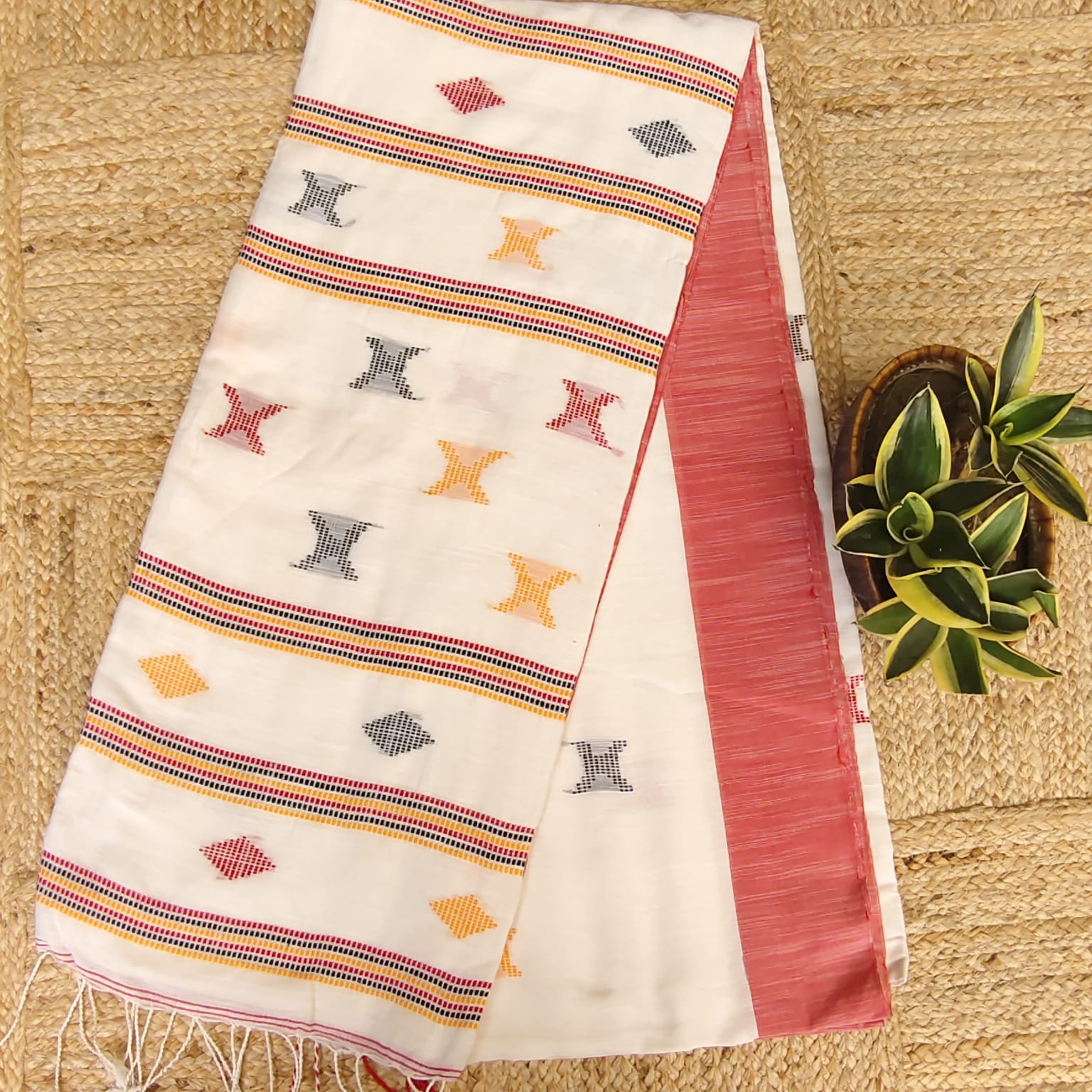 A pure white handwoven khadi cotton saree, exuding timeless sophistication. The body is adorned with delicate handwoven motifs that bring understated charm. Accentuated with a bold red border on both sides, it creates a graceful contrast, reflecting elegance and class. -