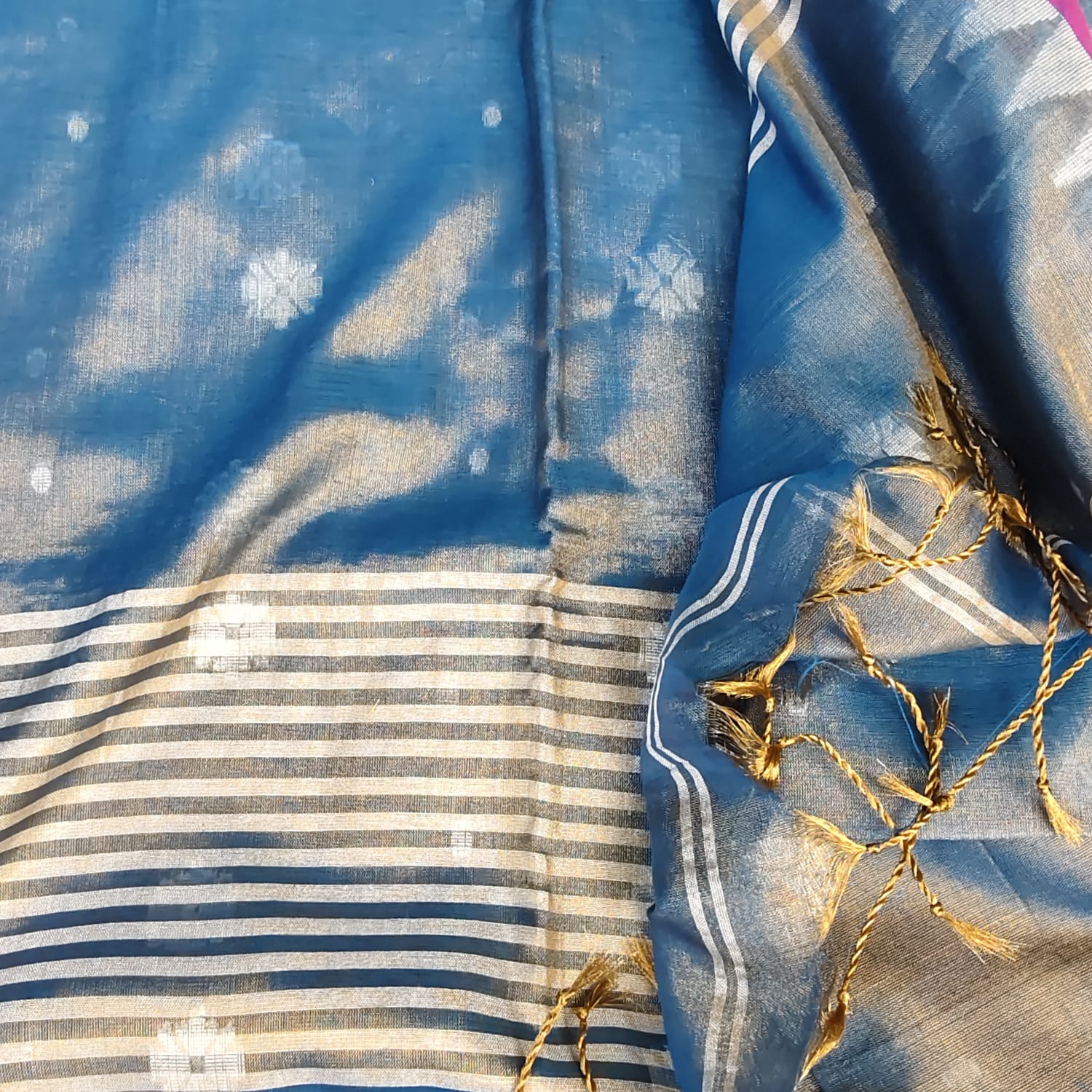 Dry clean only to preserve the Jamdani weave and delicate tissue texture. Store wrapped in a muslin cloth, away from sunlight and moisture.