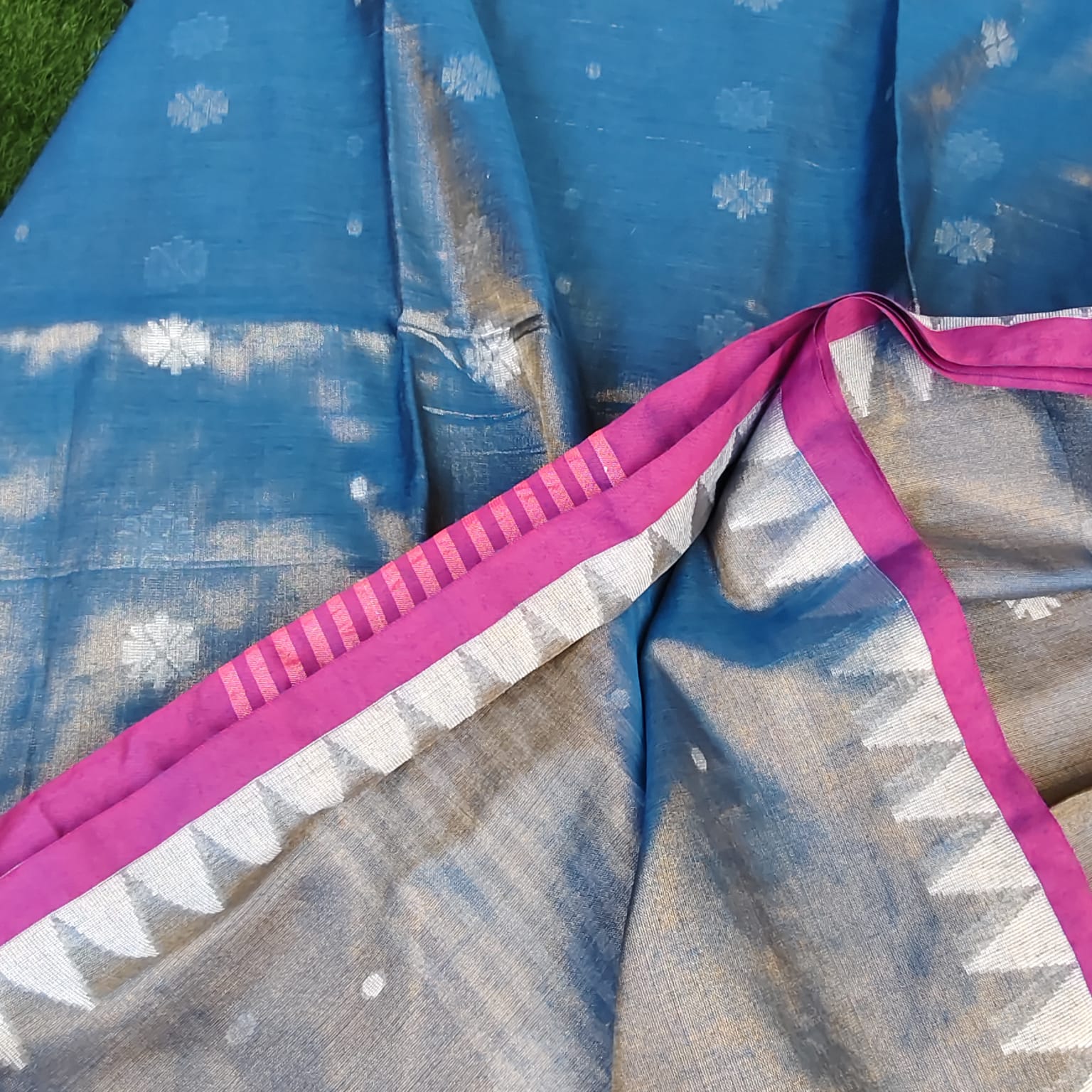 A sophisticated handwoven cotton-tissue saree in a grey base, intricately adorned with Jamdani booti motifs across the body. The saree is highlighted with a magenta selvedge and traditional temple borders, creating a striking contrast that enhances its elegance and uniqueness. -