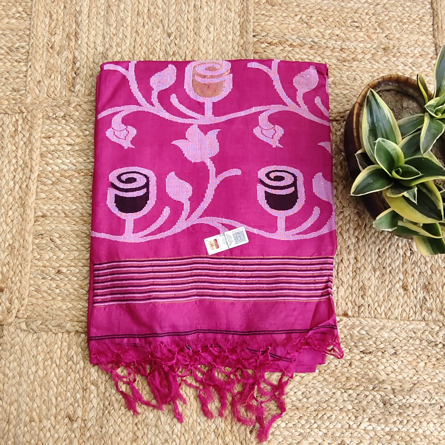 A Silk Mark-certified Pure Gachi Tussar Saree in a striking purplish magenta shade. The aanchal features intricately detailed Jamdani weaving, showcasing unparalleled craftsmanship. The saree is accentuated with a dignified, meticulously woven border, reflecting a luxurious and regal aesthetic. Each thread is handwoven to perfection, making this saree a statement piece for connoisseurs of fine silk. -
