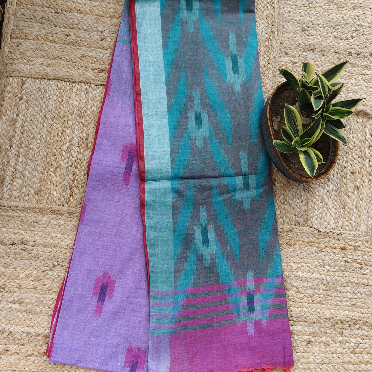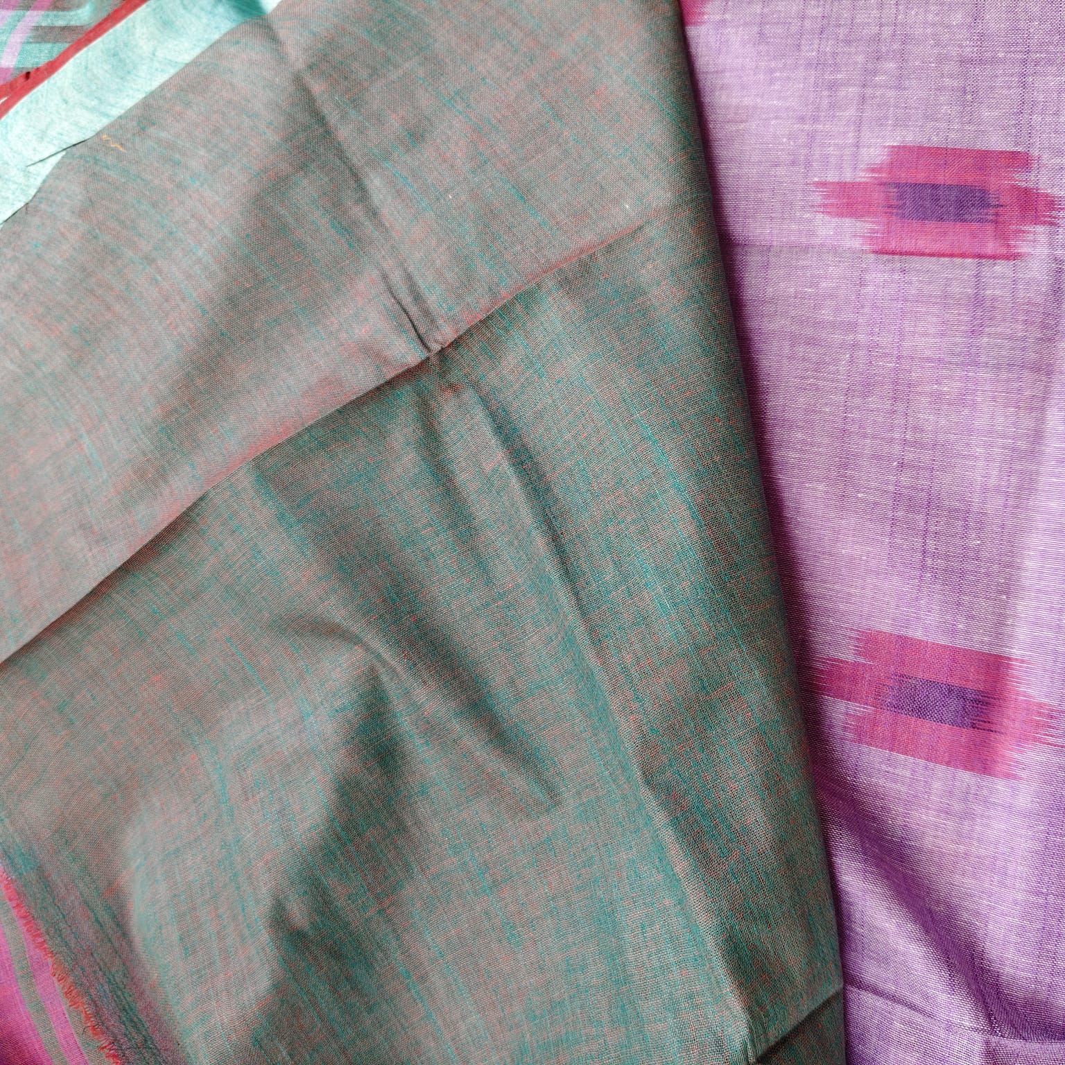 Fabric, Work & Design: Handwoven cotton-linen saree in a graceful mauve shade, featuring all-over Ikat weaving and finished with a refined silver-woven border. Lightweight, breathable, and elegant for everyday wear.