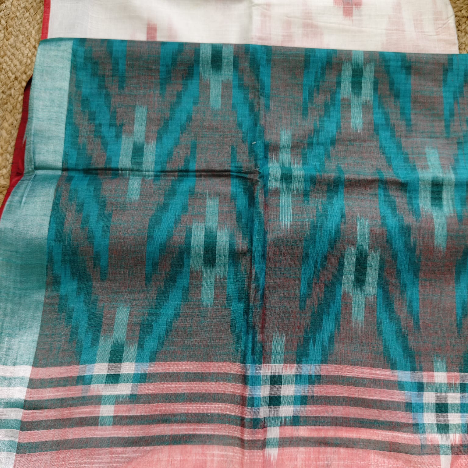 Fabric, Work & Design: Handwoven cotton-linen saree with a white base and green anchal (pallu), featuring all-over Ikat weaving and a subtle silver-woven border. Lightweight and breathable, blending comfort with artisanal charm.