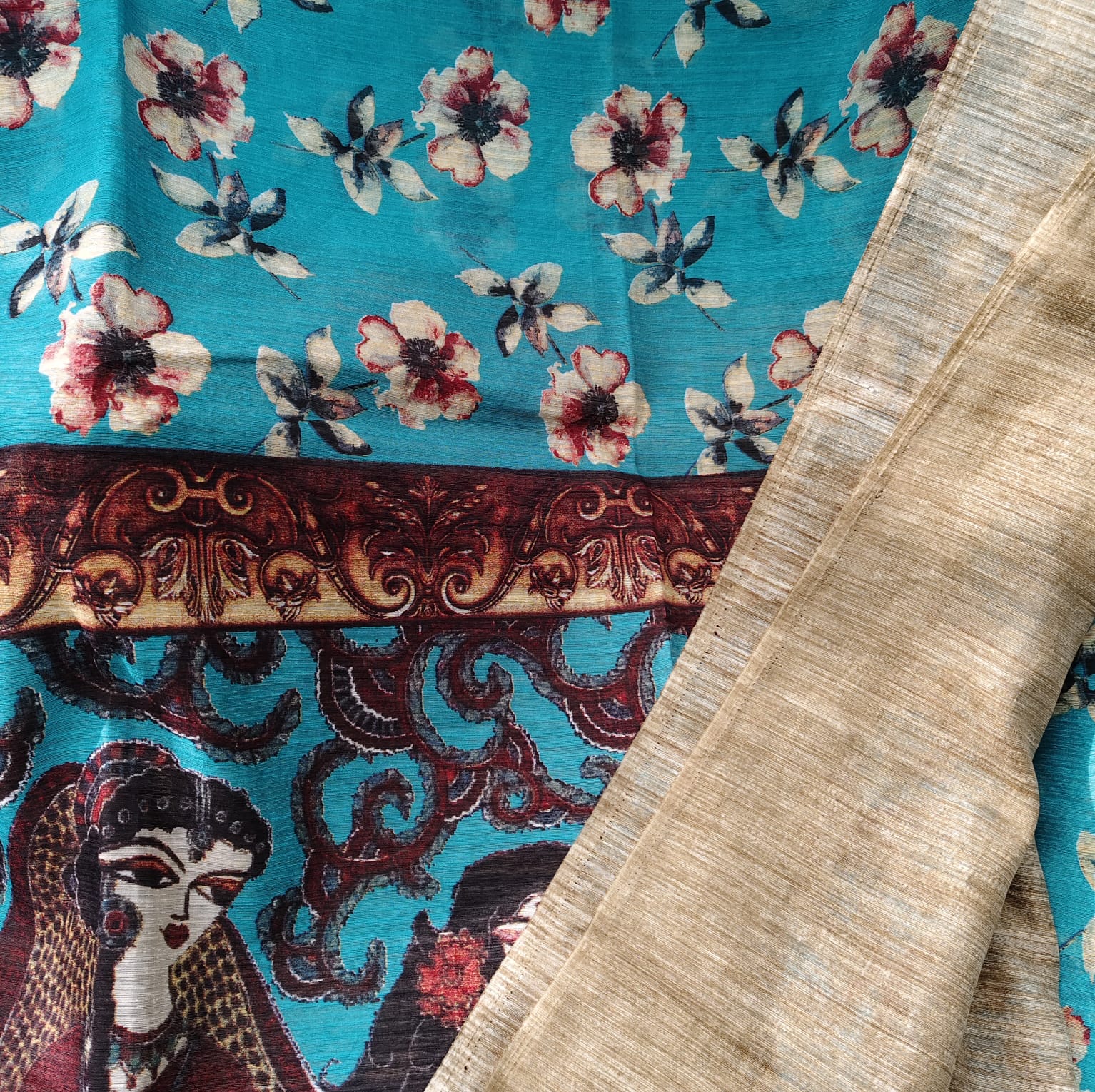 Ferozi blue jute cotton saree featuring vibrant floral digital prints all over the body. The fabric is soft, lightweight, and easy to drape, making it ideal for all-day comfort. The pallu stands out beautifully with traditional digital prints depicting Indian ethnic women in graceful dancing poses. To balance the bright and lively body, the border and attached blouse piece are kept plain in a subtle jute shade. -