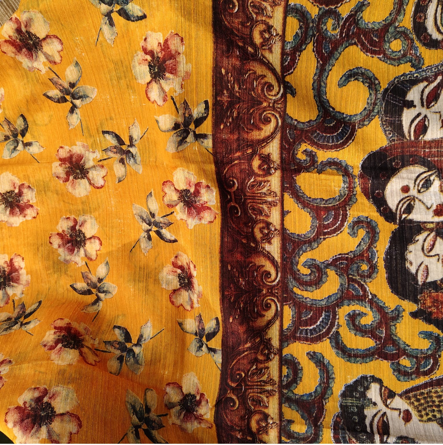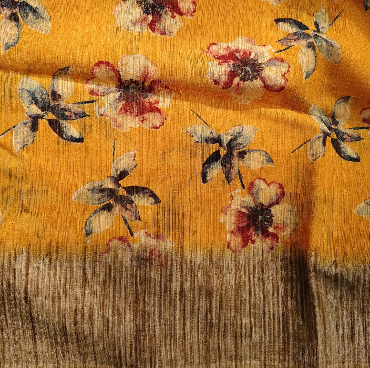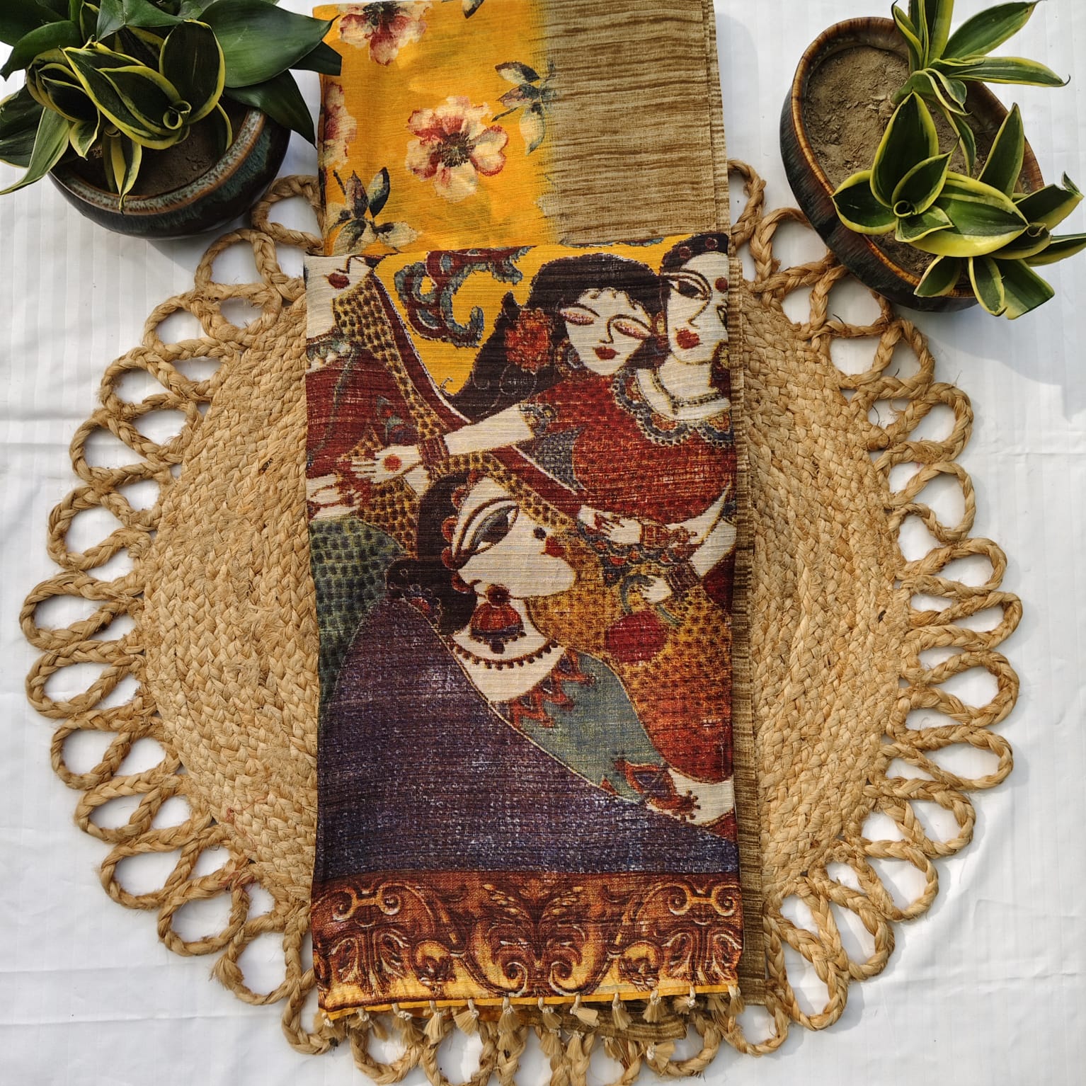 Mustard Jute linen cotton saree featuring vibrant floral digital prints all over the body. The fabric is soft, lightweight, and breathable, ensuring effortless draping and comfort throughout the day. The pallu stands out with traditional digital prints depicting Indian ethnic women in graceful dancing poses, adding a beautiful cultural touch. To balance the bright and cheerful body, the border and attached blouse piece are kept plain in a subtle linen shade, giving the saree an elegant finish. -