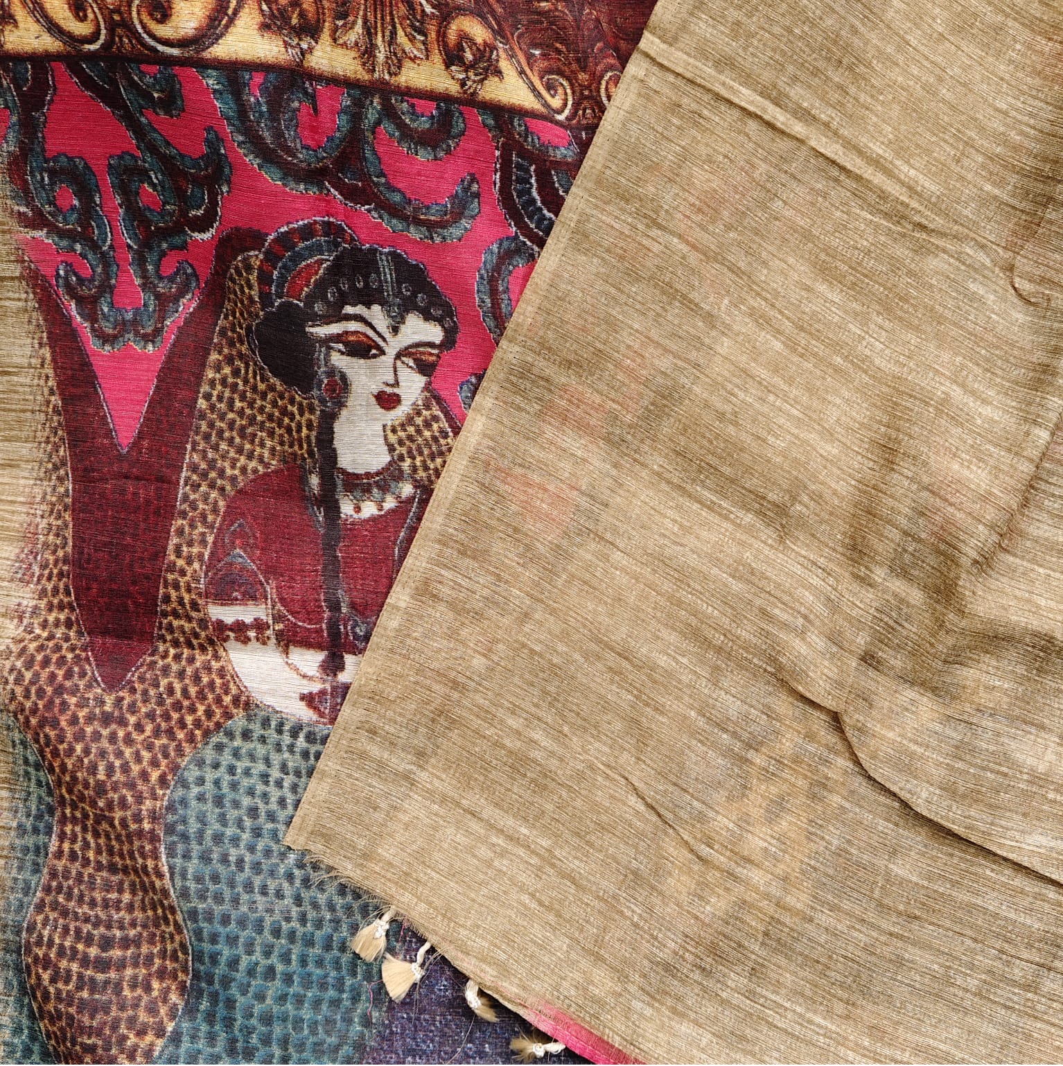 Strawberry pink linen cotton saree with vibrant floral digital prints spread gracefully across the body. The fabric is soft, light, and airy — perfect for all-day comfort and easy draping. The pallu features stunning traditional digital prints of Indian ethnic women in dancing poses, lending the saree a rich and artistic charm. To balance the bright and lively body, the border and attached blouse piece are kept plain in a matching linen shade, highlighting the digital artwork beautifully. -