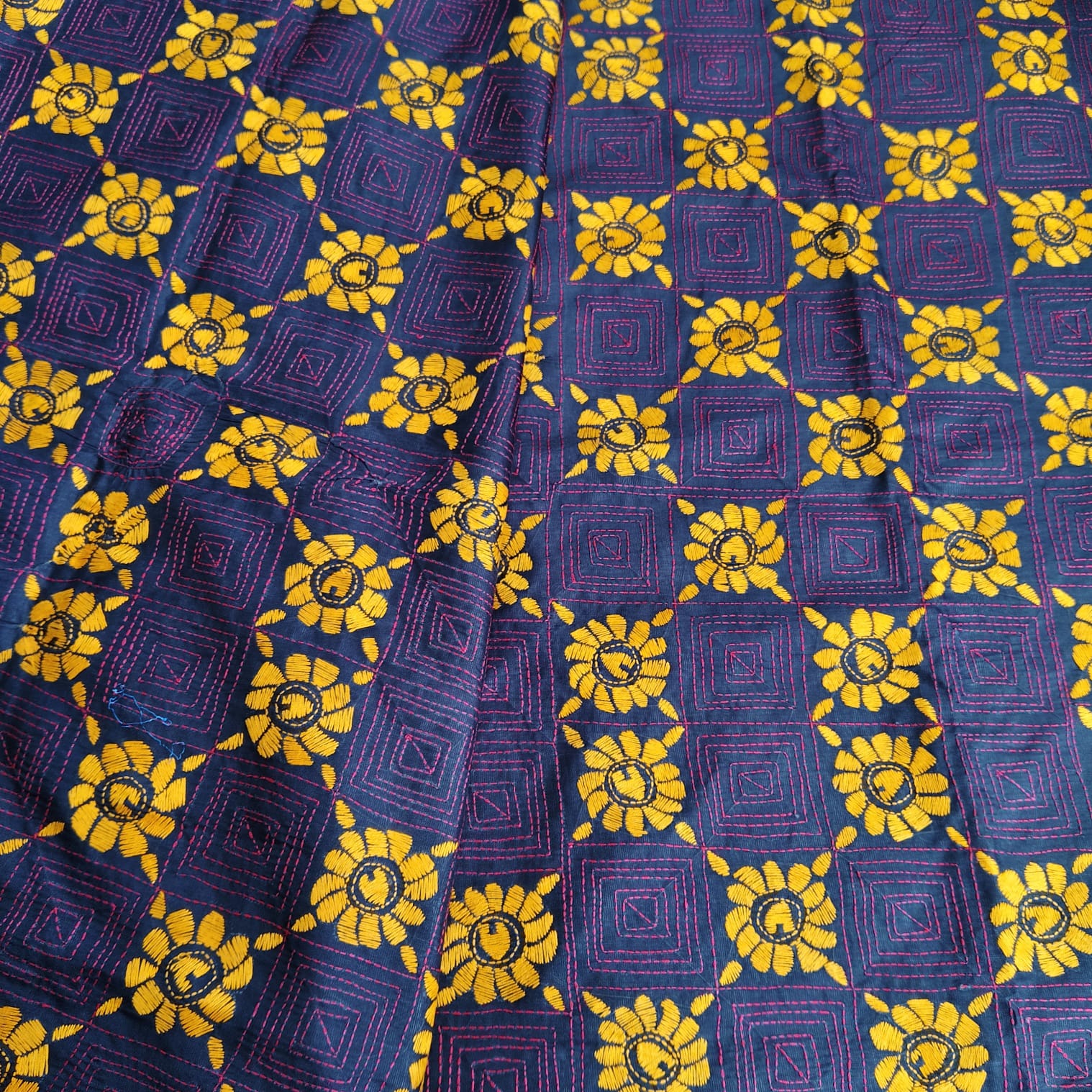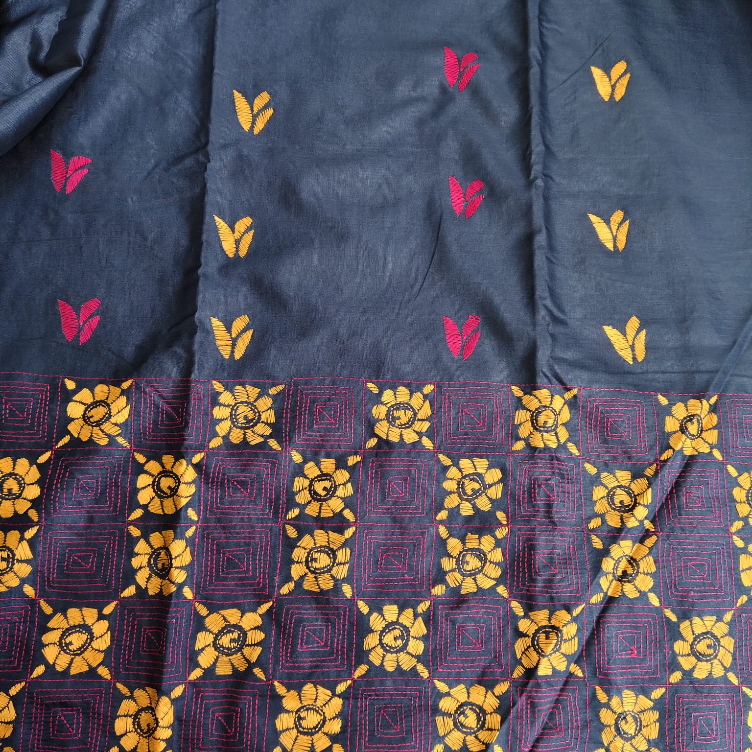 This black blended Bangalore silk saree is beautifully adorned with intricate kantha stitch embroidery in bright mustard and maroon hues. The entire body is richly hand-embroidered, and it comes with a matching blouse piece. -