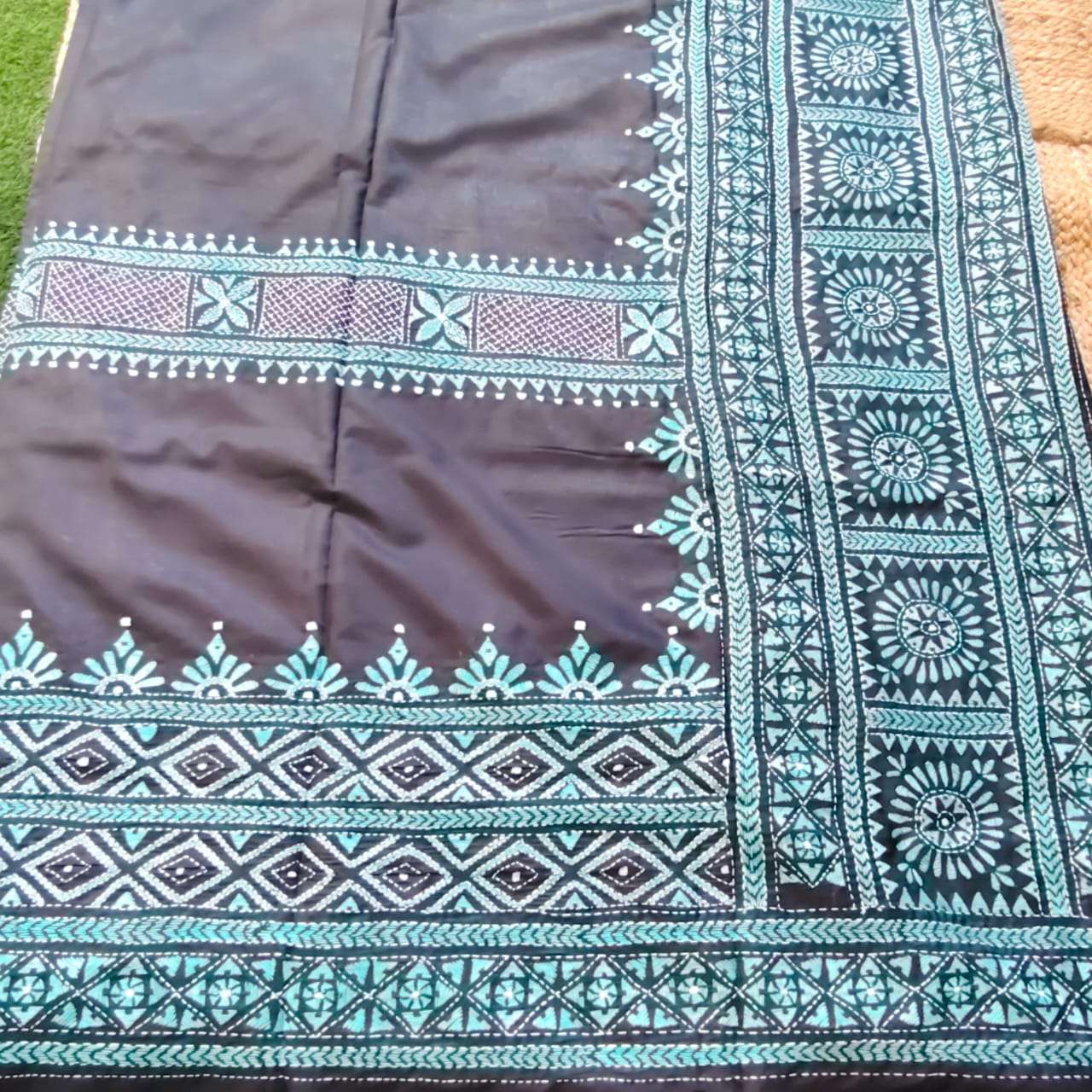 This elegant black blended Bangalore silk saree features exquisite hand-stitched Kantha embroidery. The work is done using contrasting sea green colour, creating a vibrant and beautifully detailed design. The saree carries neat, heavy hand Kantha work throughout, giving it a rich and artisanal appeal. A matching black blouse piece (1 metre) is included.