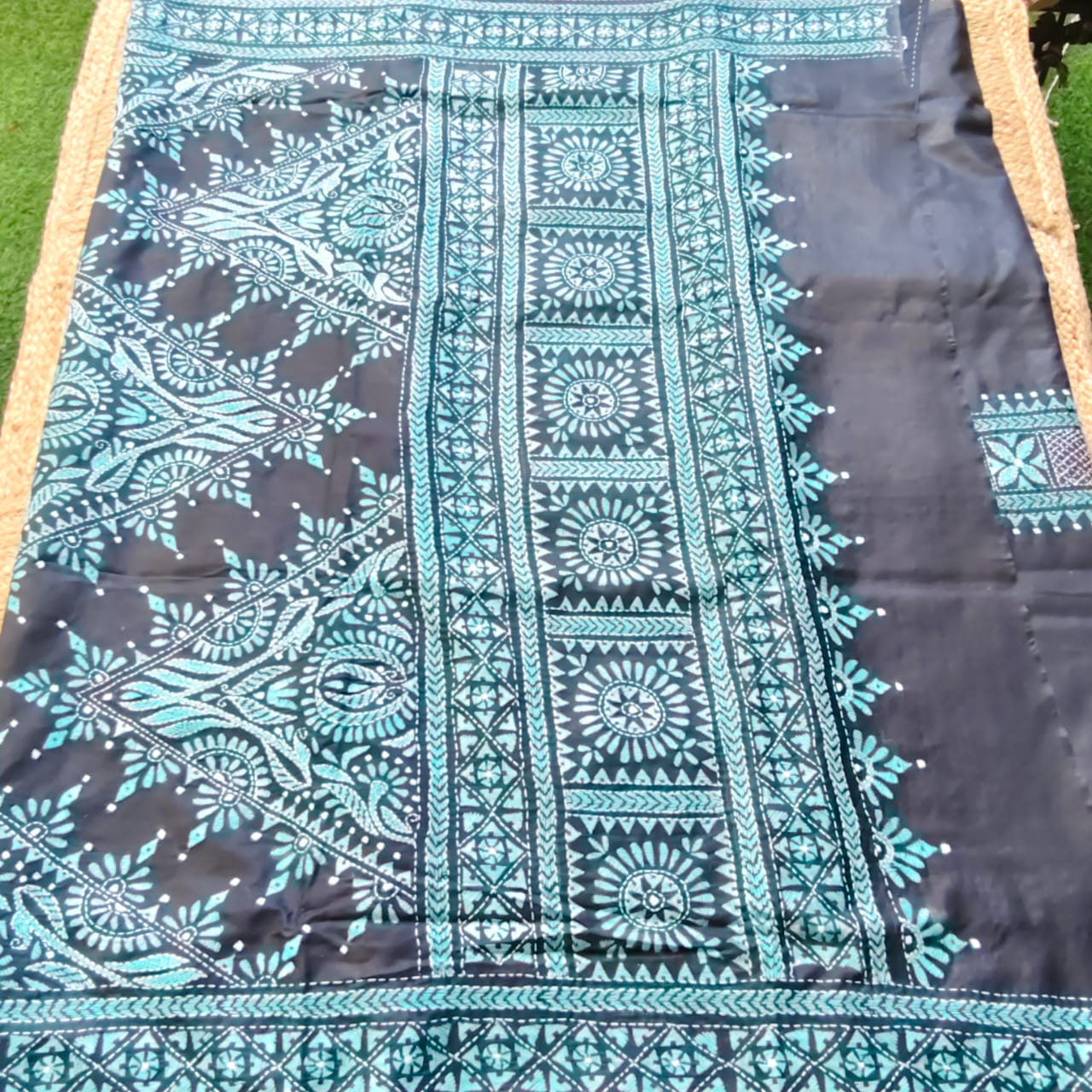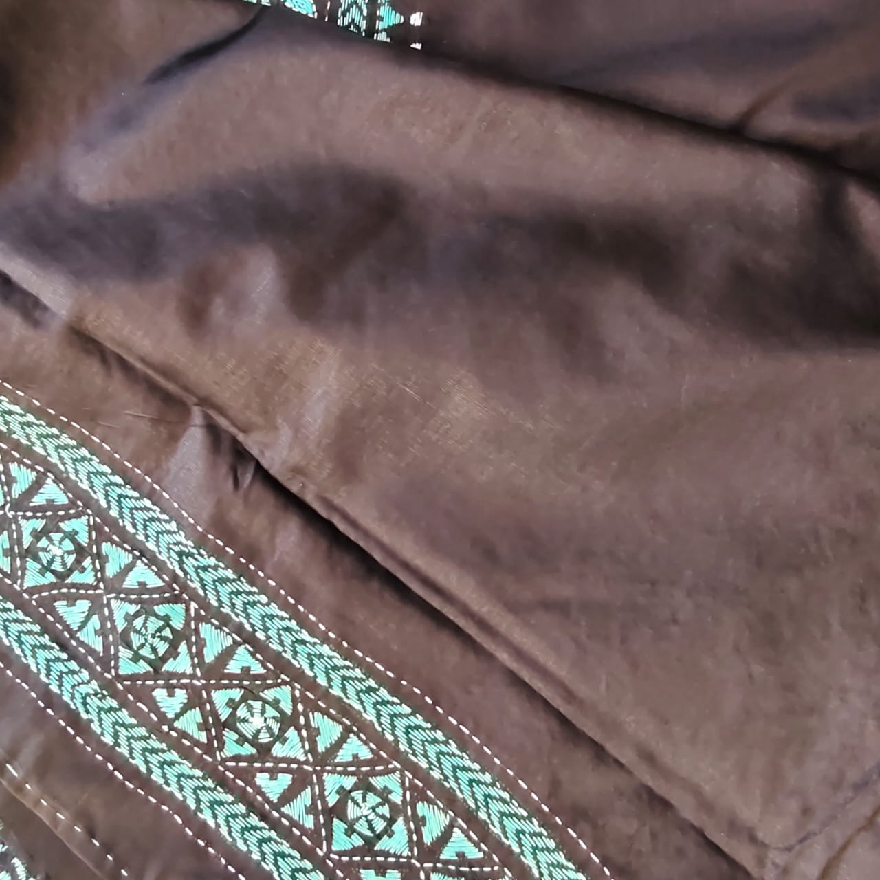 Dry clean only to maintain the shine and beauty of the silk and to preserve the intricate hand-done Kantha work. Store in a cool, dry place and avoid exposing it to direct sunlight for long hours.