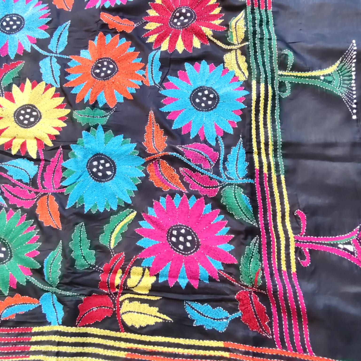This elegant black blended Bangalore silk saree features heavy multicoloured Kantha-style floral motifs. The vibrant, detailed flowers add a lively contrast against the deep black base, giving the saree a striking and uniquely beautiful appearance. The overall look is rich, artistic, and eye-catching.