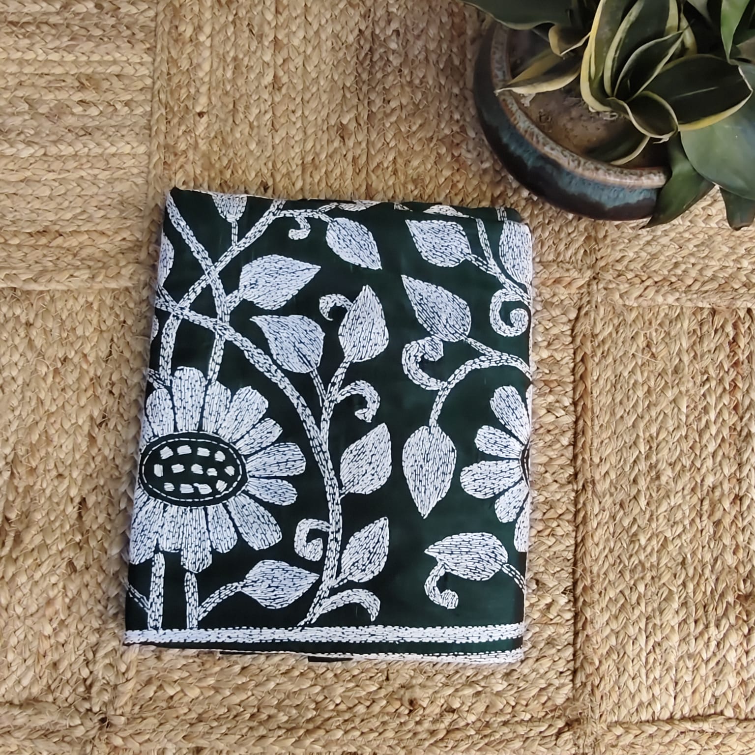 Dry clean only to maintain the softness of the fabric and preserve the detailed hand Kantha embroidery. Store in a cool, dry place and avoid prolonged exposure to direct sunlight.