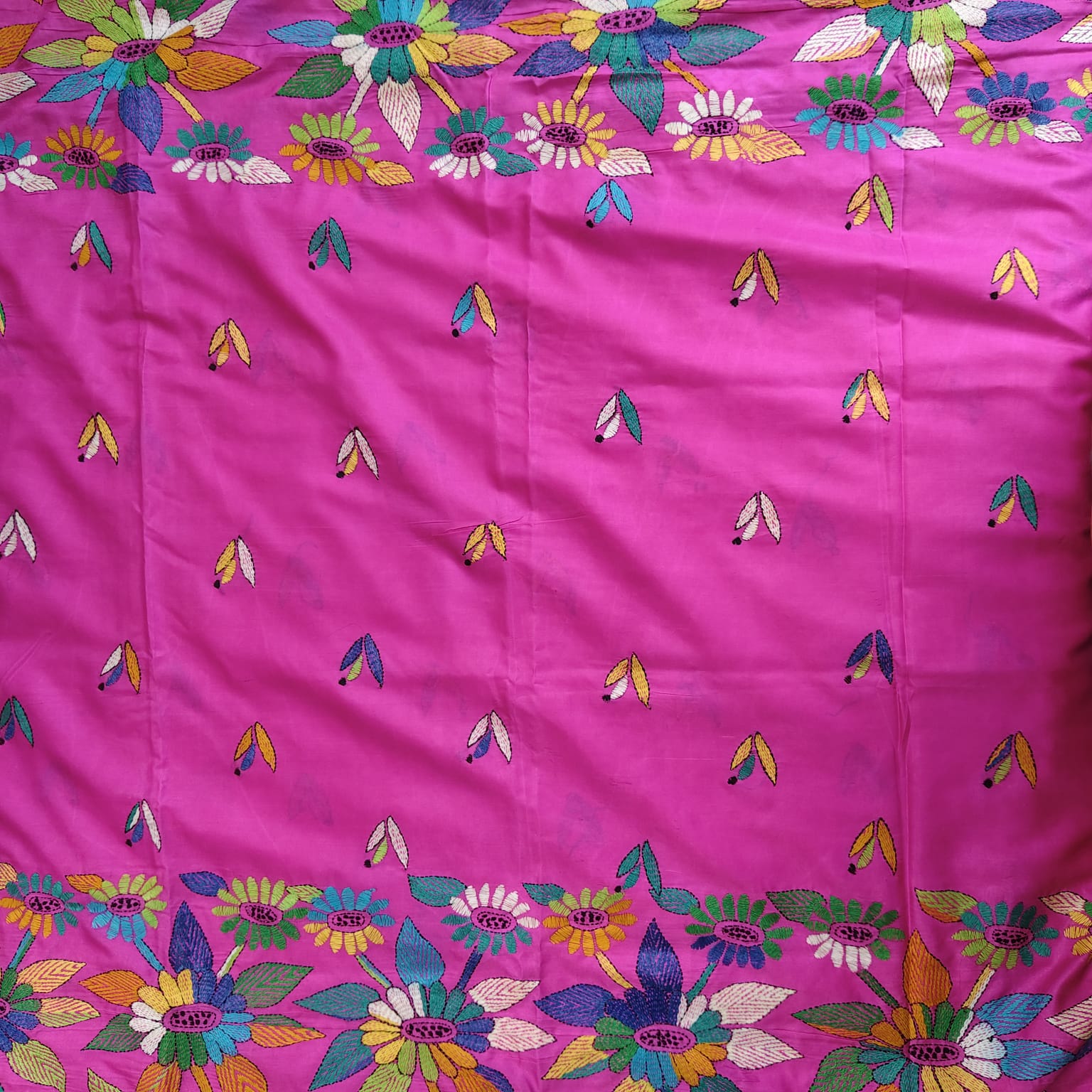 This fuchsia pink blended Bangalore silk saree is beautifully adorned with intricate multi-coloured kantha (katha) hand embroidery. It comes with a running blouse piece, also embroidered to match the saree. -