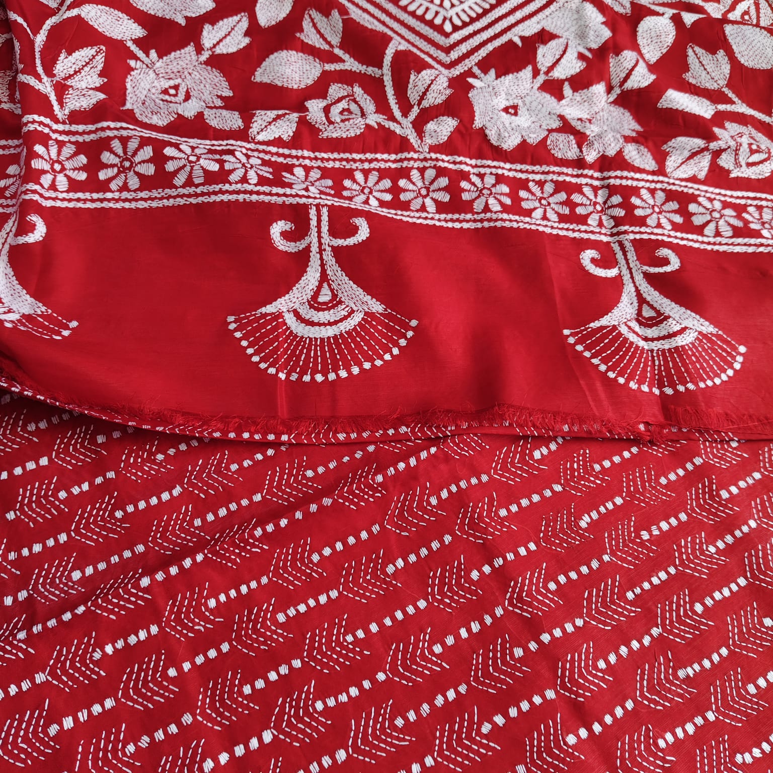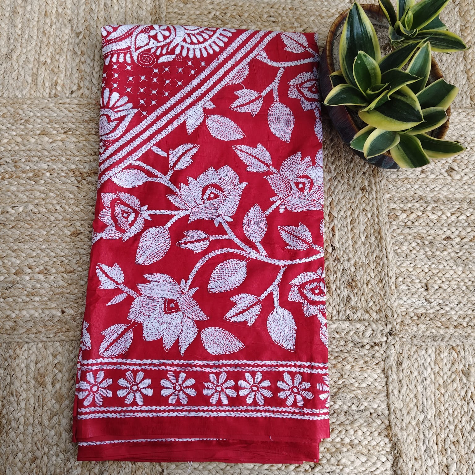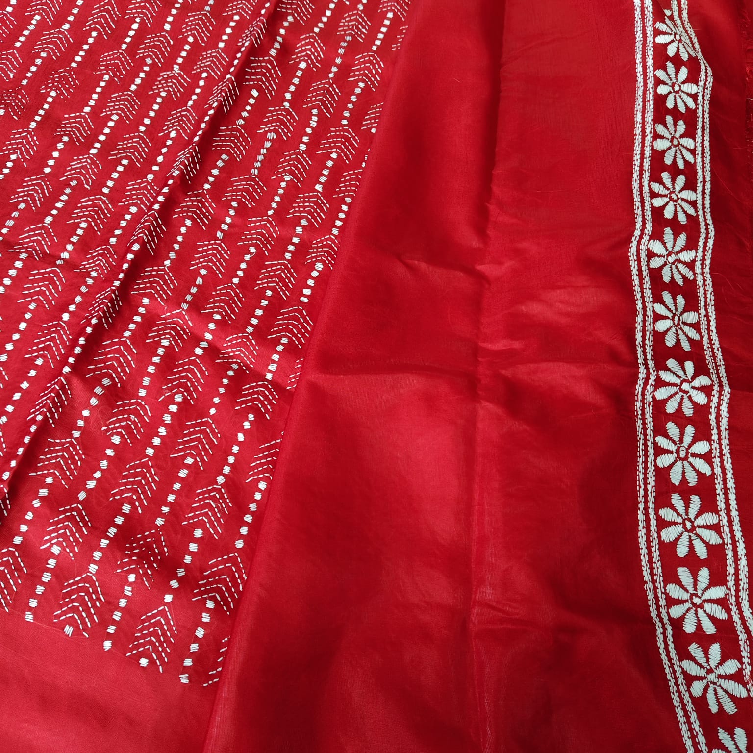 This beautiful red blended Bangalore silk saree is adorned with intricate white kantha stitch embroidery, featuring heavy work on the anchal and delicate stitches across the body. It comes with a matching plain blouse piece, detailed with a border and kantha stitch. -