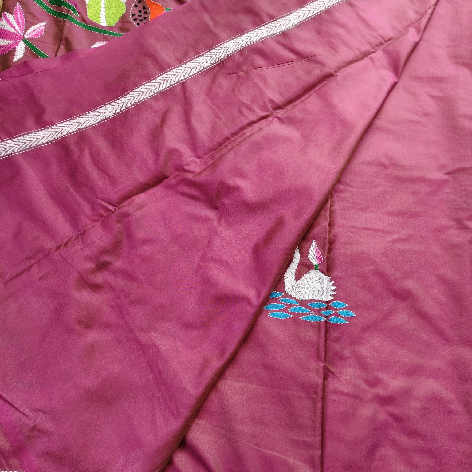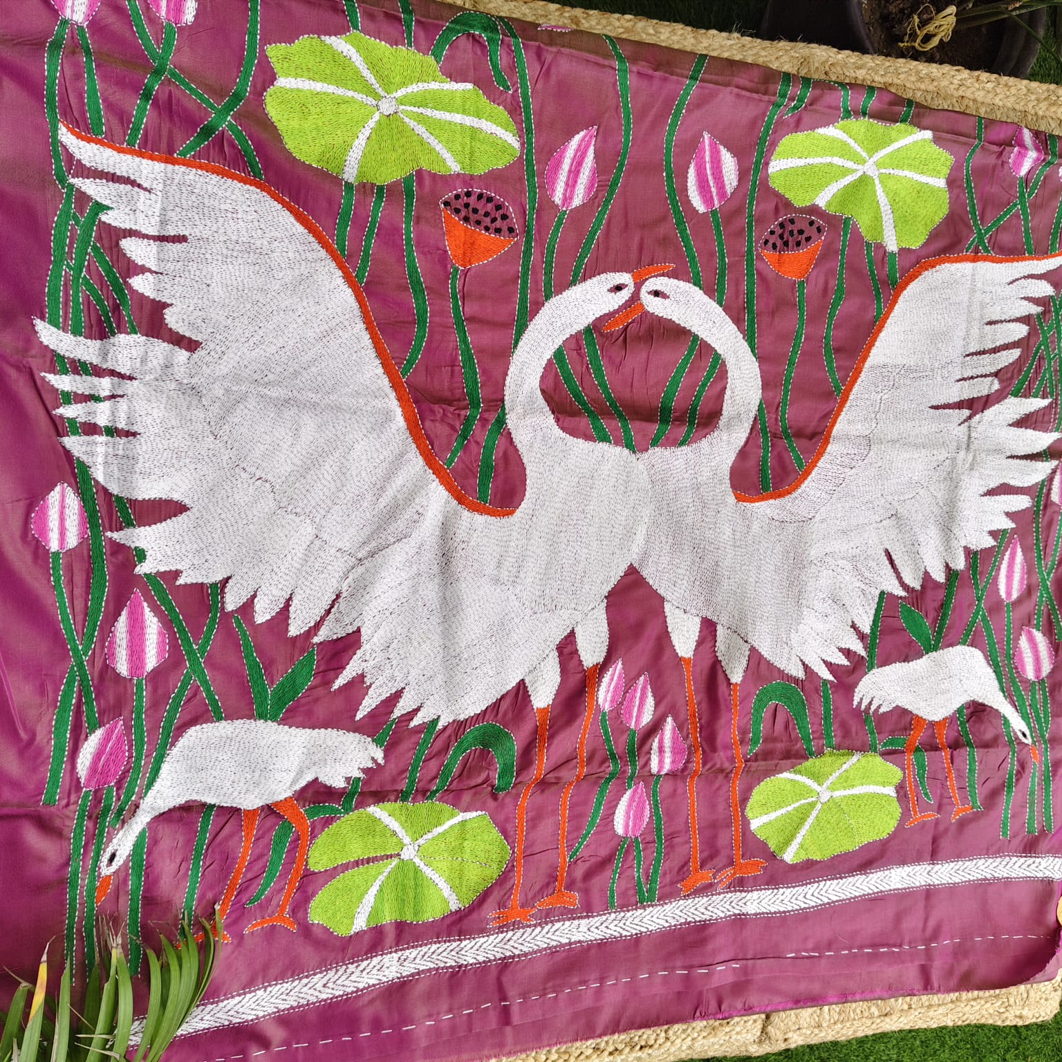 This wine-coloured blended Bangalore silk saree carries a rich dual shade and is intricately hand-embroidered with kantha stitch. The exquisite design depicts a pair of swans in a lotus pond, making it truly unique. A matching running blouse piece is included. -