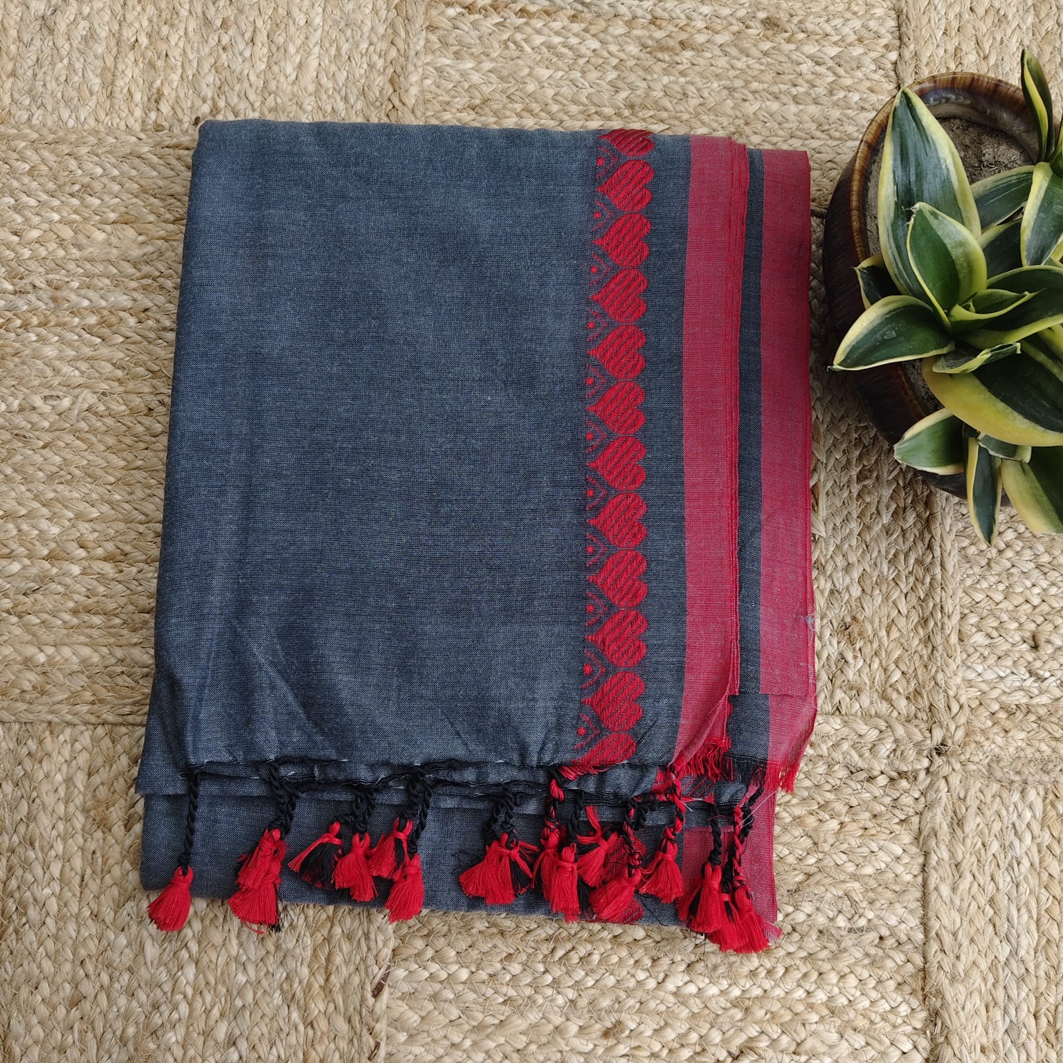 Fabric, Work & Design: Khadi cotton saree in a soft gray shade, featuring charming red heart-shaped woven motifs along the border and playful tassels on the edges. Lightweight, breathable, and easy to drape, ideal for everyday wear. No blouse piece included.