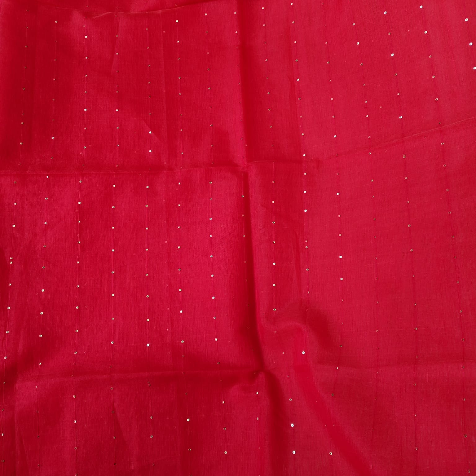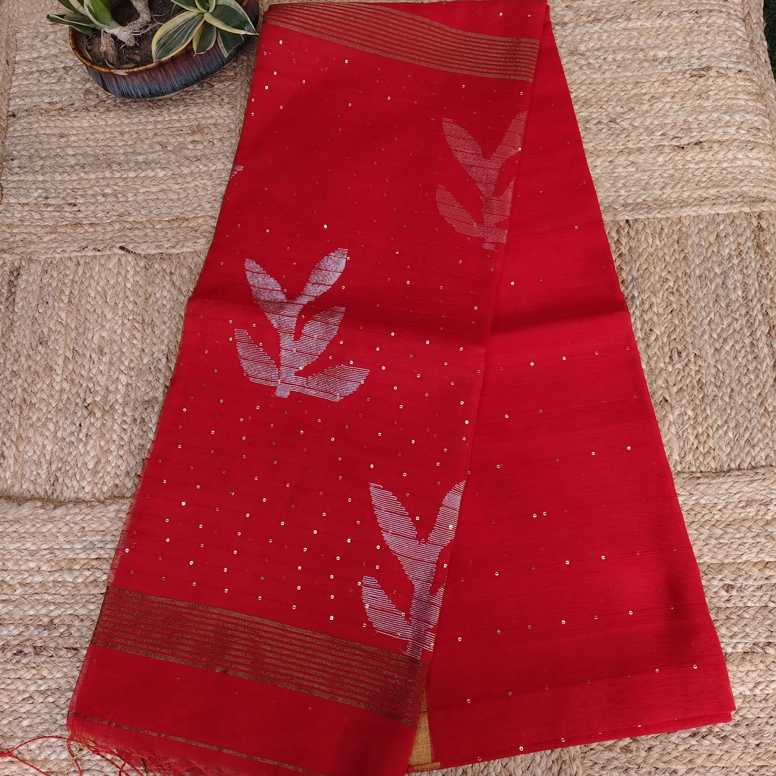 An exquisite Kora Muslin saree in a vibrant Red colour, woven with shimmering sequins across the body for a graceful glow. The anchal features striking handwoven Jamdani motifs in silver and bronze, bringing richness and grandeur to the drape.