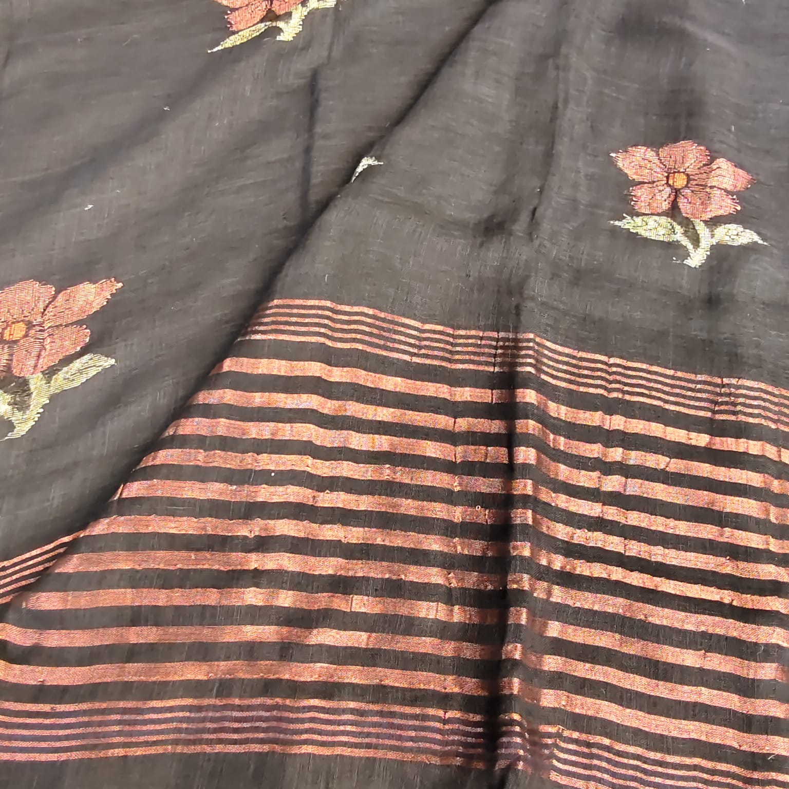 Fabric, Work & Design: Pure linen-by-linen saree in a timeless jet black shade, beautifully adorned with copper zari and thread-woven floral motifs across the body. The pallu features refined copper zari stripes, while the subtle sheen of linen adds understated elegance. Comes with an attached blouse piece.