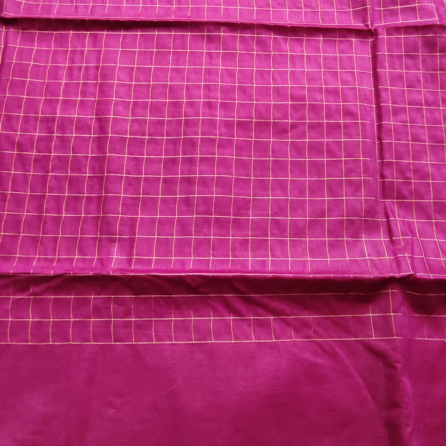Handwoven Maheshwari silk saree in a rich wine shade. The body is patterned with traditional zari checks and finished with a zari-woven border. A plain blouse piece with a zari border completes the look. -