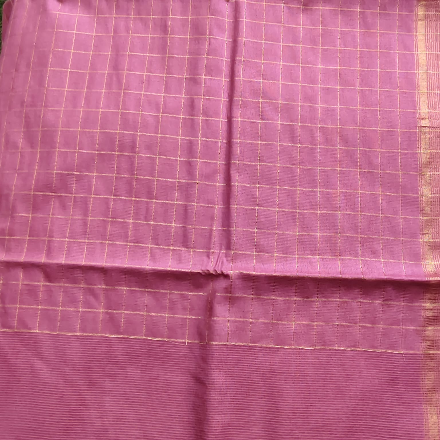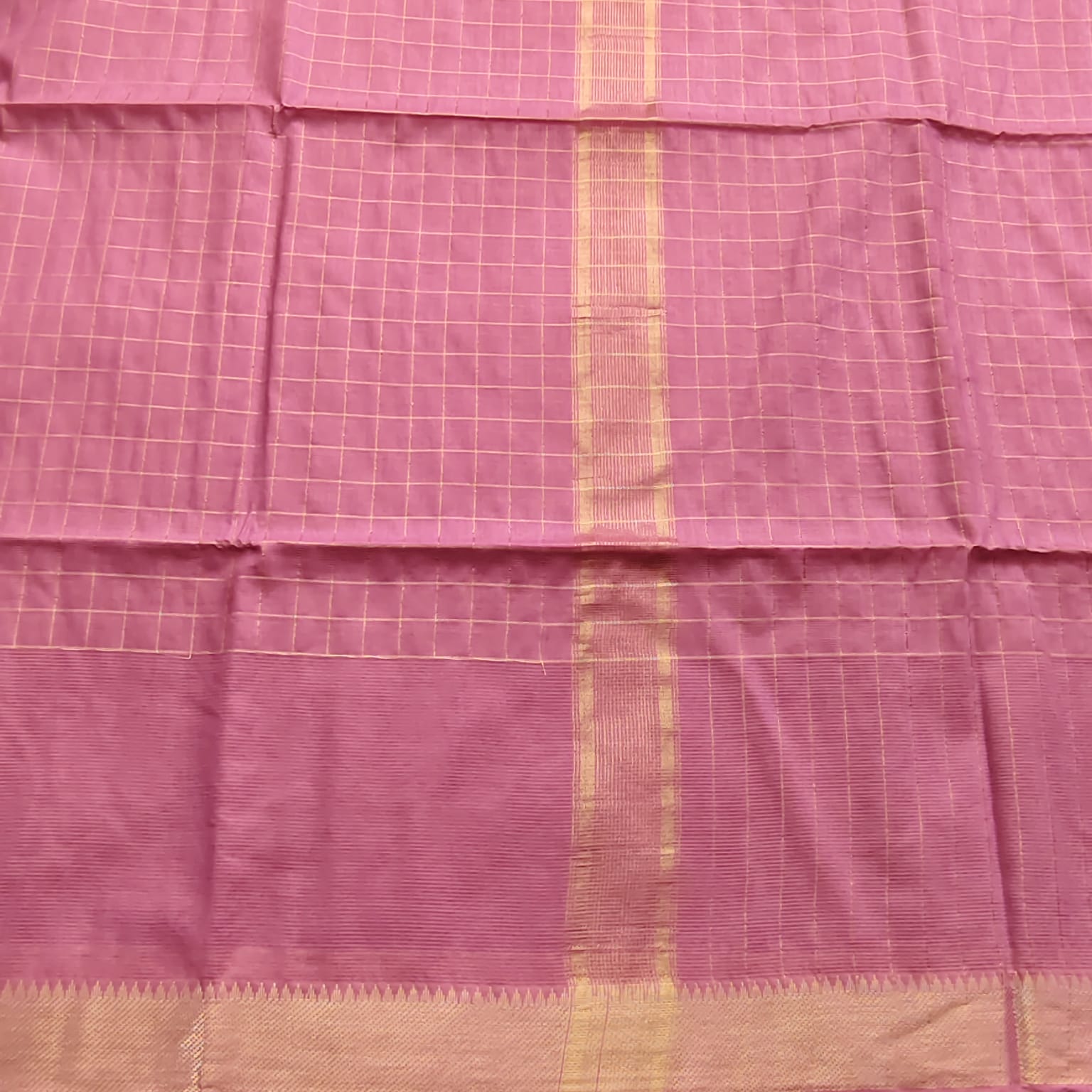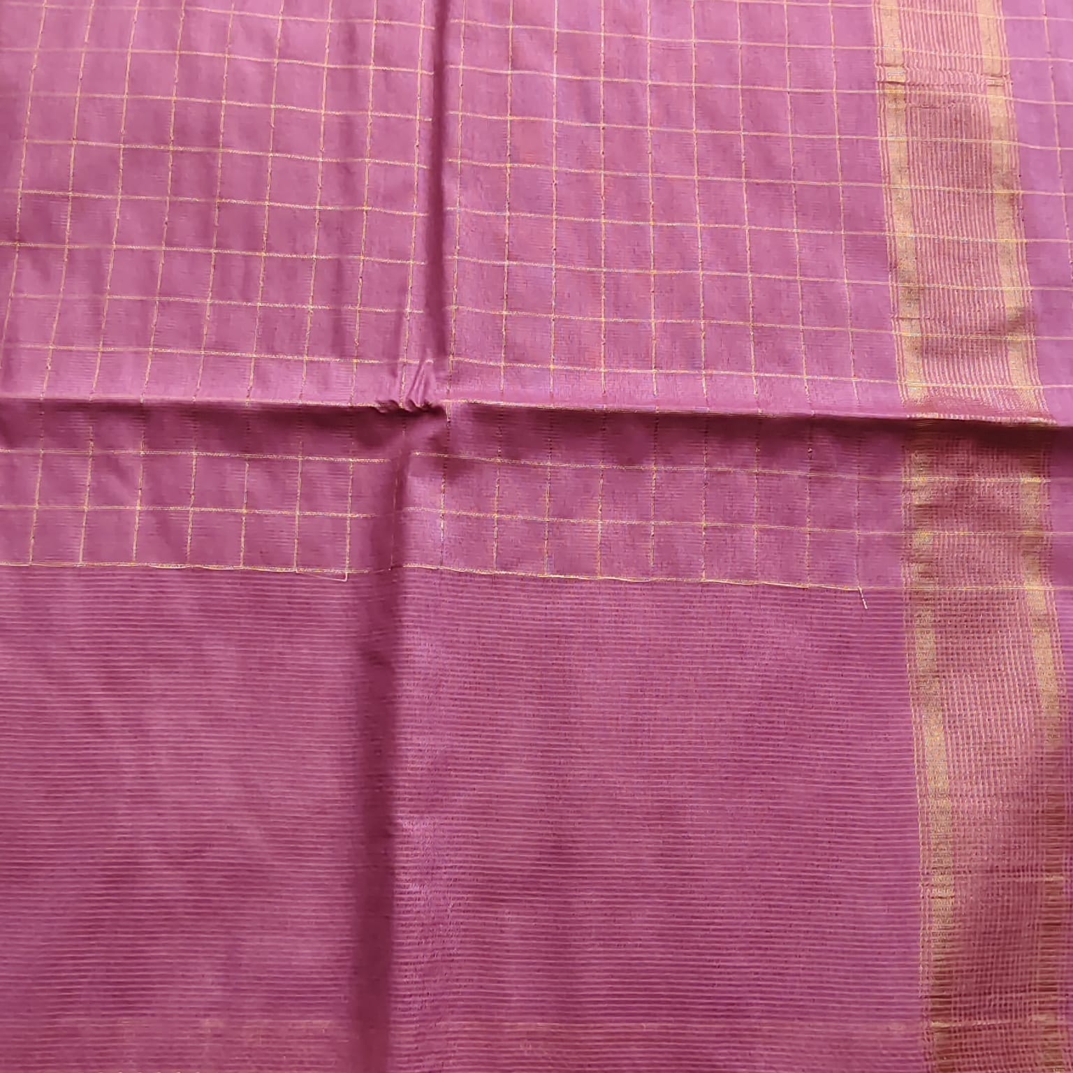 Handwoven Maheshwari silk saree in an elegant mauve shade. The body is designed with all-over zari checks, while the borders are intricately zari-woven. It is paired with a plain blouse piece highlighted with a zari border for a refined finish. -