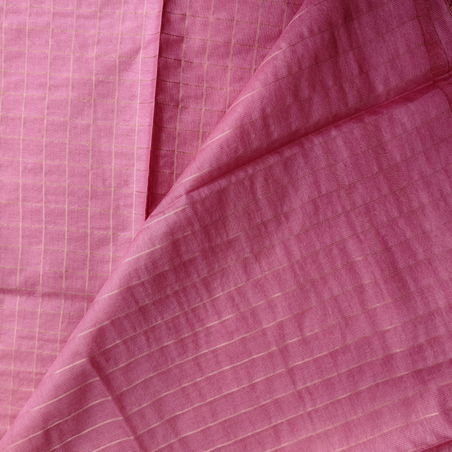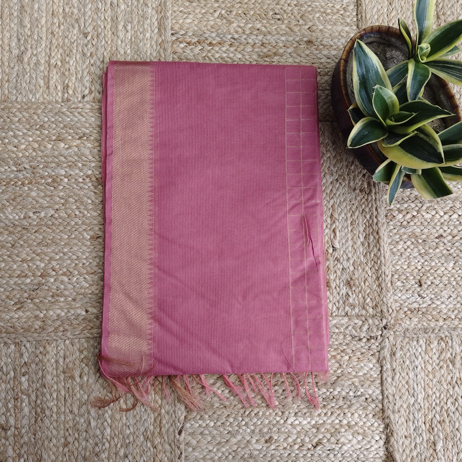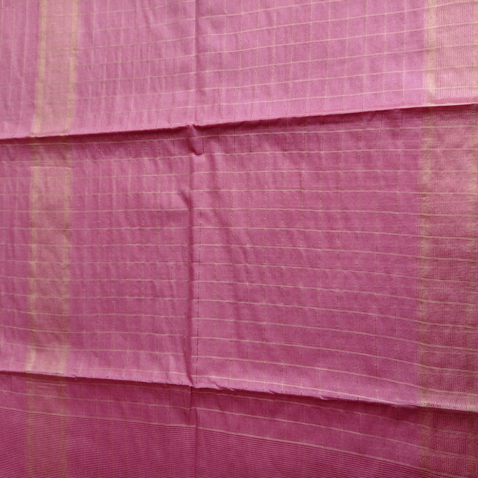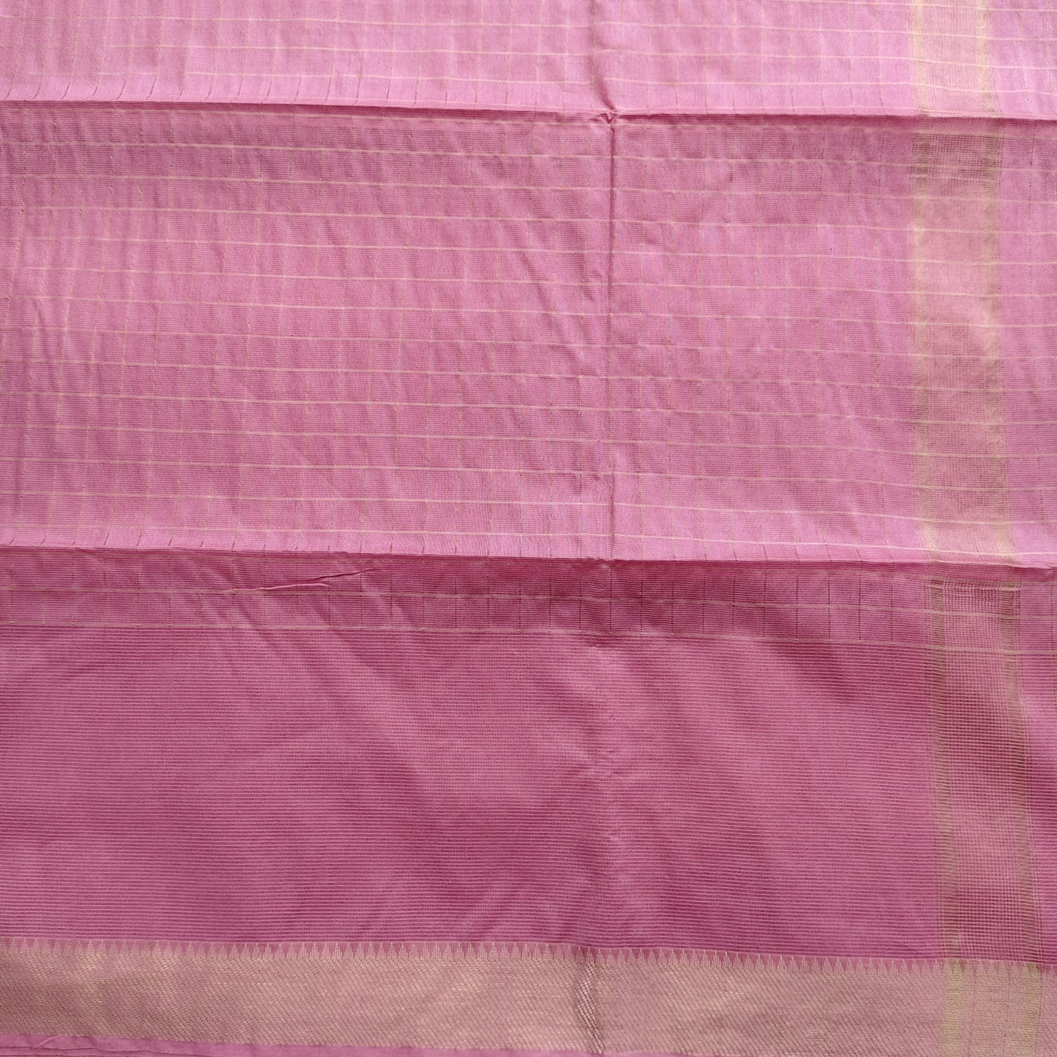 Handwoven Maheshwari silk saree in a soft onion pink shade. The body is adorned with elegant zari checks, complemented by a zari-woven border. It comes with a plain blouse piece, finished with a zari border for a refined look. -