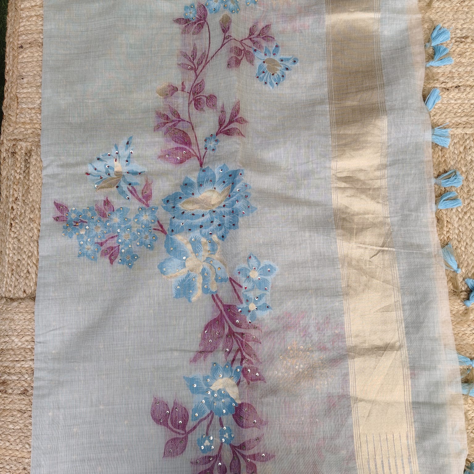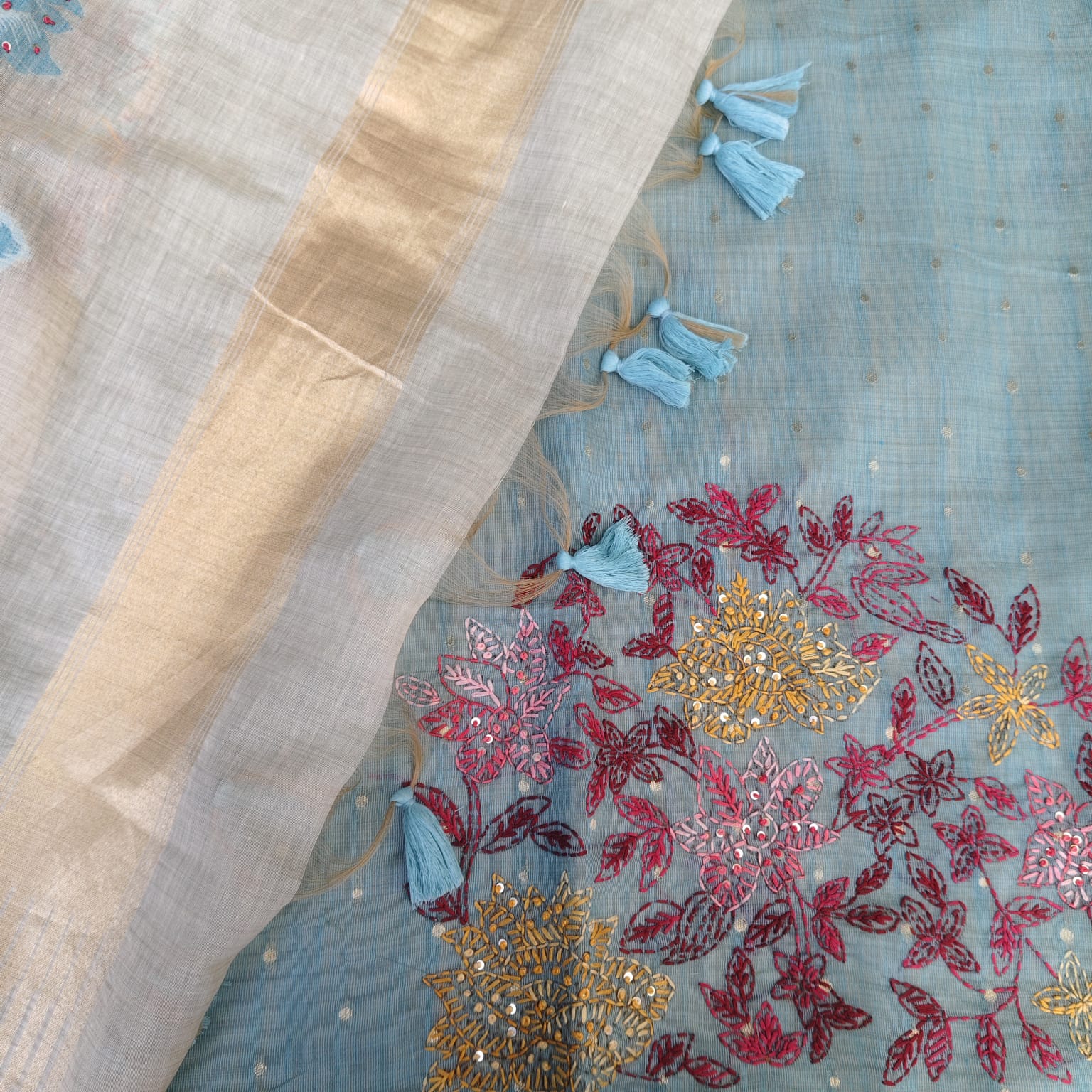 A unique handwoven munga silk saree in a rich tussar base, featuring large floral Jamdani motifs highlighted with hand knot stitch and katha embroidery. The saree is complemented with a subtle zari-woven light border. The contrast ice blue jacquard blouse piece is heavily hand-embroidered with katha stitch and knotwork, enhancing the saree’s sophistication and exclusivity.