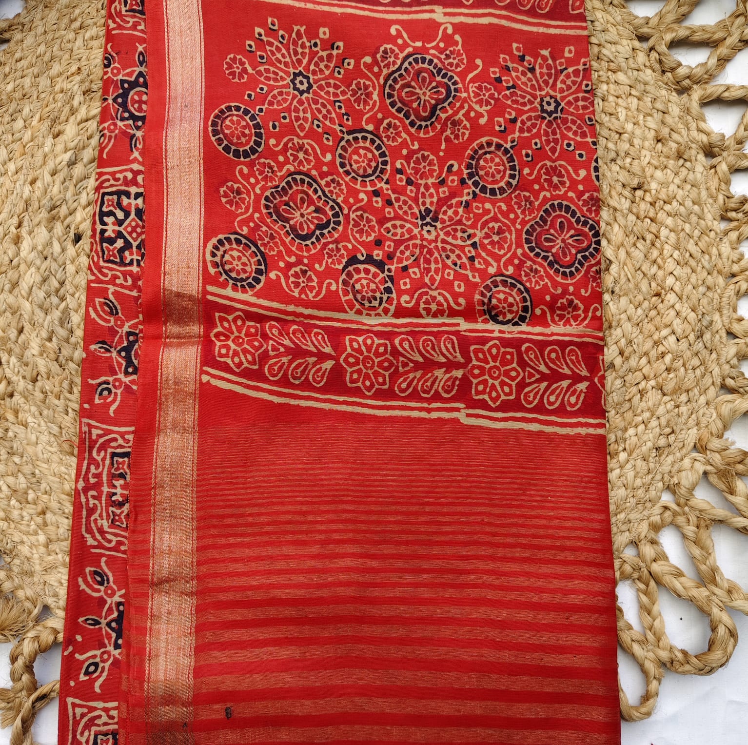 Fabric, Work & Design: Maheshwari silk saree in a vibrant brick red shade, featuring bold Ajrakh prints, a sleek zari border, and elegant zari stripes on the pallu that enhance its richness. Lightweight with a graceful drape, combining traditional artistry with contemporary appeal.