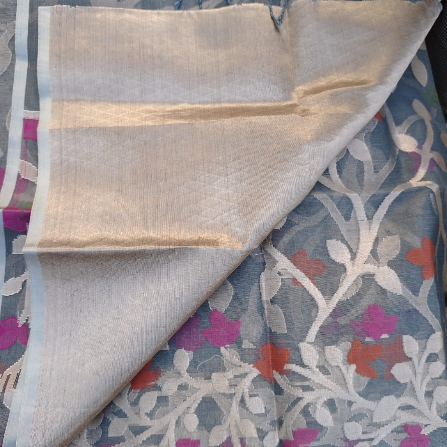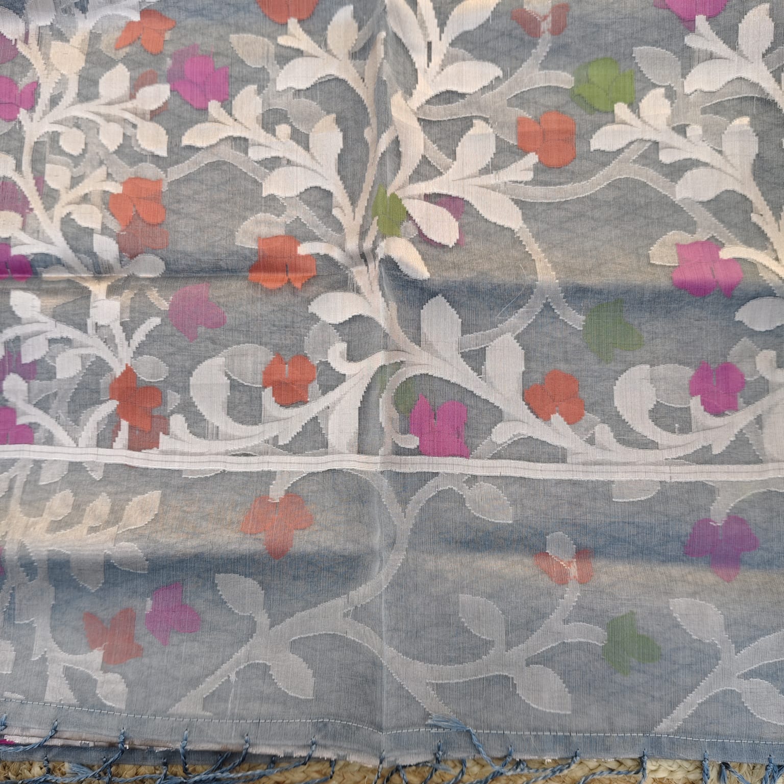 This Grey organza–muslin blend saree features a rich yet lightweight drape with a soft, elegant sheen. It is adorned with all-over Jamdani work, intricately woven using zari and multicoloured threads, adding depth and detail to the weave. The saree balances visual richness with comfort, making it refined and graceful.