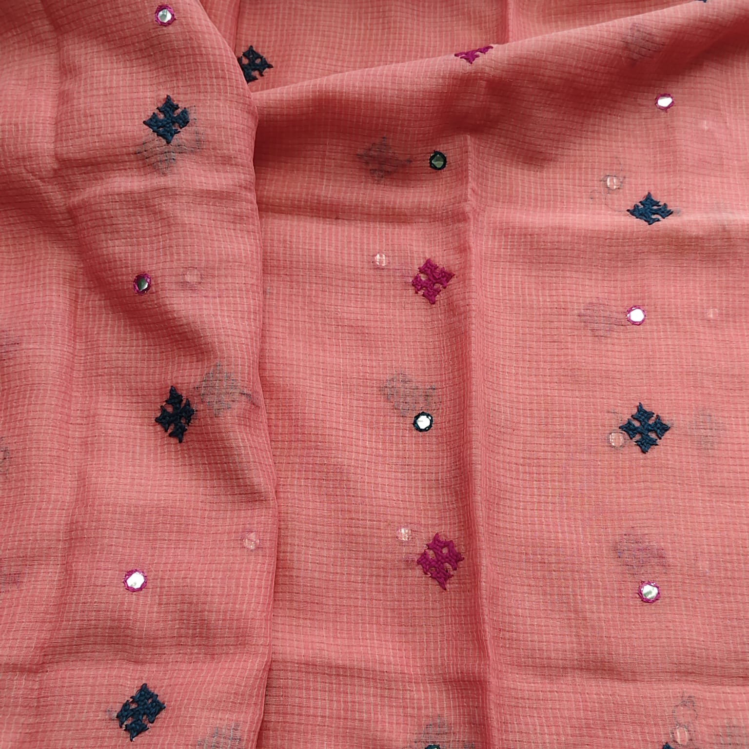A luxurious Resham kota Saree in a delicate powder pink shade, crafted from soft, flowing fabric. The saree features intricate handwork with Kutchh work and real mirror work, beautifully covering the border and body. Every detail reflects meticulous craftsmanship, making it a truly elegant and festive piece. -