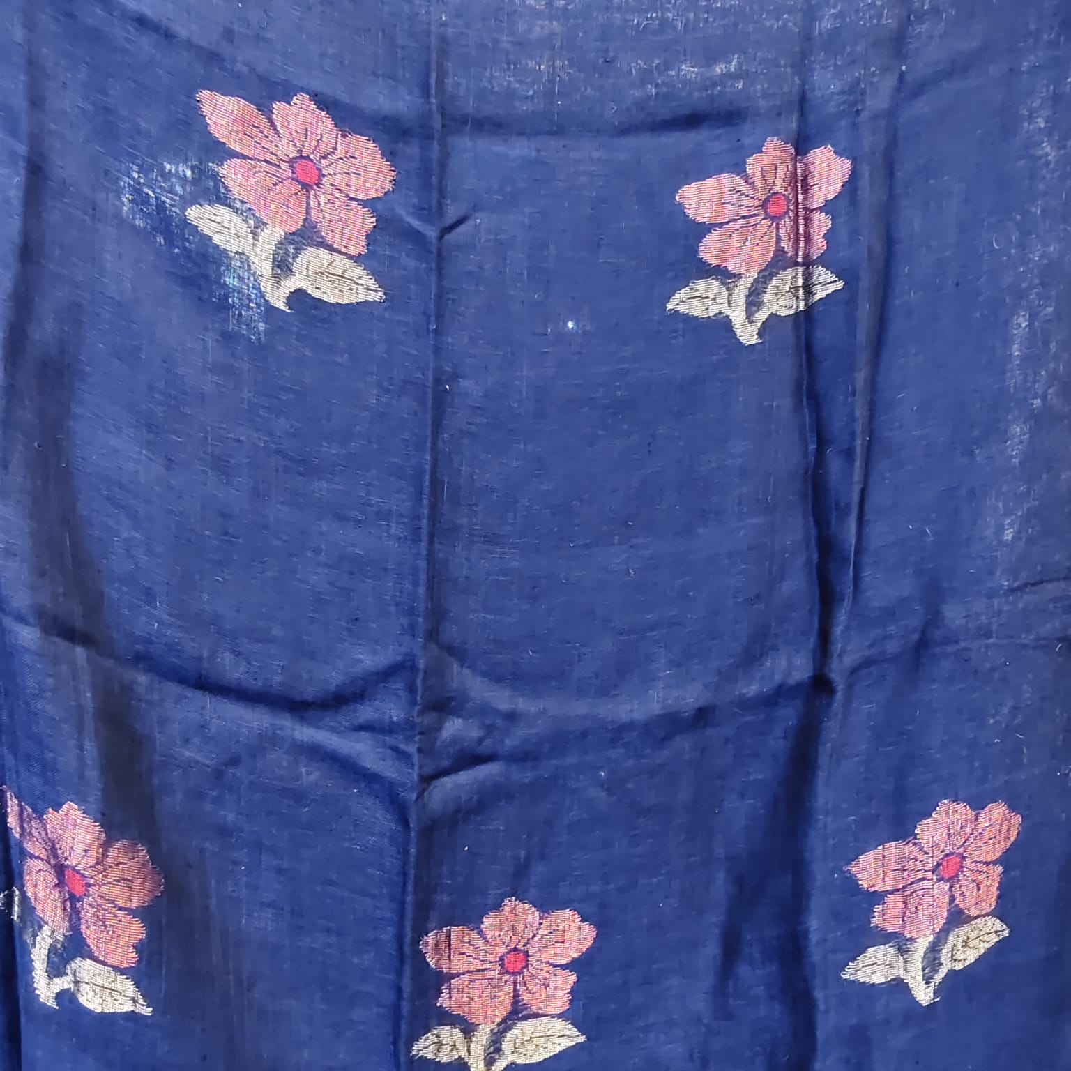 Fabric, Work & Design: Pure linen-by-linen saree in a deep midnight blue shade, exquisitely detailed with copper zari and thread-woven floral motifs across the body. The pallu is enhanced with graceful copper zari stripes, creating a refined and timeless appeal. Comes with an attached blouse piece.