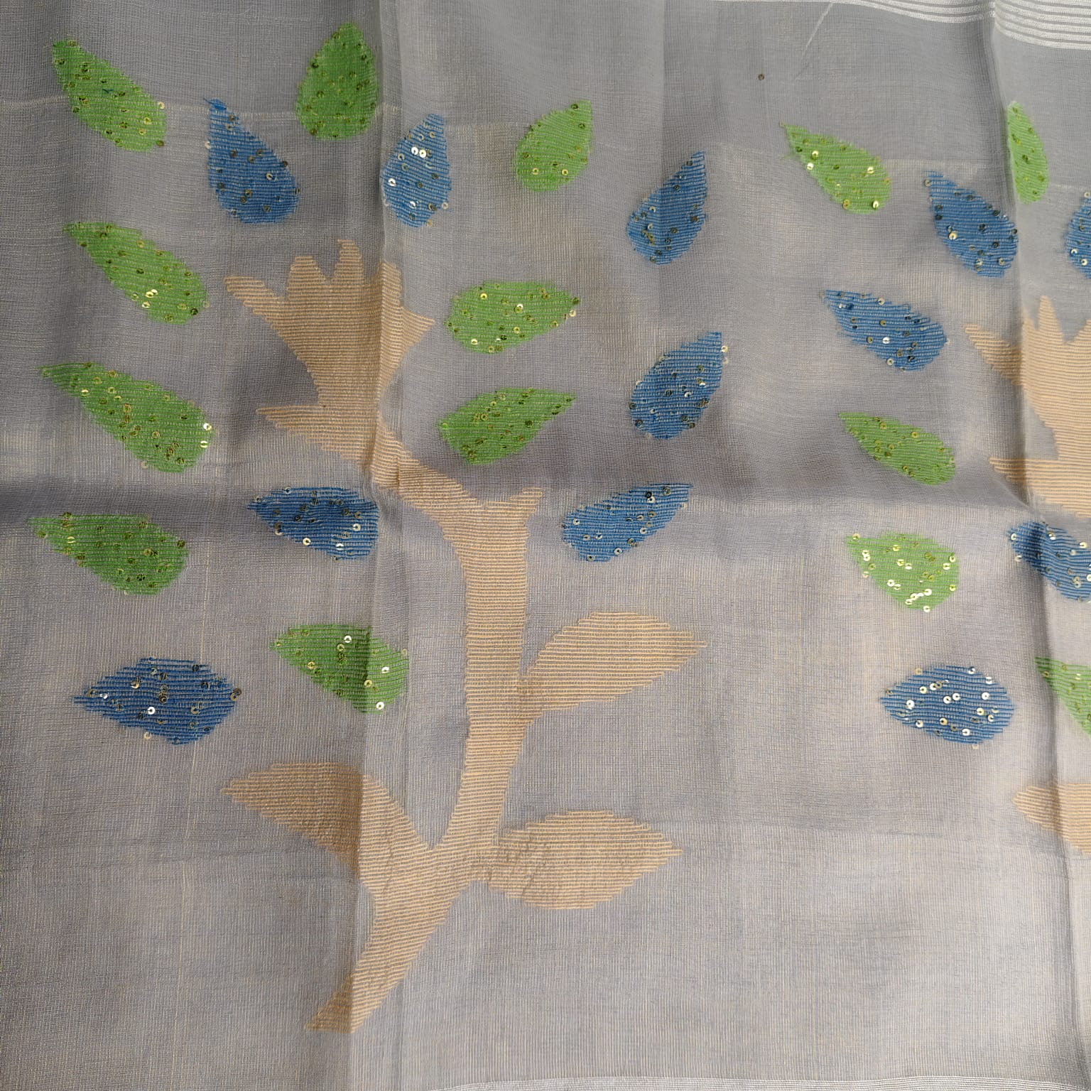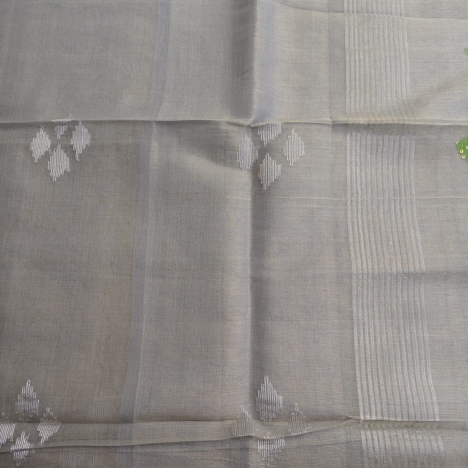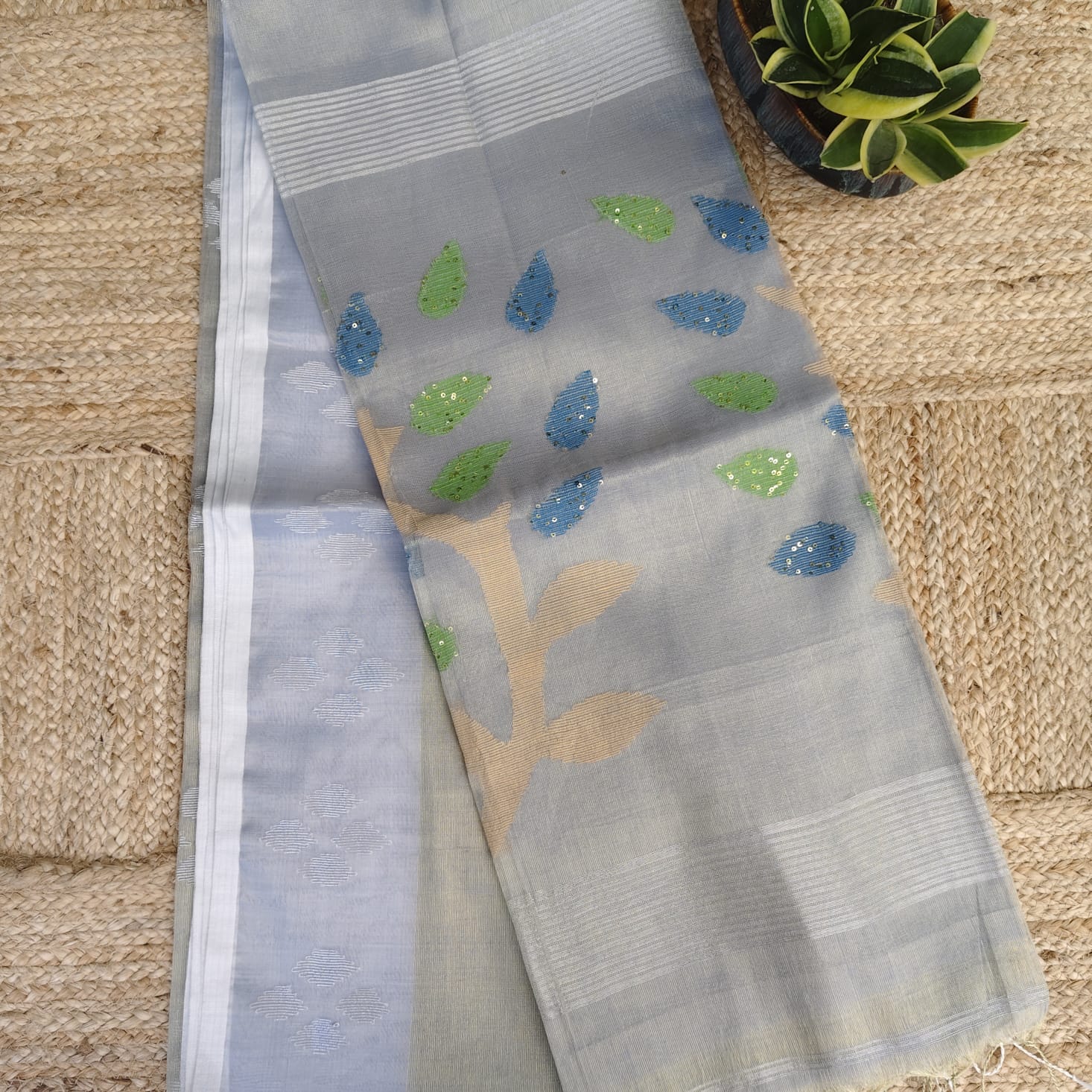 Fabric, Work & Design: This handwoven tissue muslin jamdani saree in a graceful grey tone, enhanced with a natural golden sheen unique to tissue fabric. Finished with a soft greyish-blue solid border, the saree is adorned with delicate thread Jamdani weaving across the body. The aanchal is further elevated with vibrant Jamdani motifs highlighted with subtle sequins, lending it a refined yet festive appeal. Comes with an attached blouse piece.