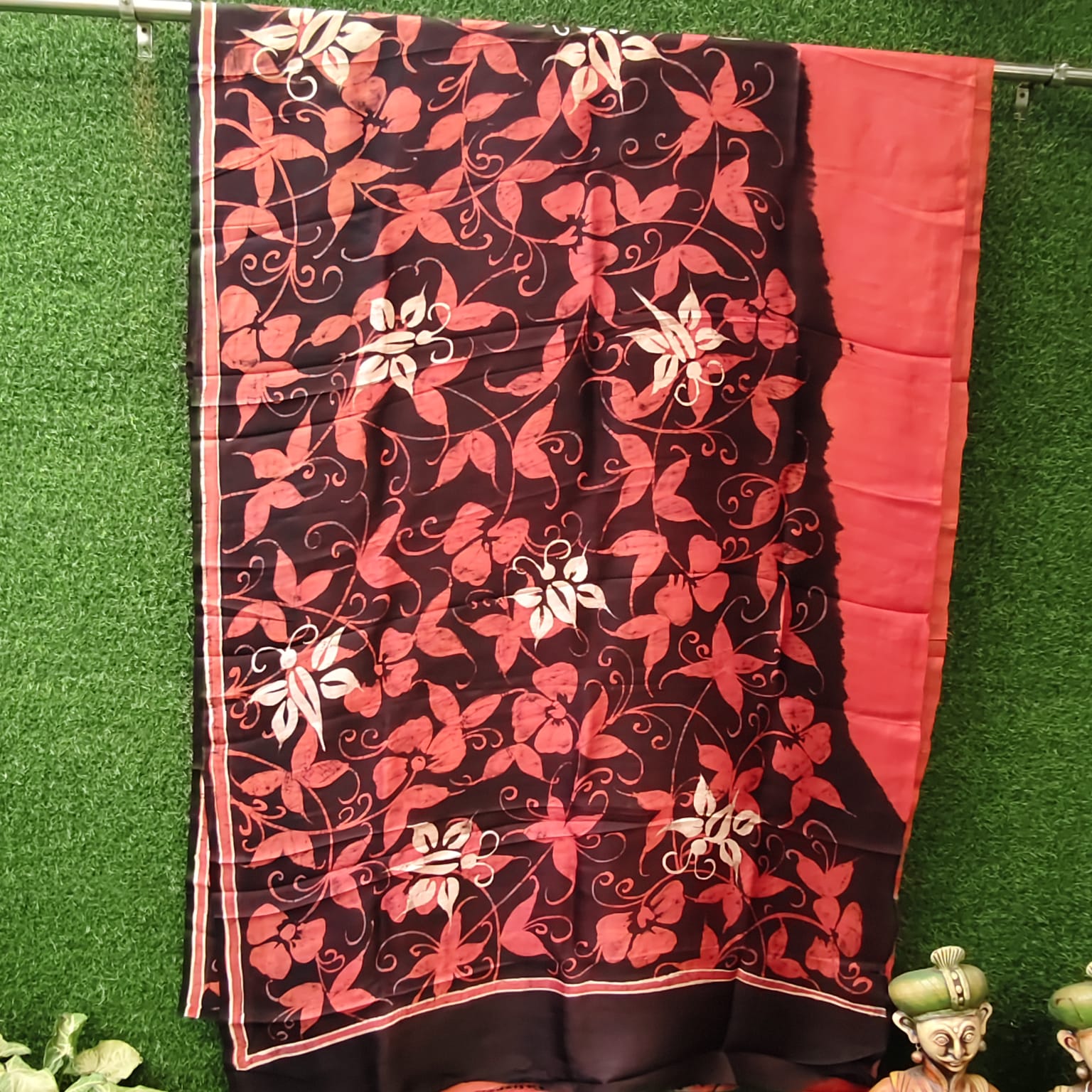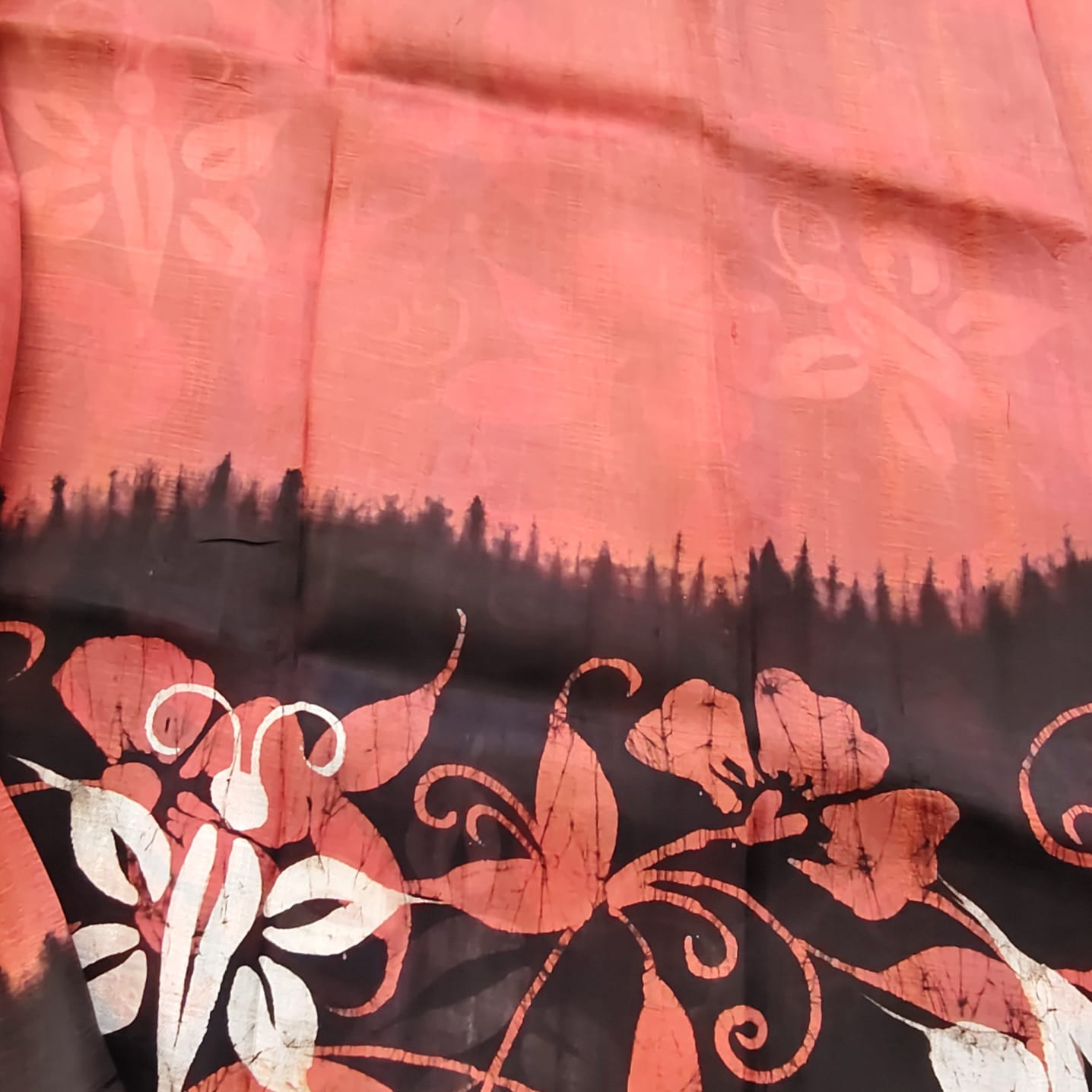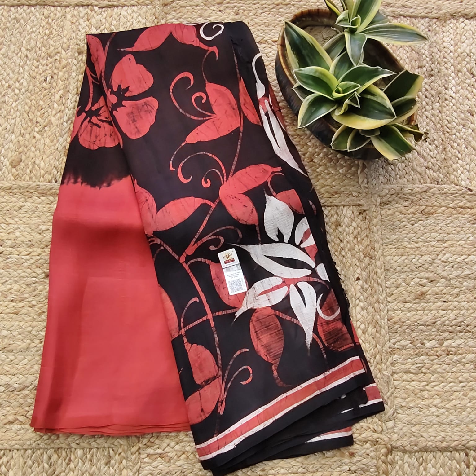 Fabric, Work & Design: Silk Mark Certified pure silk saree in a luxurious rust shade, beautifully contrasted with bold black hand-waxed batik motifs. The natural sheen of pure silk combined with the intricate artistry of batik makes this saree a true statement of elegance and exclusivity. Comes with a matching blouse piece.