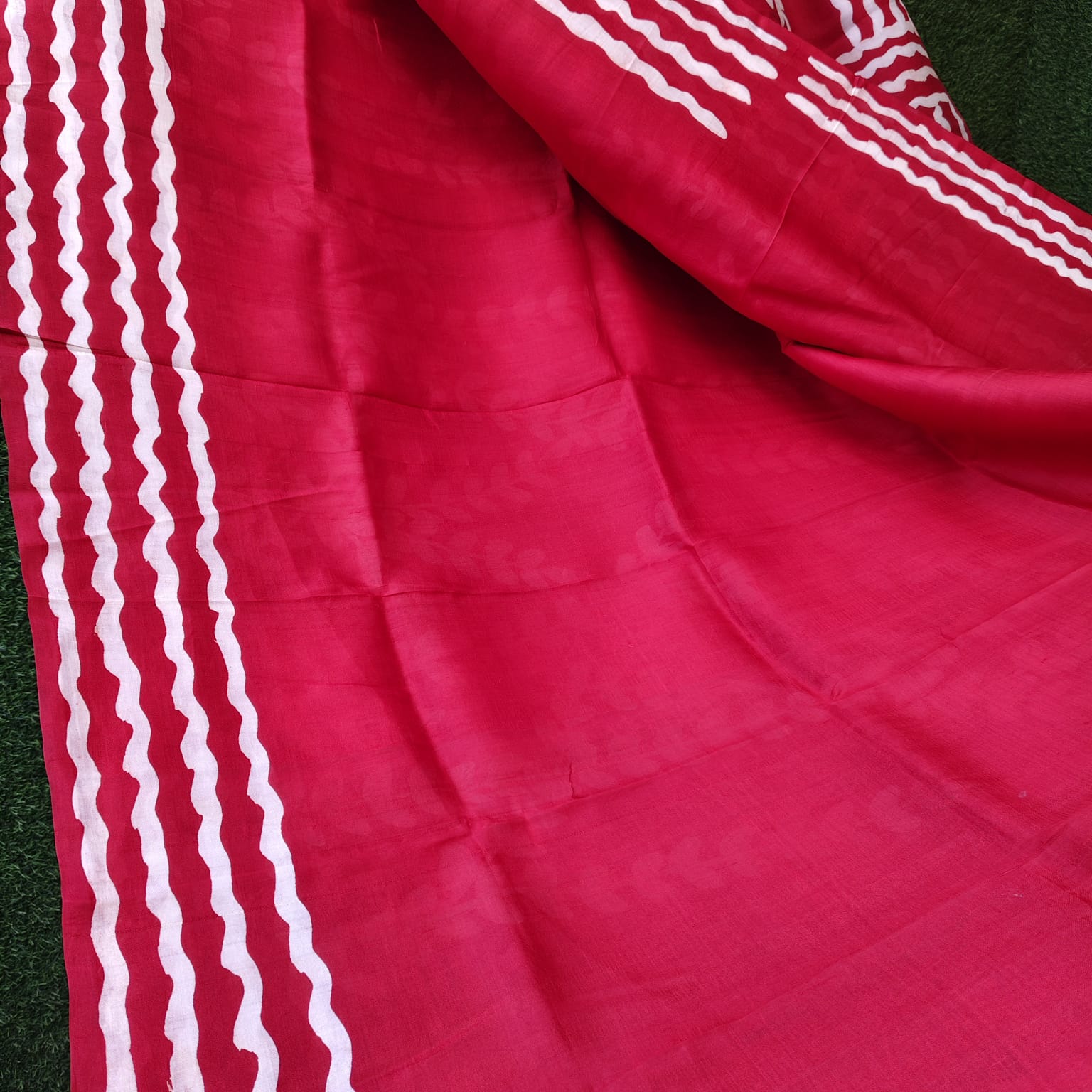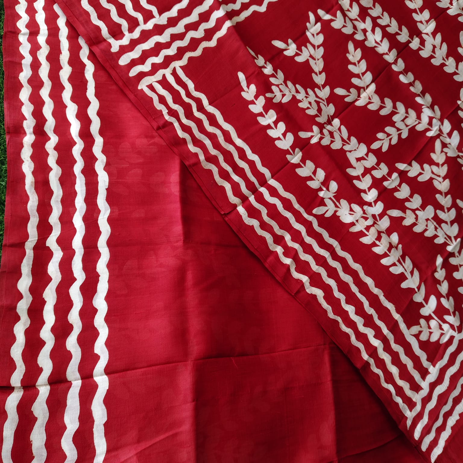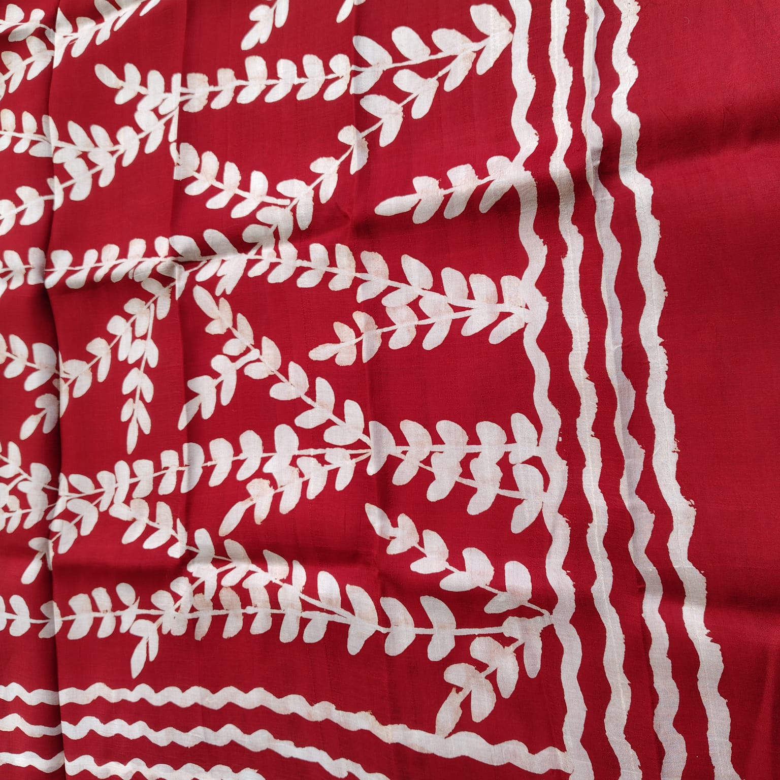 Fabric, Work & Design: Pure silk saree in a striking bright red hue, accentuated with bold white hand wax batik motifs. Certified with the Silk Mark, this saree ensures authenticity, quality, and timeless luxury. The smooth drape and natural sheen of silk elevate its regal charm.